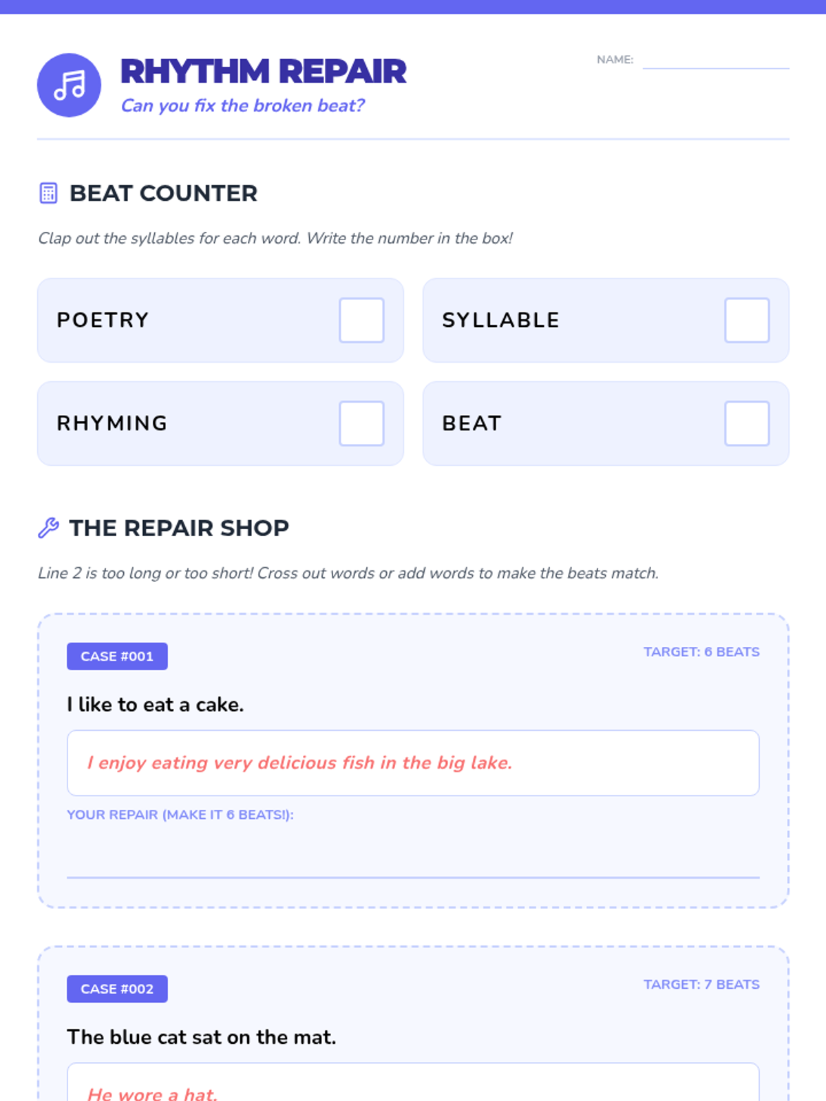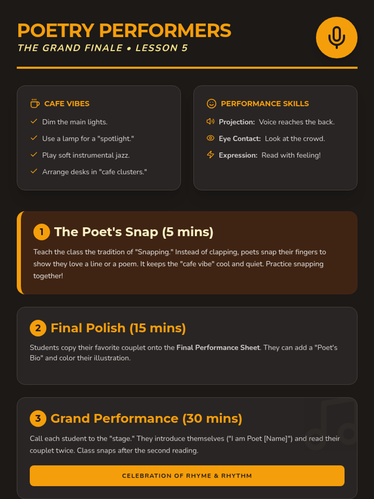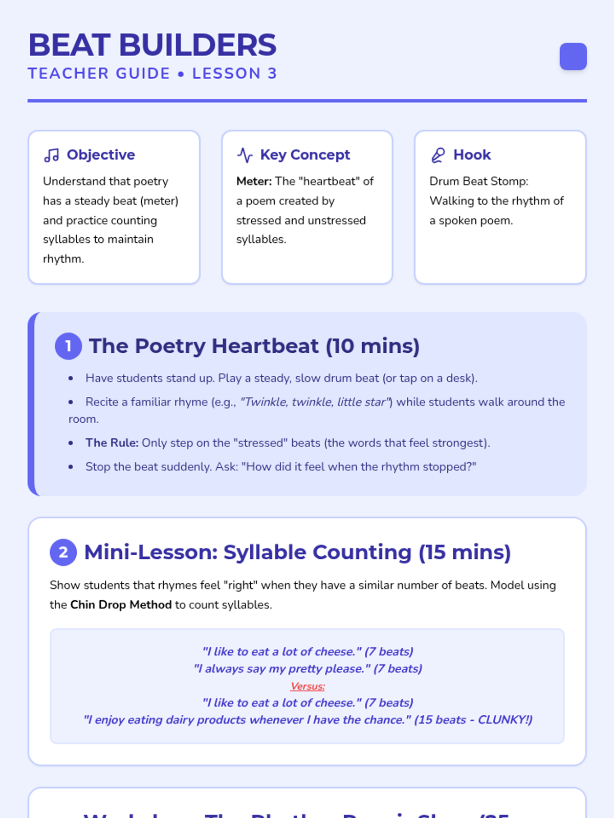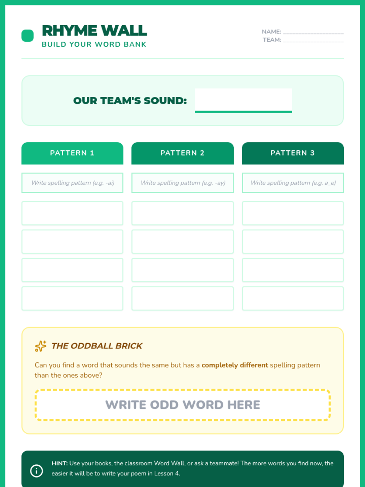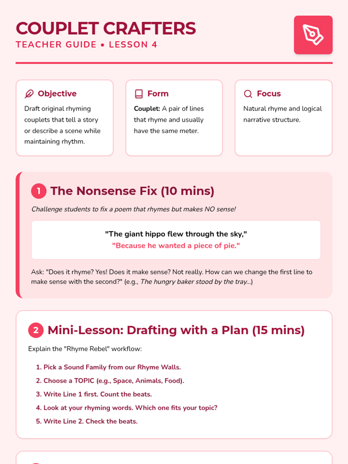 This sequence transitions 2nd-grade students from auditory rhyme recognition to creative written expression. Students explore phonics through poetry, focus on complex spelling patterns (vowel teams), and master the rhythm of language through a workshop approach, culminating in a performance task.