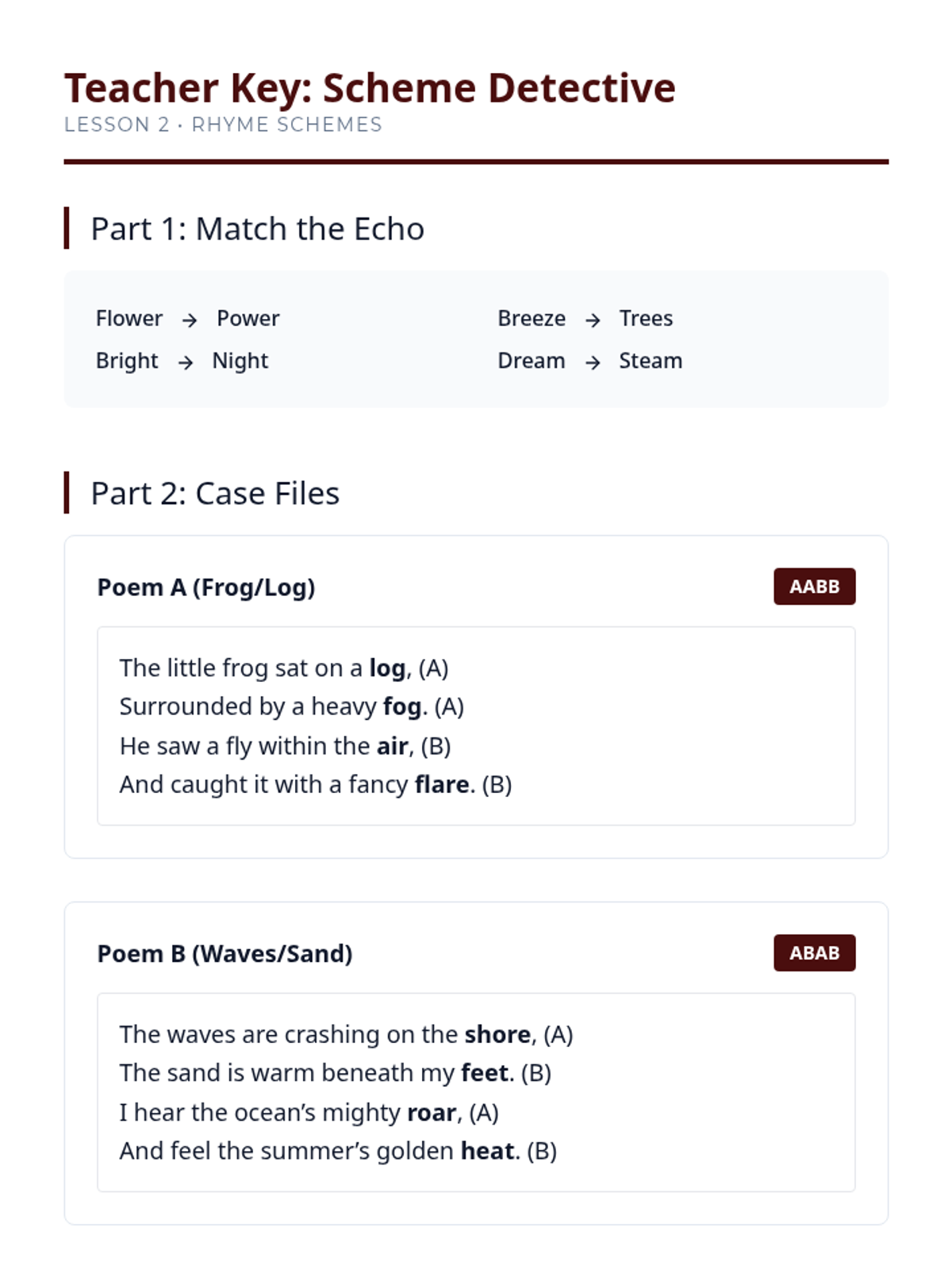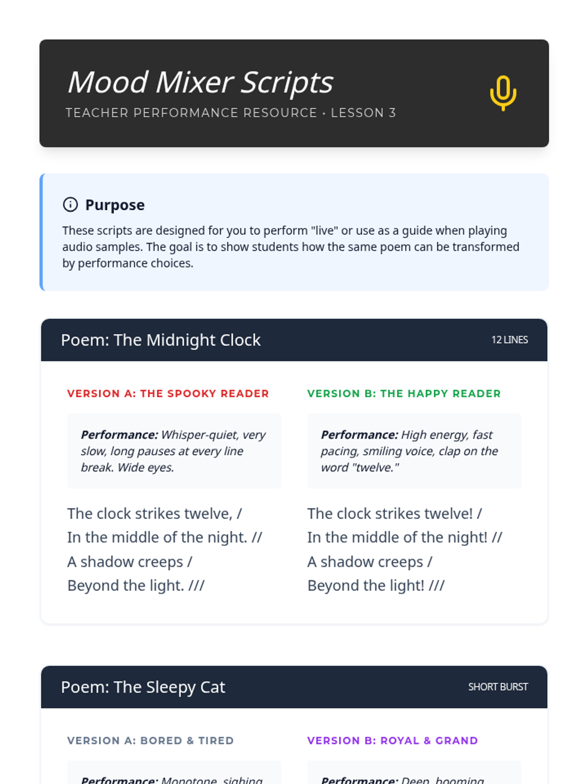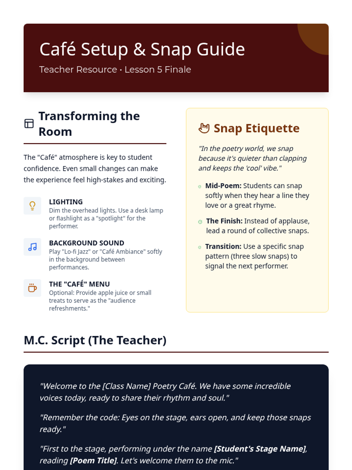 A 3rd-grade ELA sequence focused on rhythm, rhyme, and performance in poetry. Students learn to analyze the auditory elements of poems and perform them in a 'Poetry Cafe' setting.