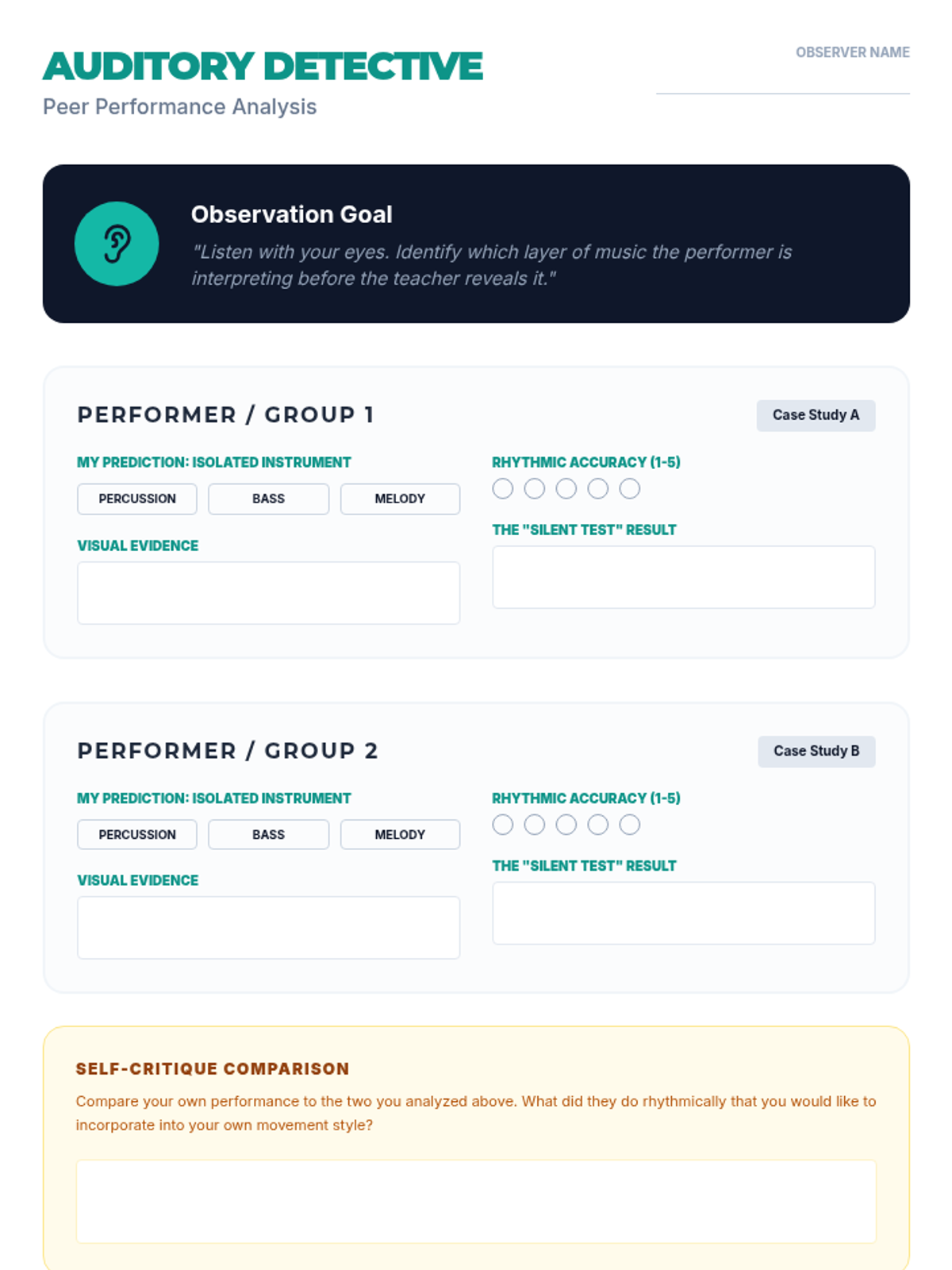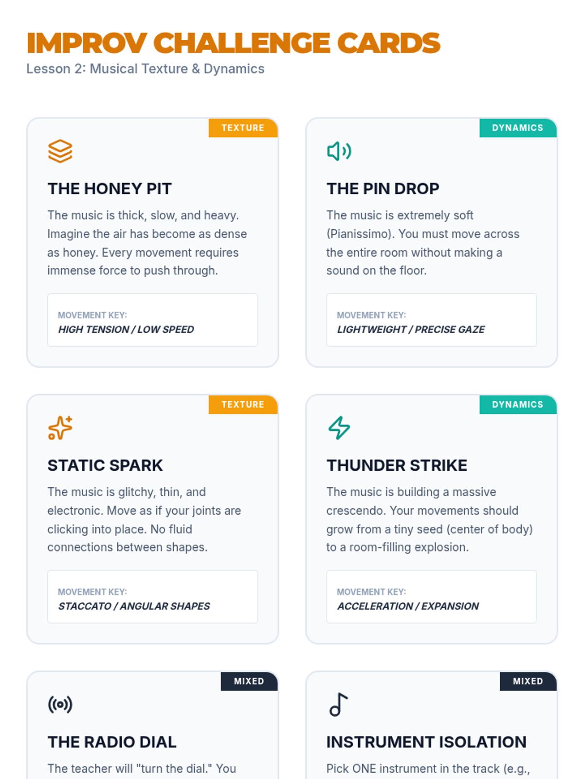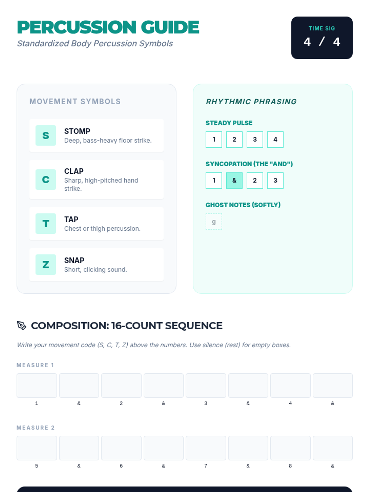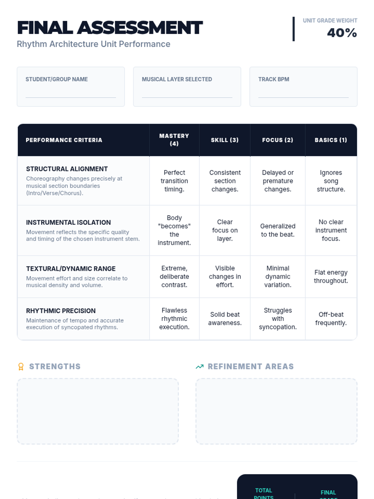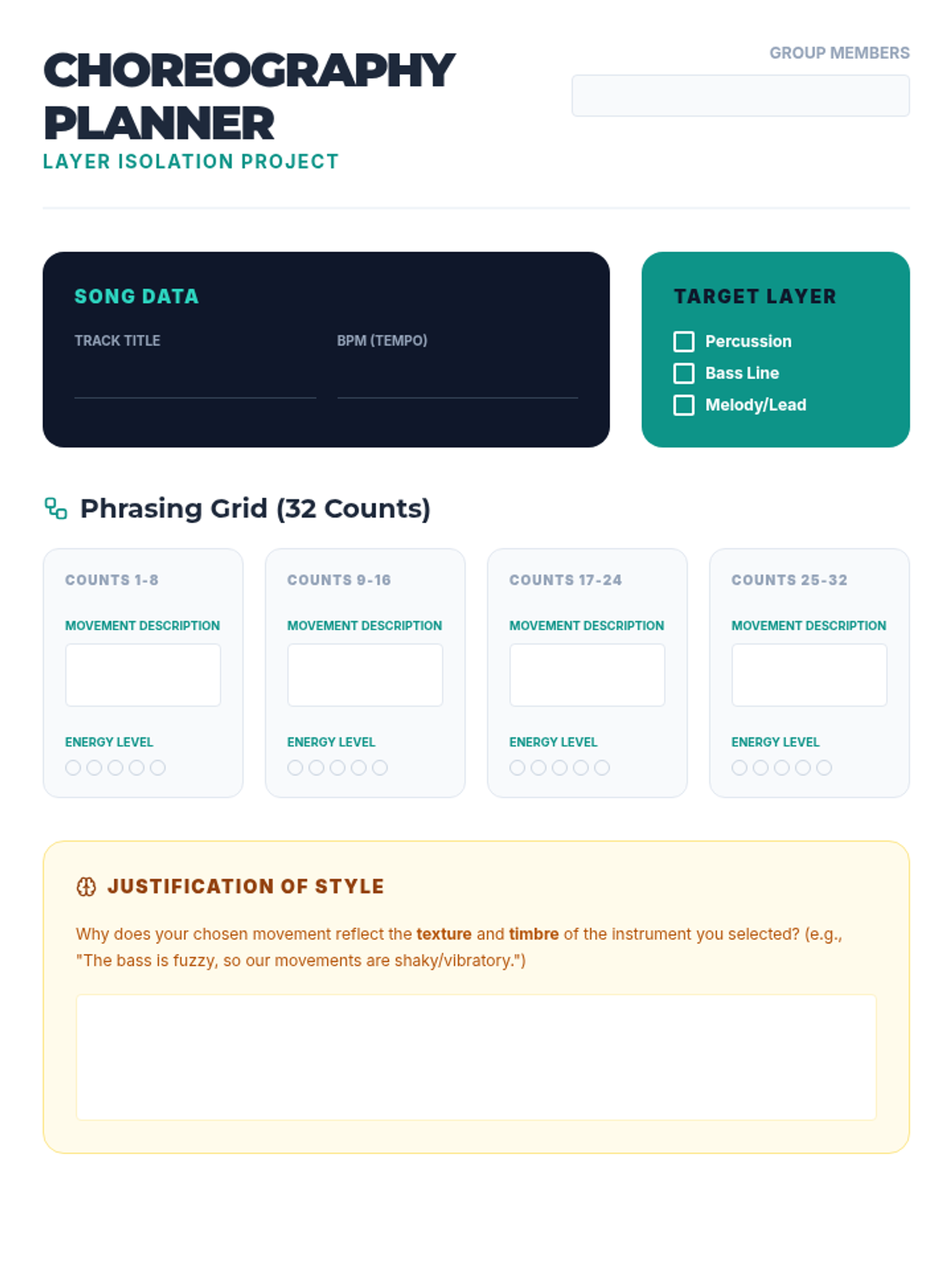 A comprehensive unit for 10th-grade PE students to explore the relationship between musical architecture and dance. Students progress from analyzing song structures to creating complex choreography based on specific instrumental layers and rhythmic textures.