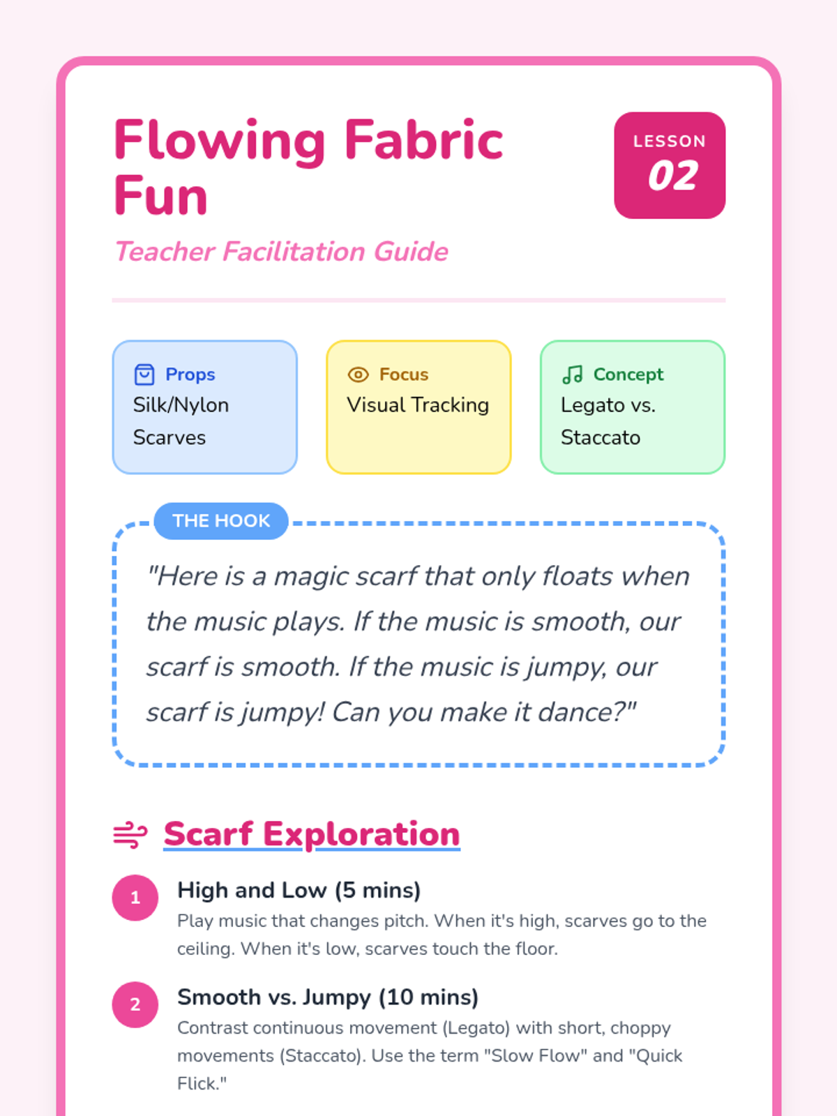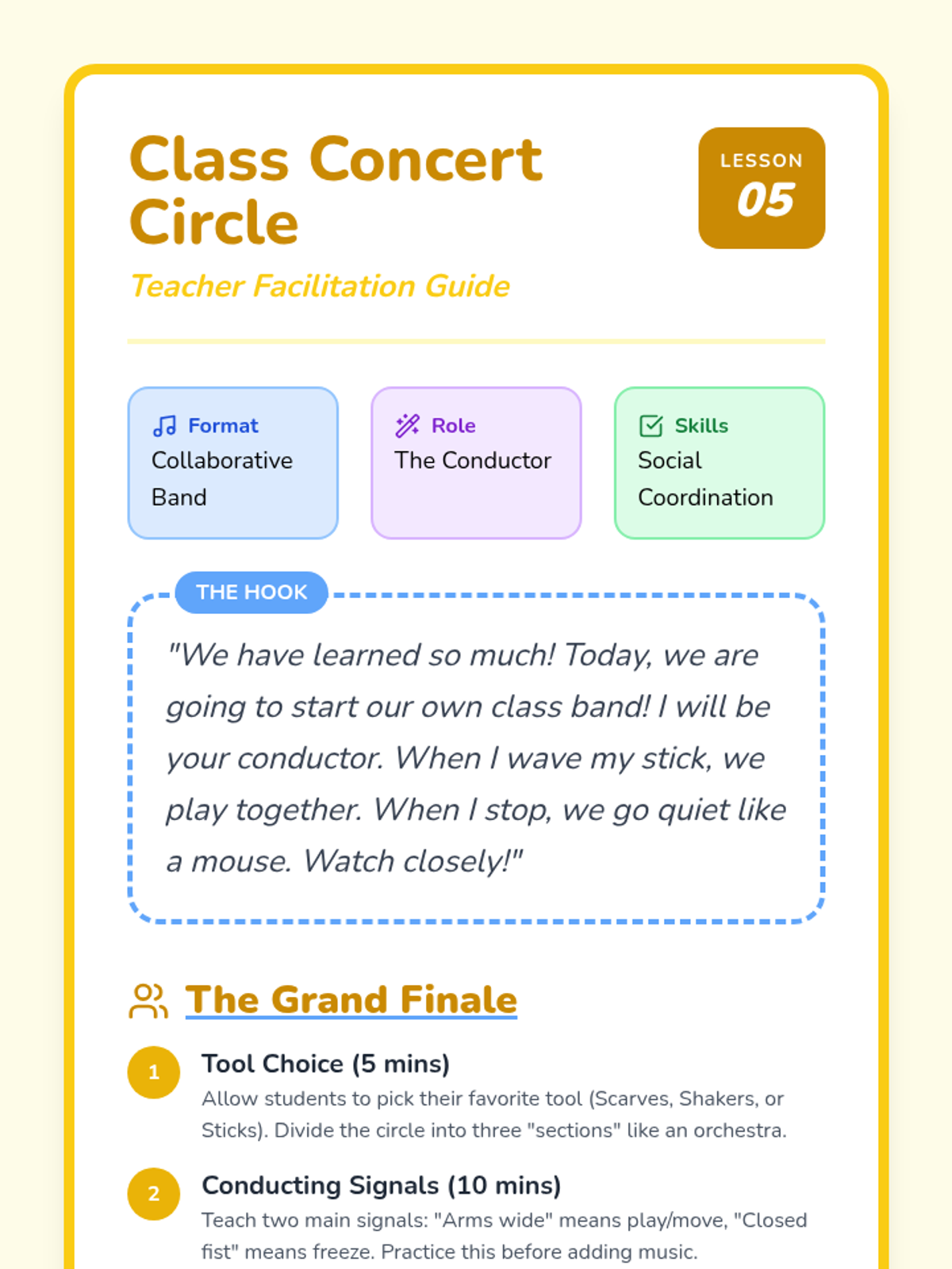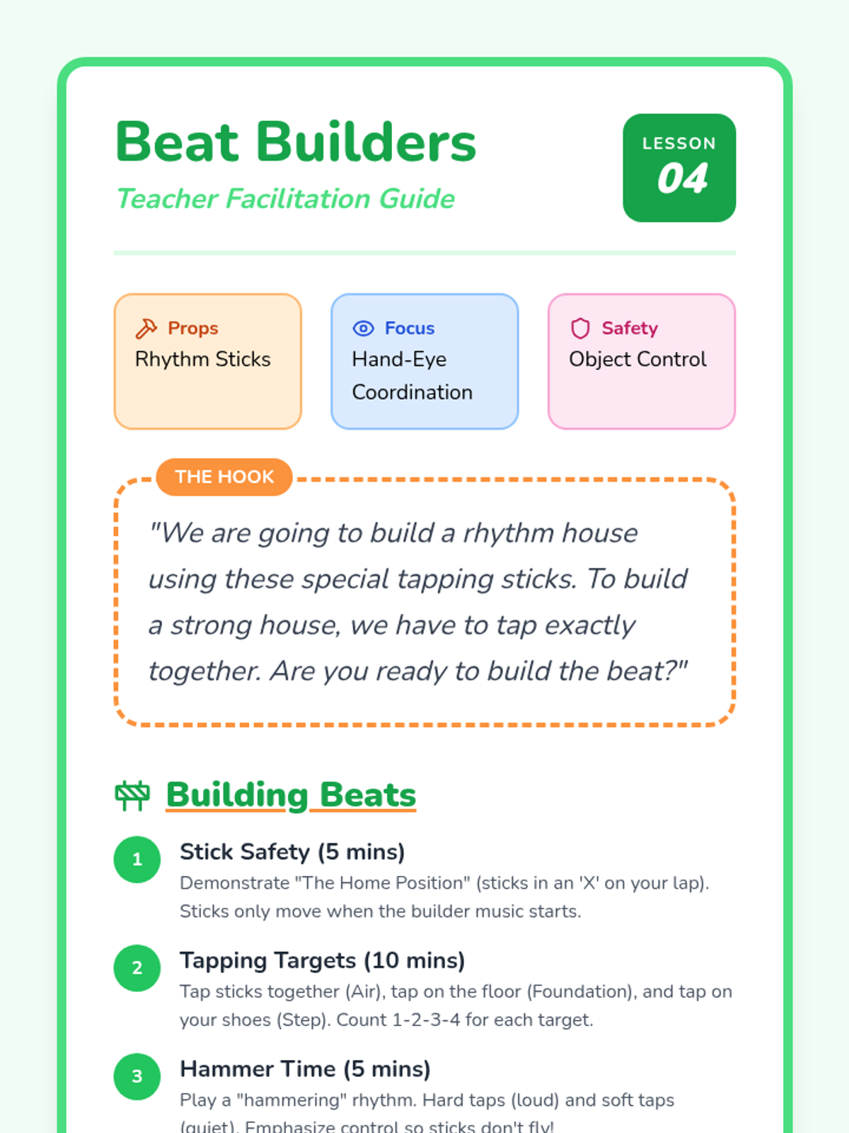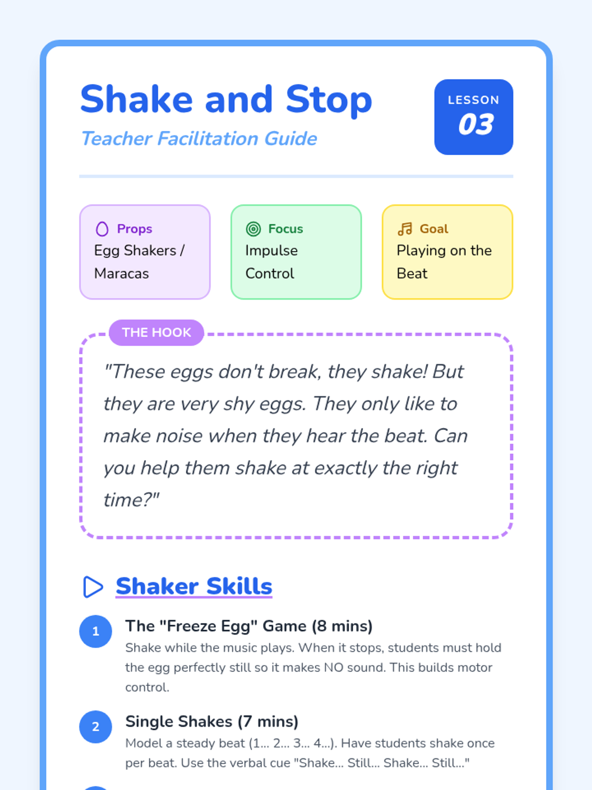 This sequence introduces Pre-K students to rhythm and timing through a progression of body percussion, scarves, shakers, and rhythm sticks, culminating in a collaborative ensemble experience. Students build motor skills, spatial awareness, and auditory processing as they learn to synchronize movement with music.
