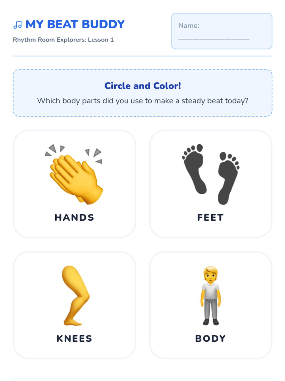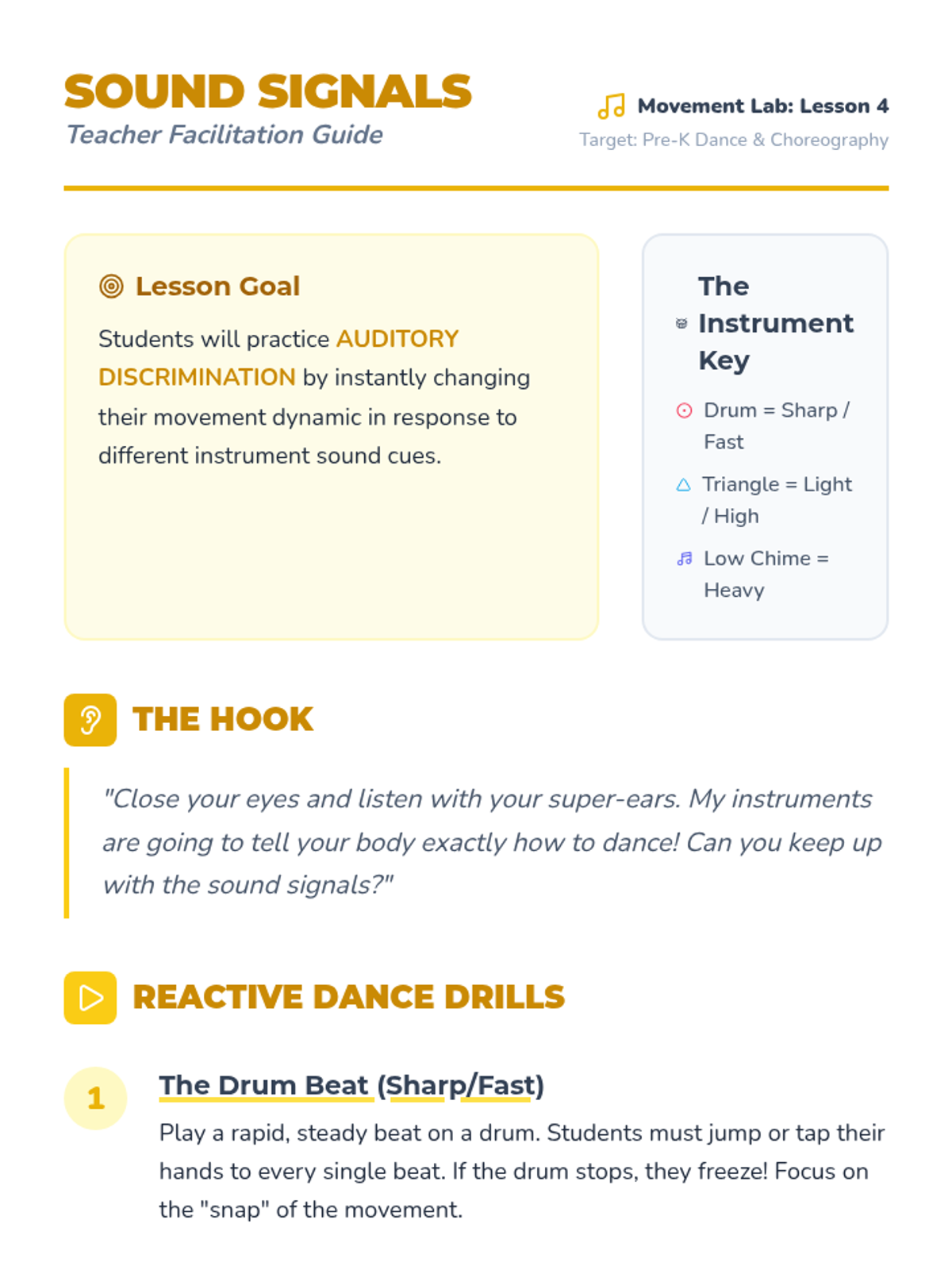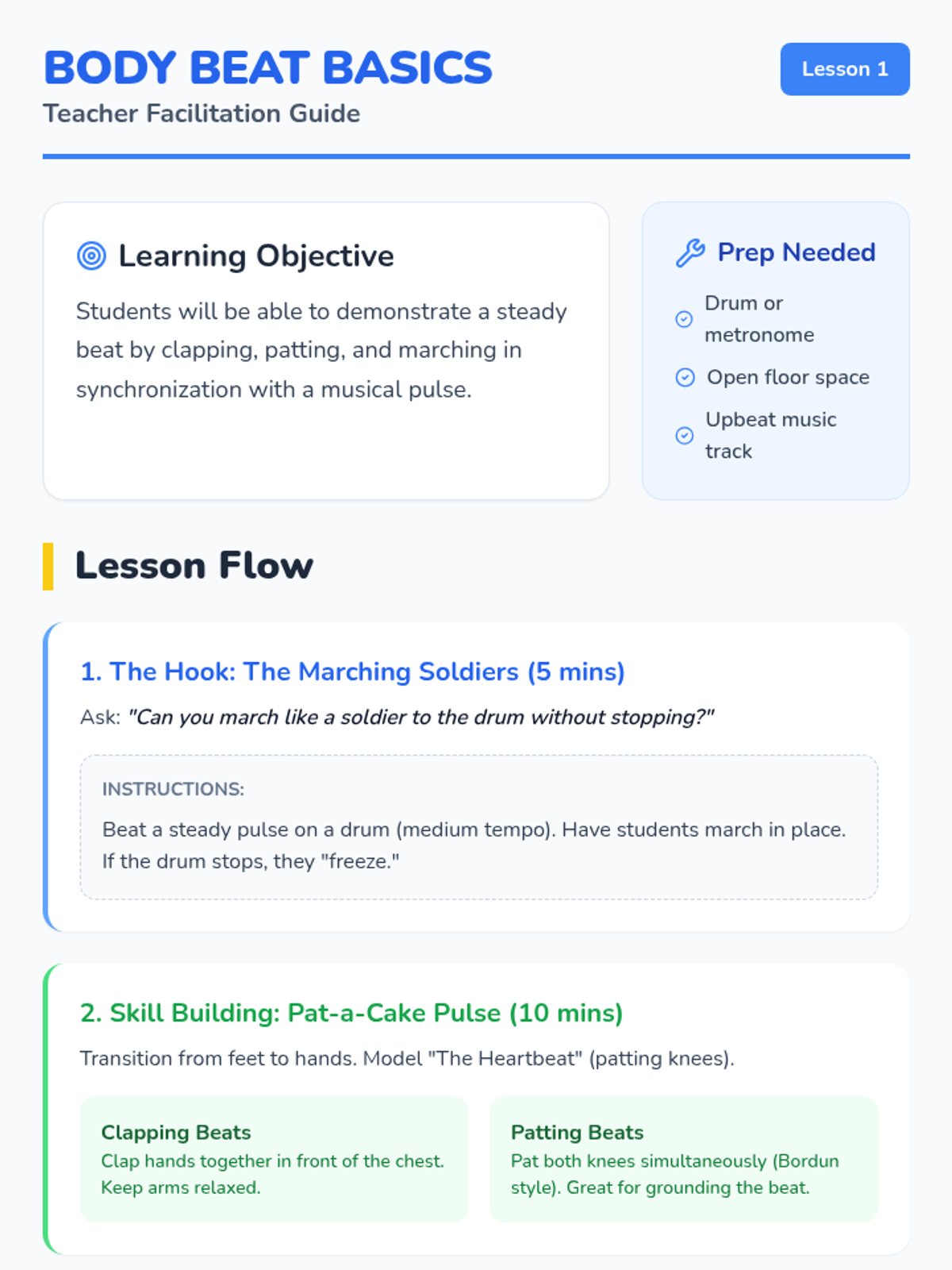 A 5-lesson sequence for Pre-K students to develop foundational motor skills, listening habits, and rhythmic accuracy through body percussion and unpitched instruments. Students progress from internalizing a beat to following ensemble cues.