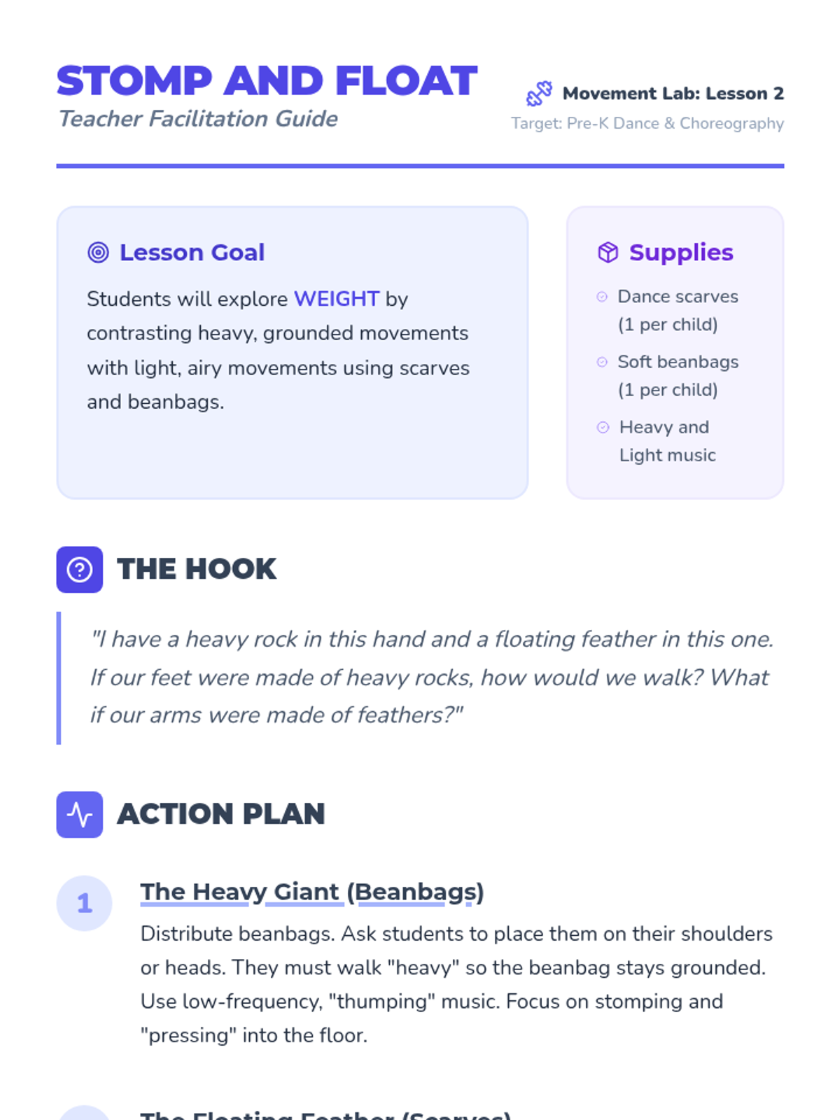 This Pre-K dance sequence explores how students can use their bodies to tell stories and express emotions. Students move from identifying feelings and simple actions to choreographed nature cycles and character studies, culminating in a collaborative narrative dance performance.