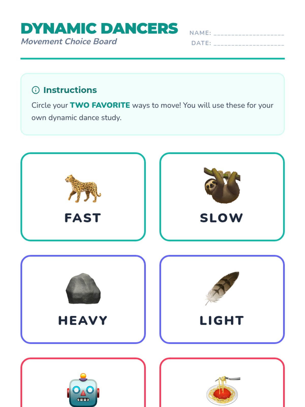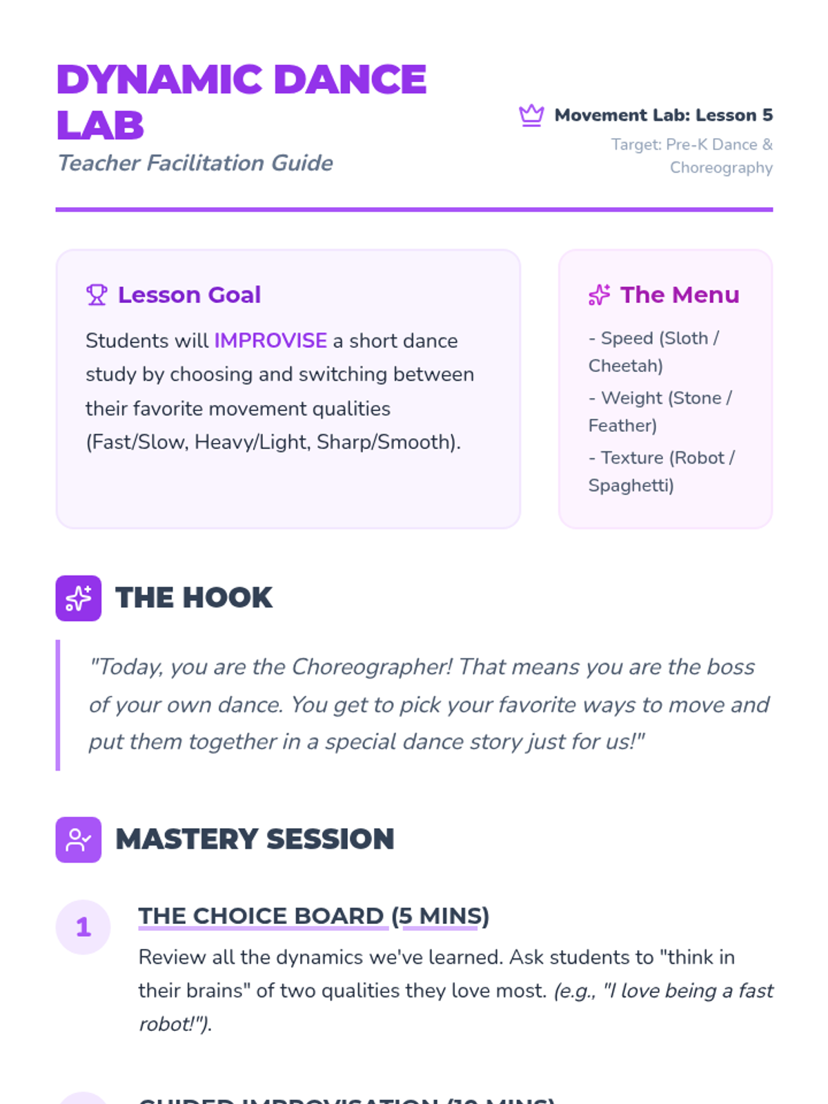 Students explore movement dynamics including speed, weight, and texture to understand how energy changes choreography. This Pre-K unit uses imagery and play to build foundational dance skills and creative expression.
