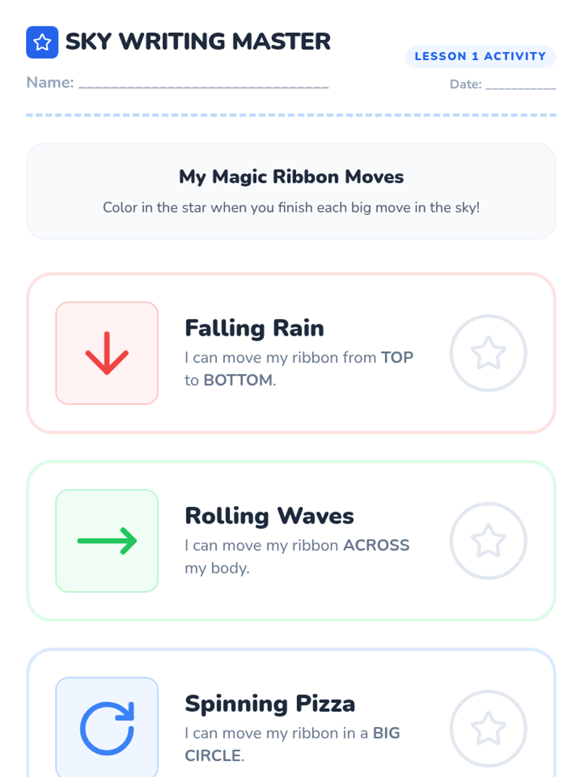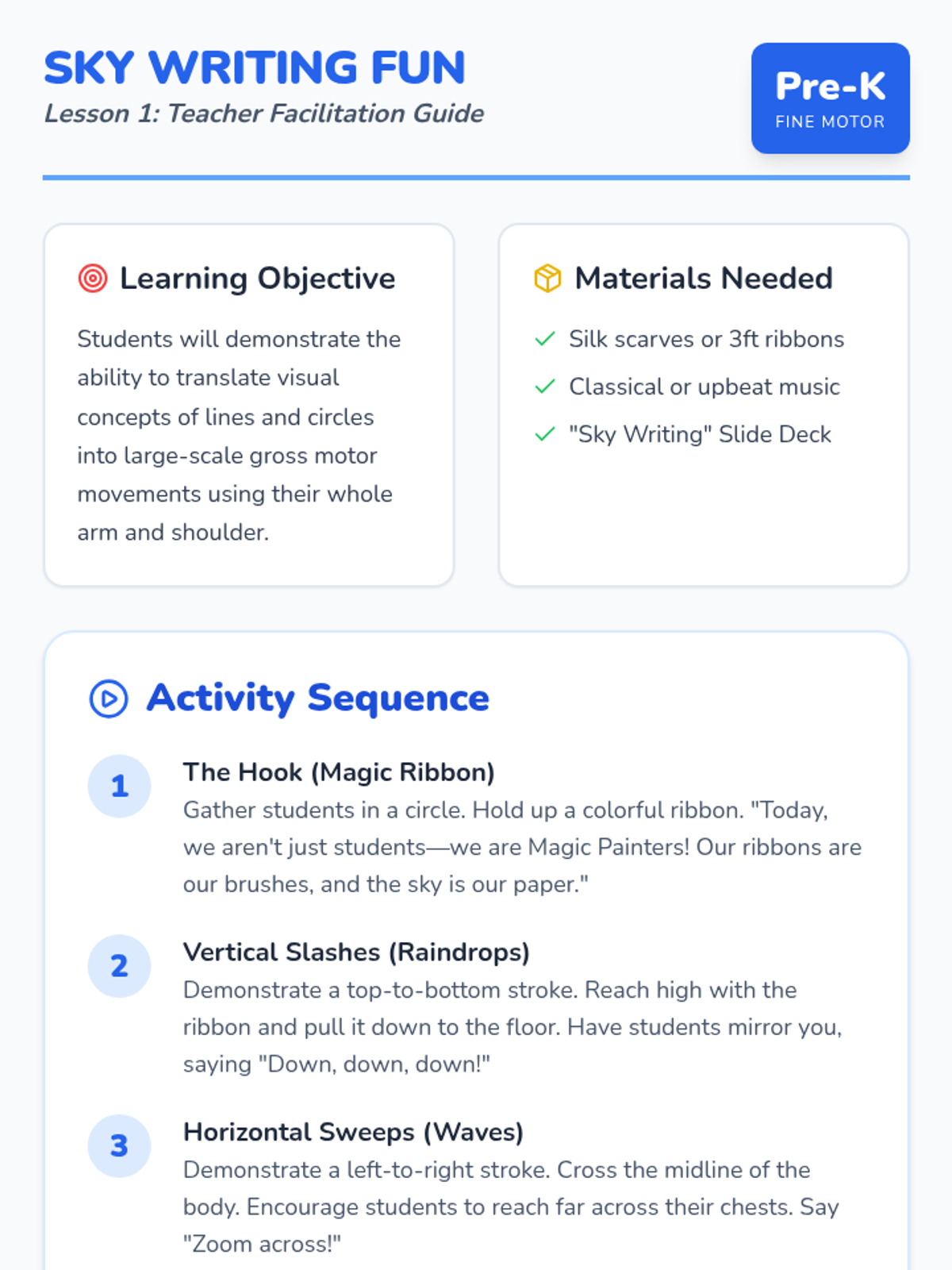 A multi-sensory pre-writing journey that moves Pre-K students from gross motor air-writing to precise fine motor control and shape formation. Students explore vertical, horizontal, and circular strokes through play, sensory exploration, and representational drawing.