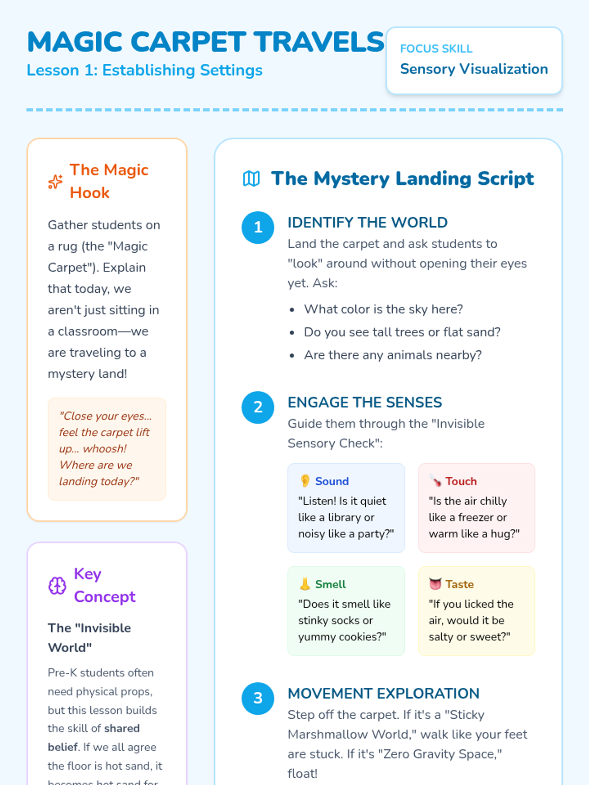 A Pre-K sequence focused on theater, guiding students to build shared imaginary worlds, assign roles, and solve dramatic conflicts together. Students will learn the basics of narrative structure and collaborative play through sensory exploration and role-play scenarios.