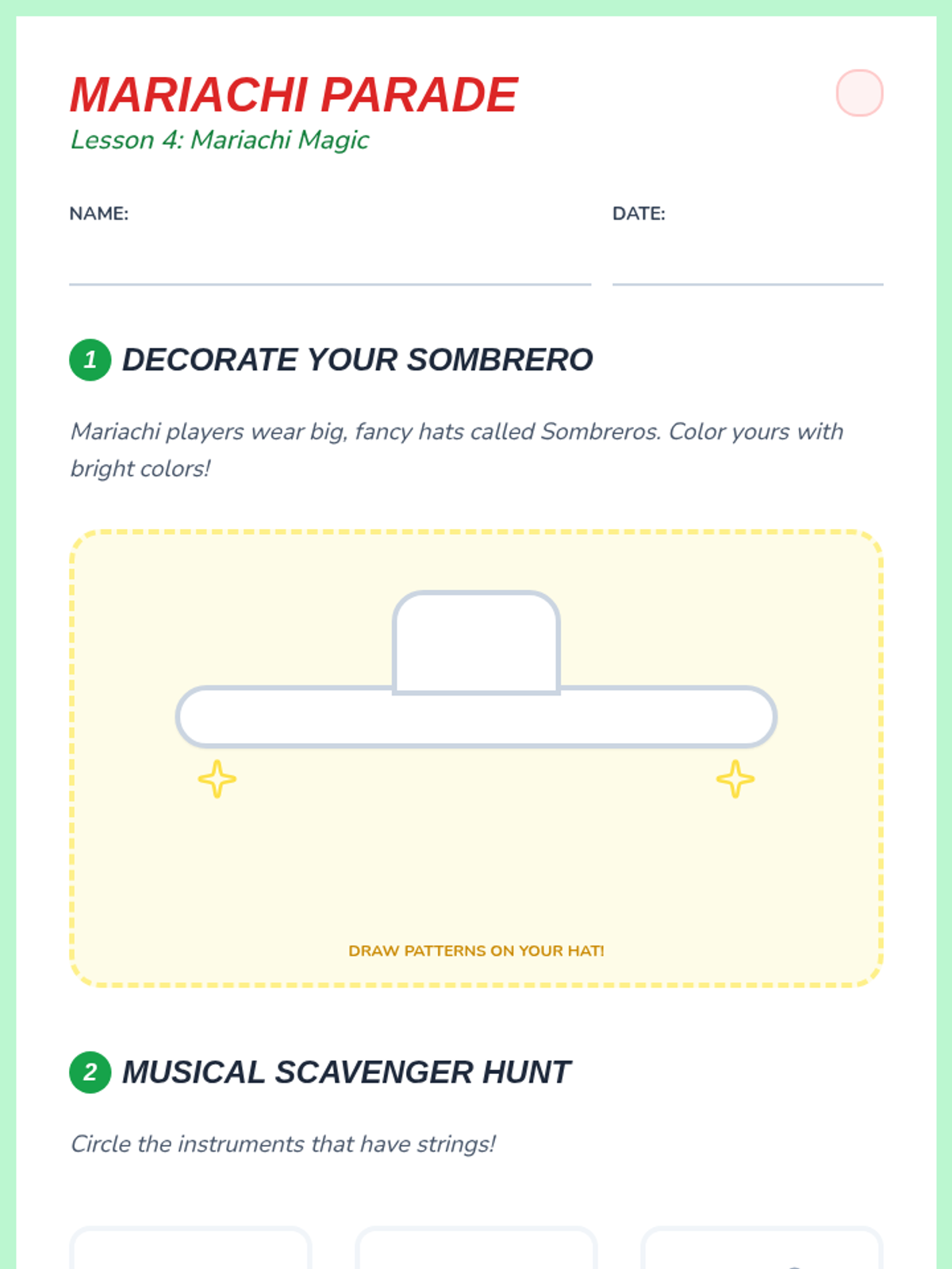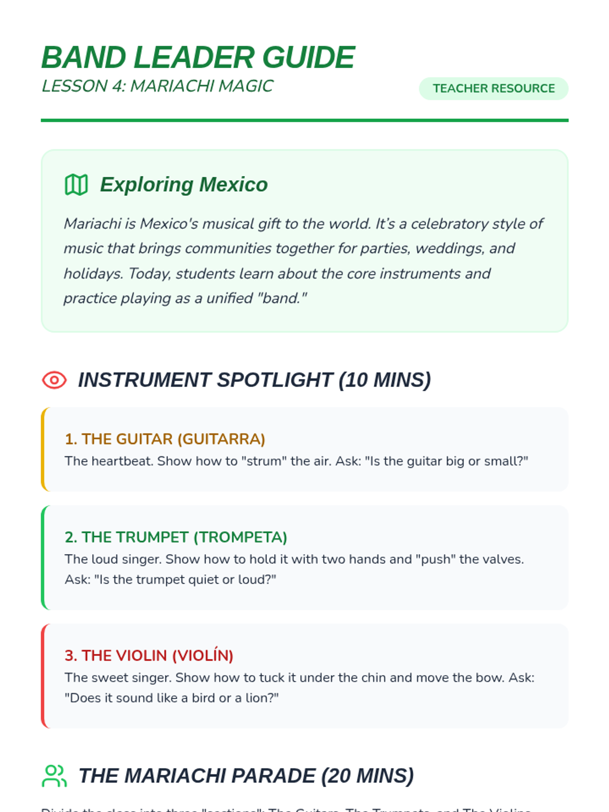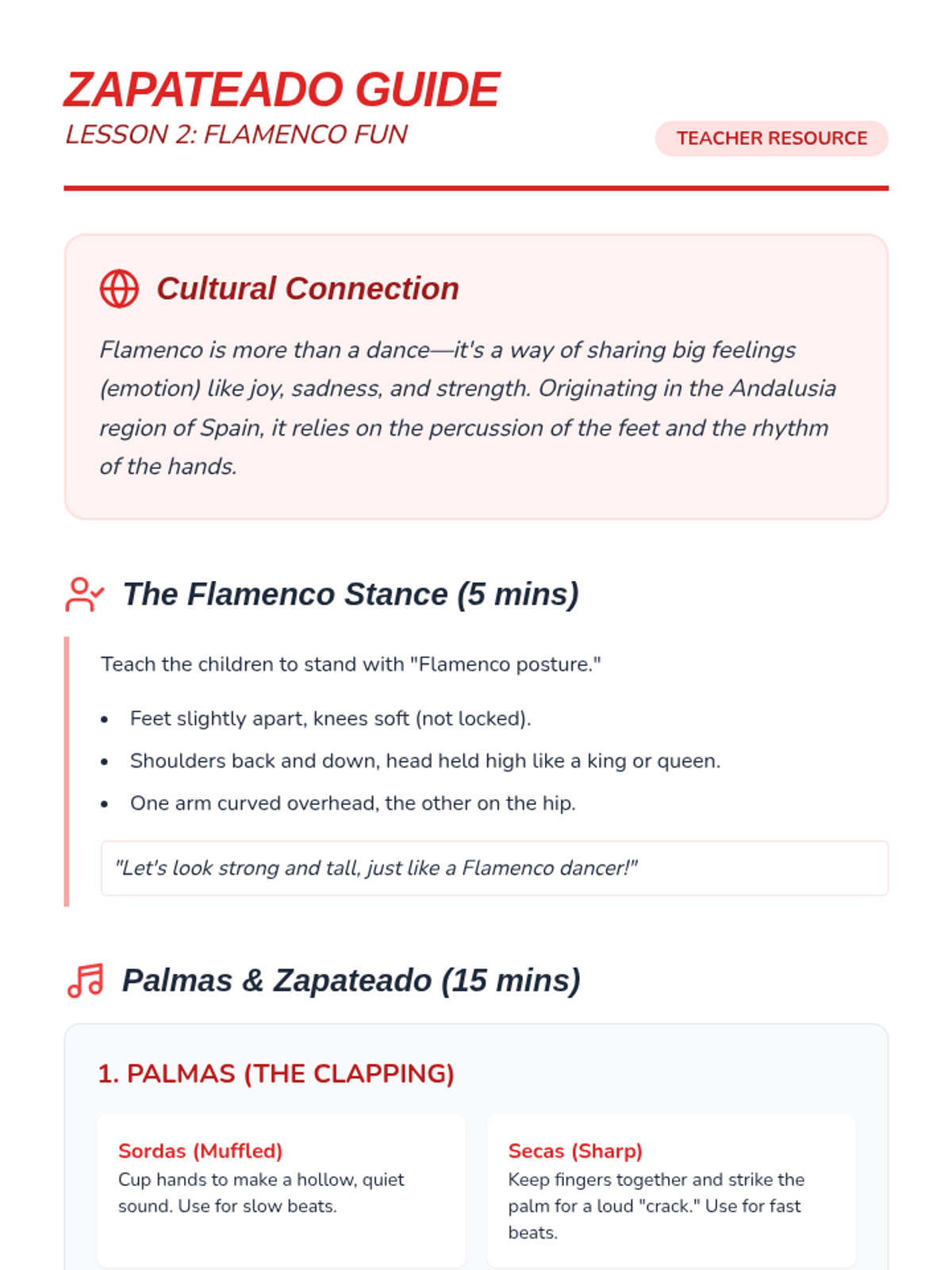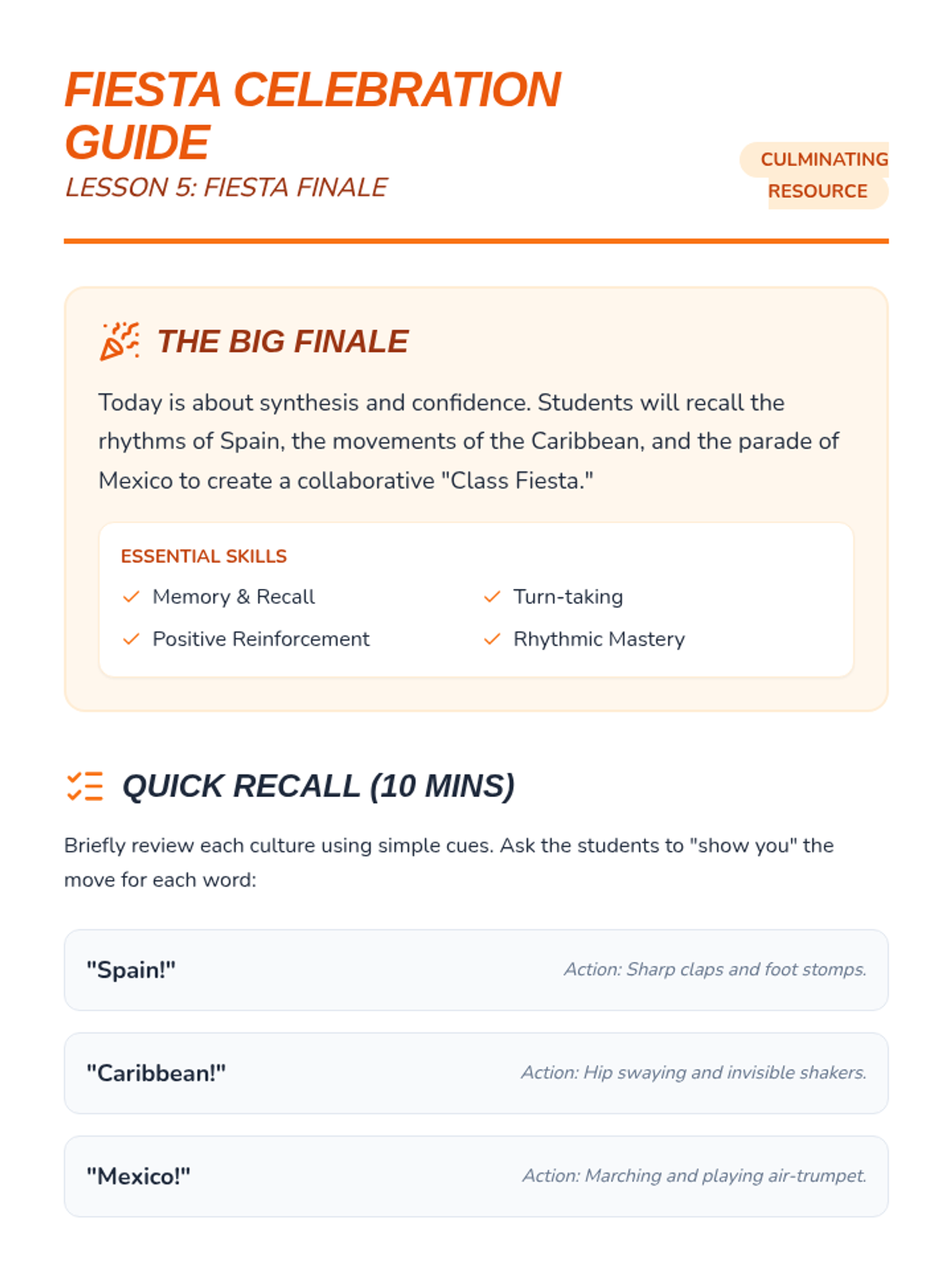A vibrant Pre-K sequence introducing Spanish-speaking cultures through music, rhythm, and movement. Students explore Flamenco, Salsa, and Mariachi through kinesthetic activities and simple percussion.