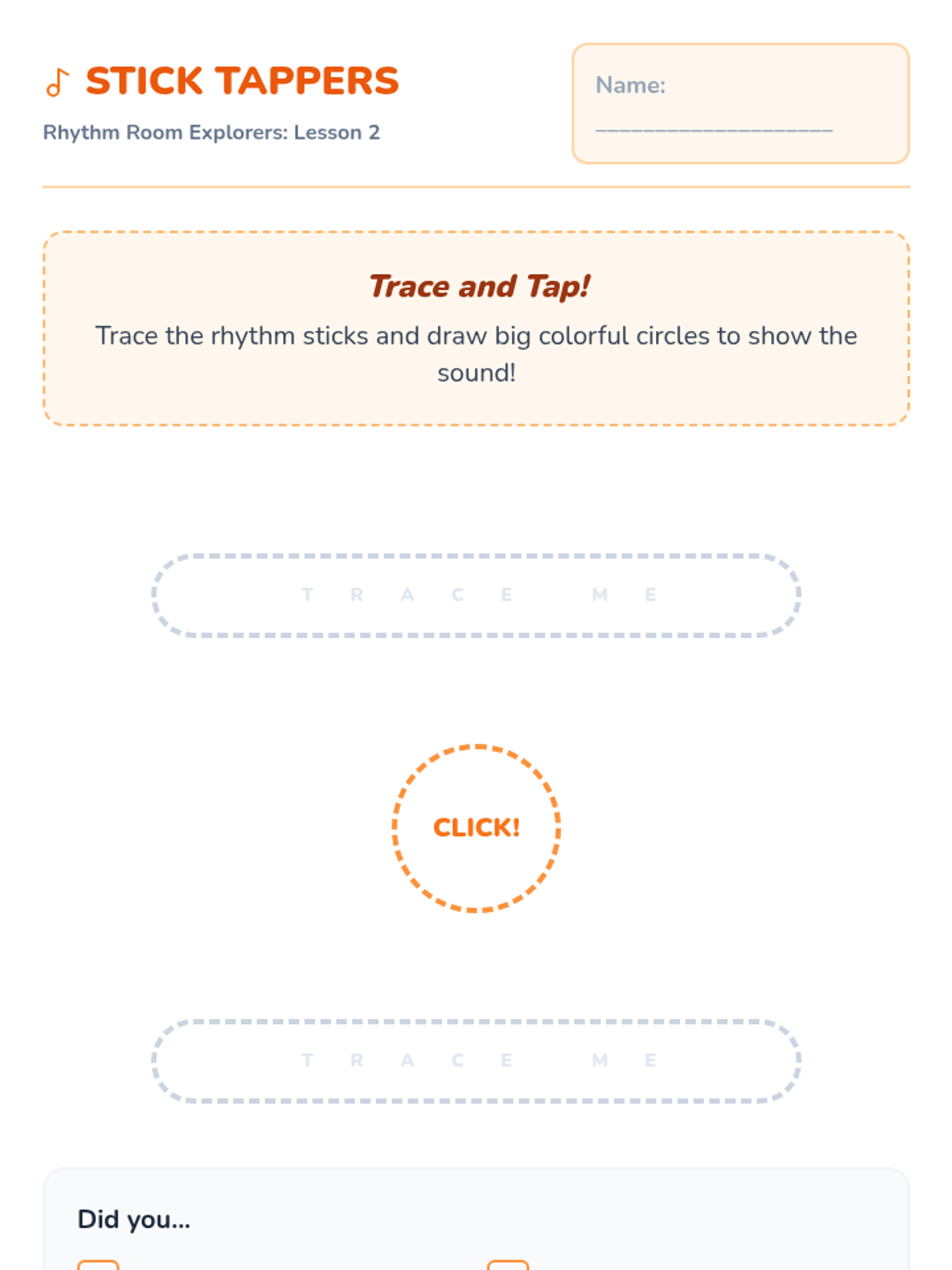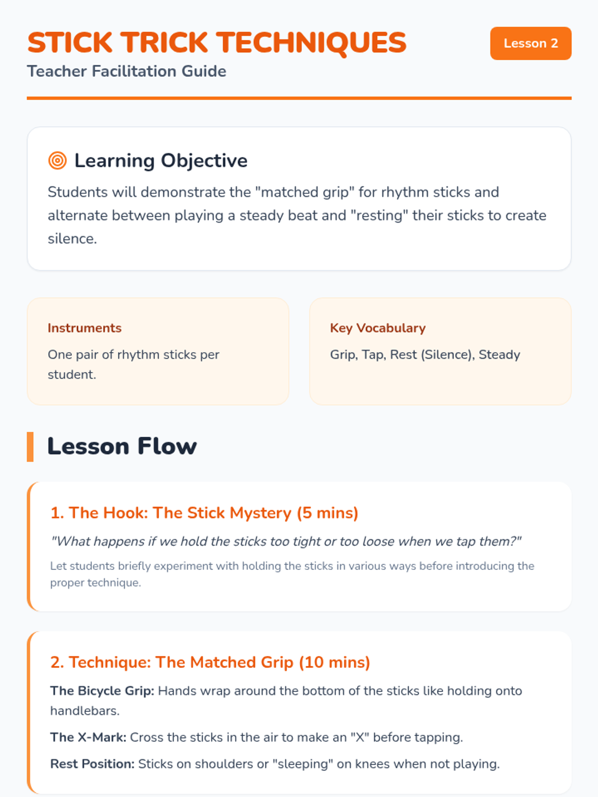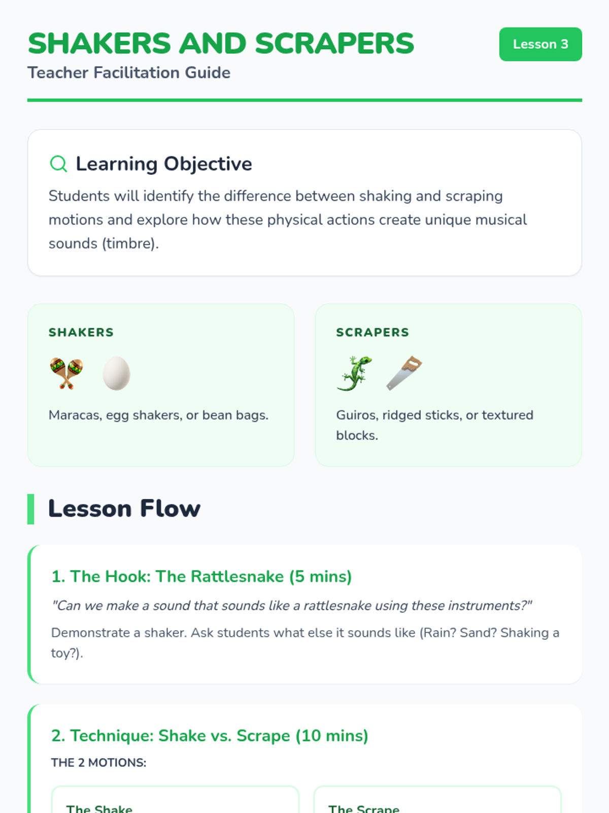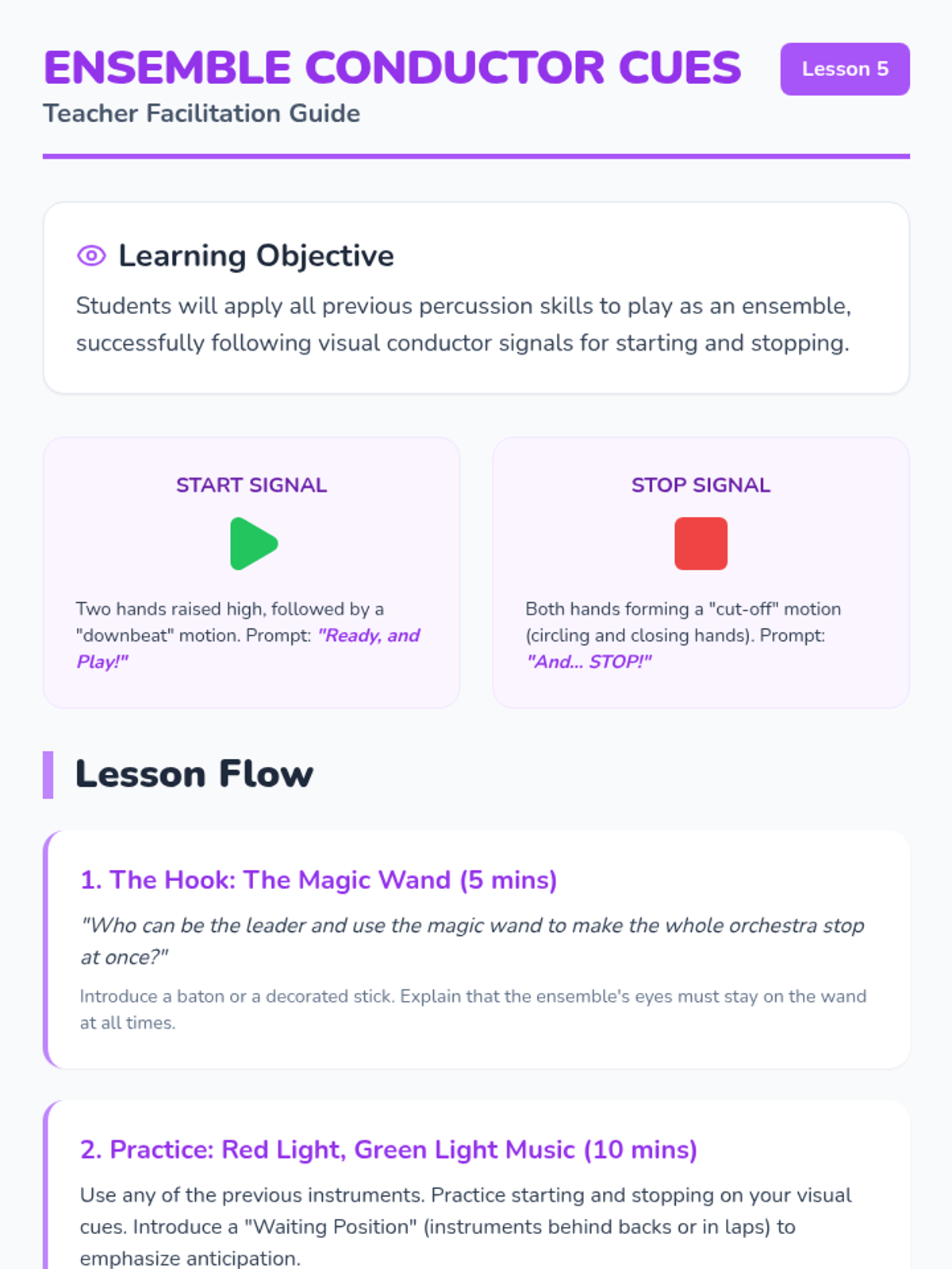 A 5-lesson sequence for Pre-K students to develop foundational motor skills, listening habits, and rhythmic accuracy through body percussion and unpitched instruments. Students progress from internalizing a beat to following ensemble cues.