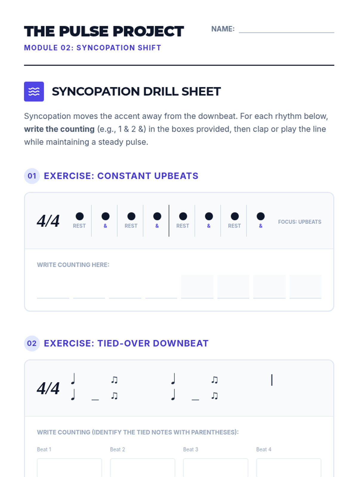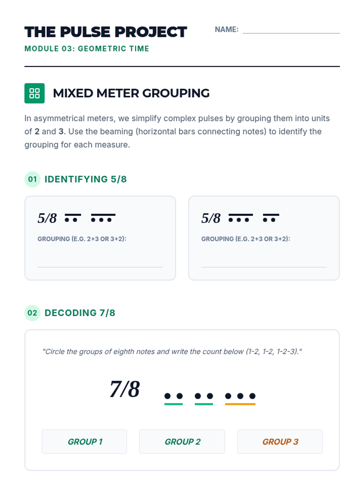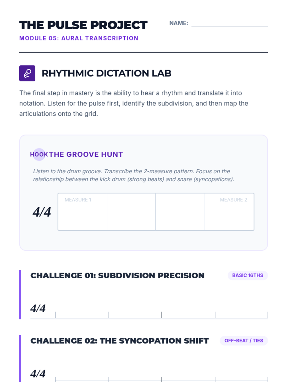 This advanced instrumental music sequence focuses on mastering rhythmic accuracy and sight-reading through mathematical subdivision, syncopation strategies, mixed meter analysis, and systematic protocols. Students will progress from internalizing a steady pulse to decoding complex Grade 4-5 rhythmic literature.