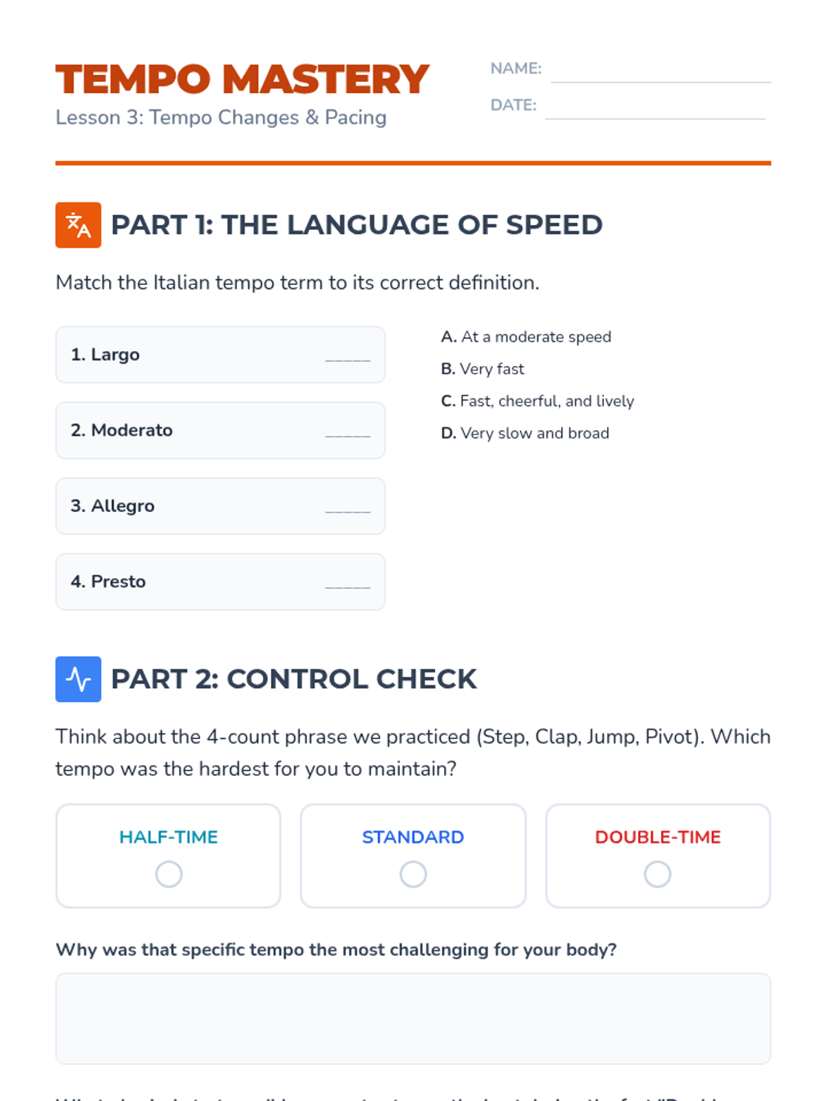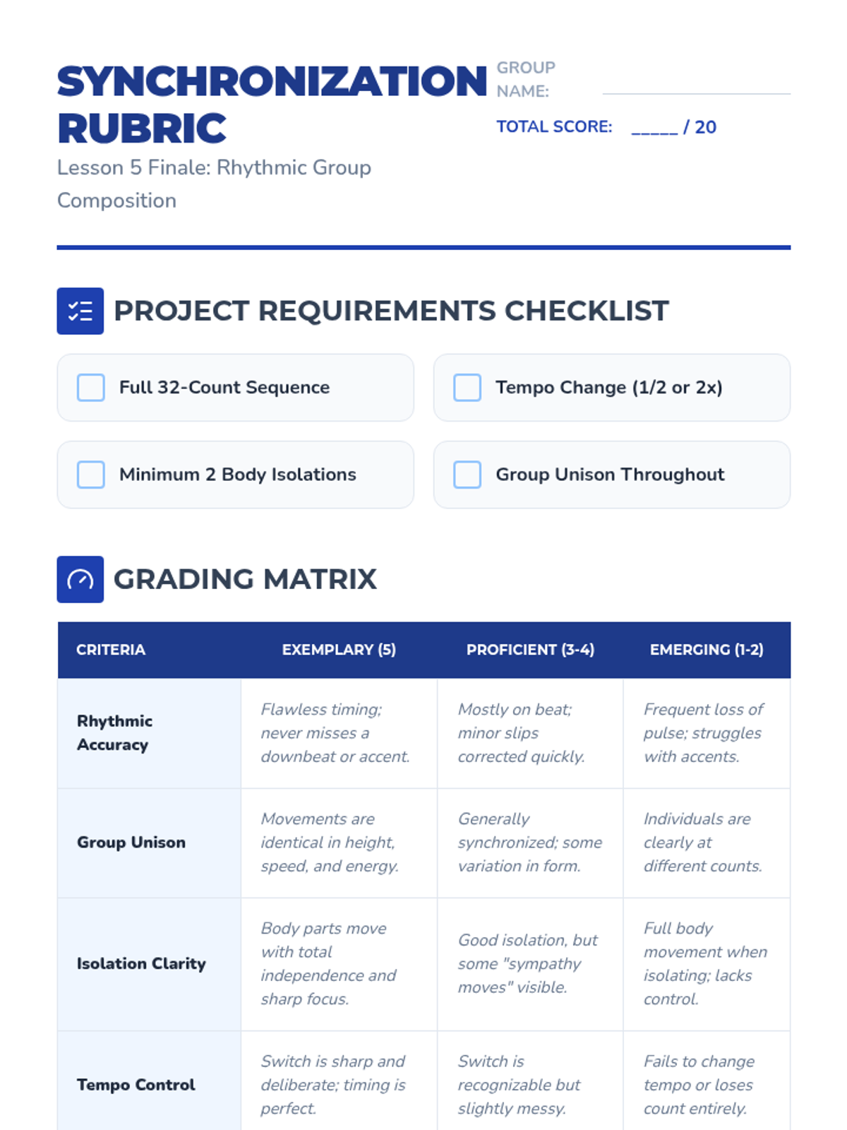 A comprehensive 7th-grade unit focusing on musicality, internalizing the beat, and translating rhythm into precise physical movement. Students progress from basic pulse identification to complex syncopation and collaborative rhythmic composition.