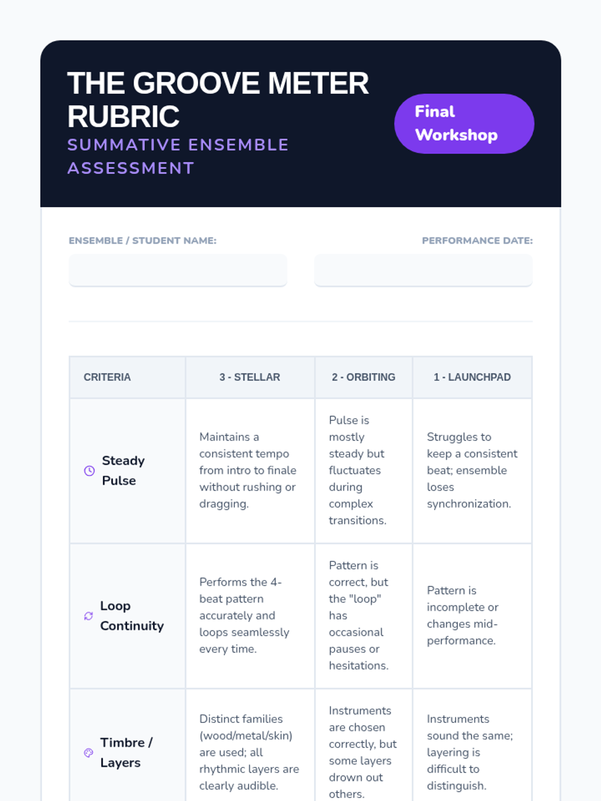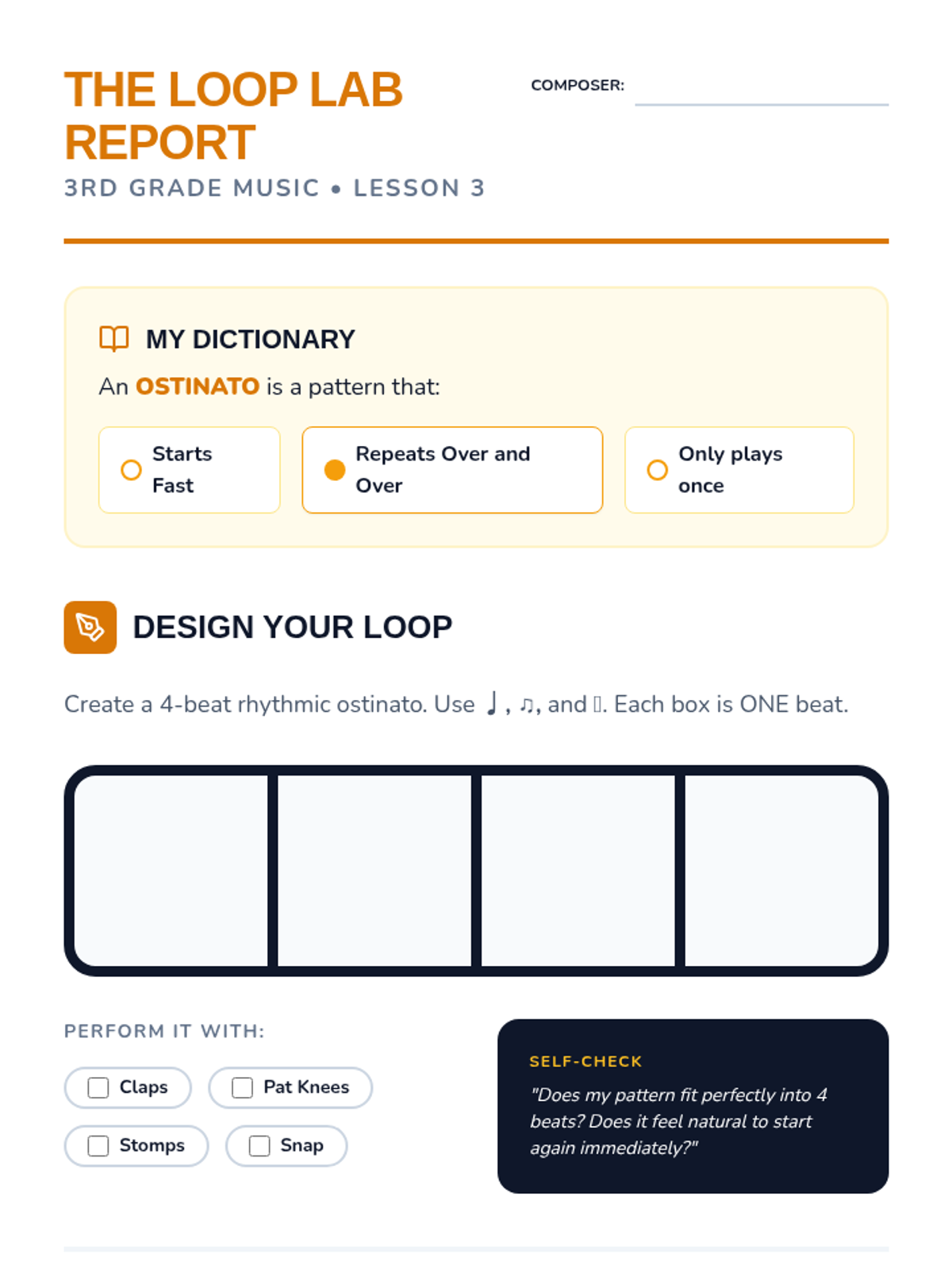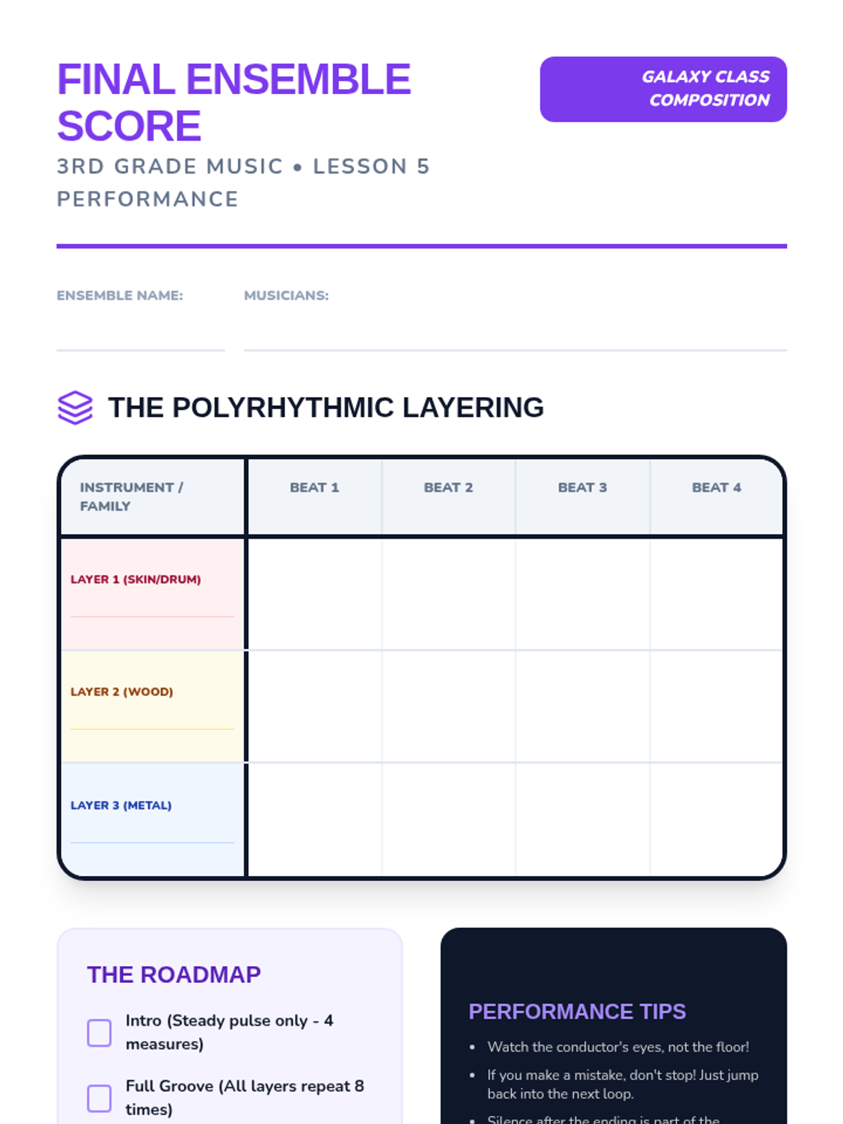 A 3rd-grade music sequence focusing on the transition from basic pulse to complex polyrhythmic compositions. Students learn to distinguish beat from rhythm, notate patterns, create loops (ostinatos), and layer multiple textures into a final percussion ensemble performance.