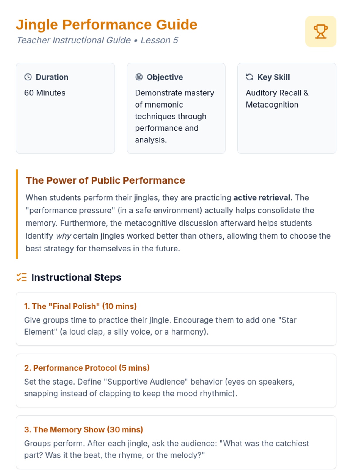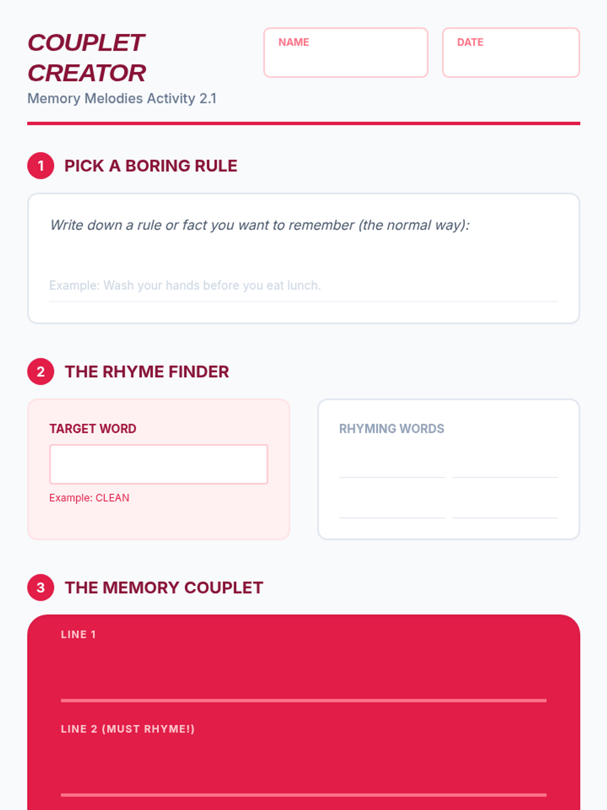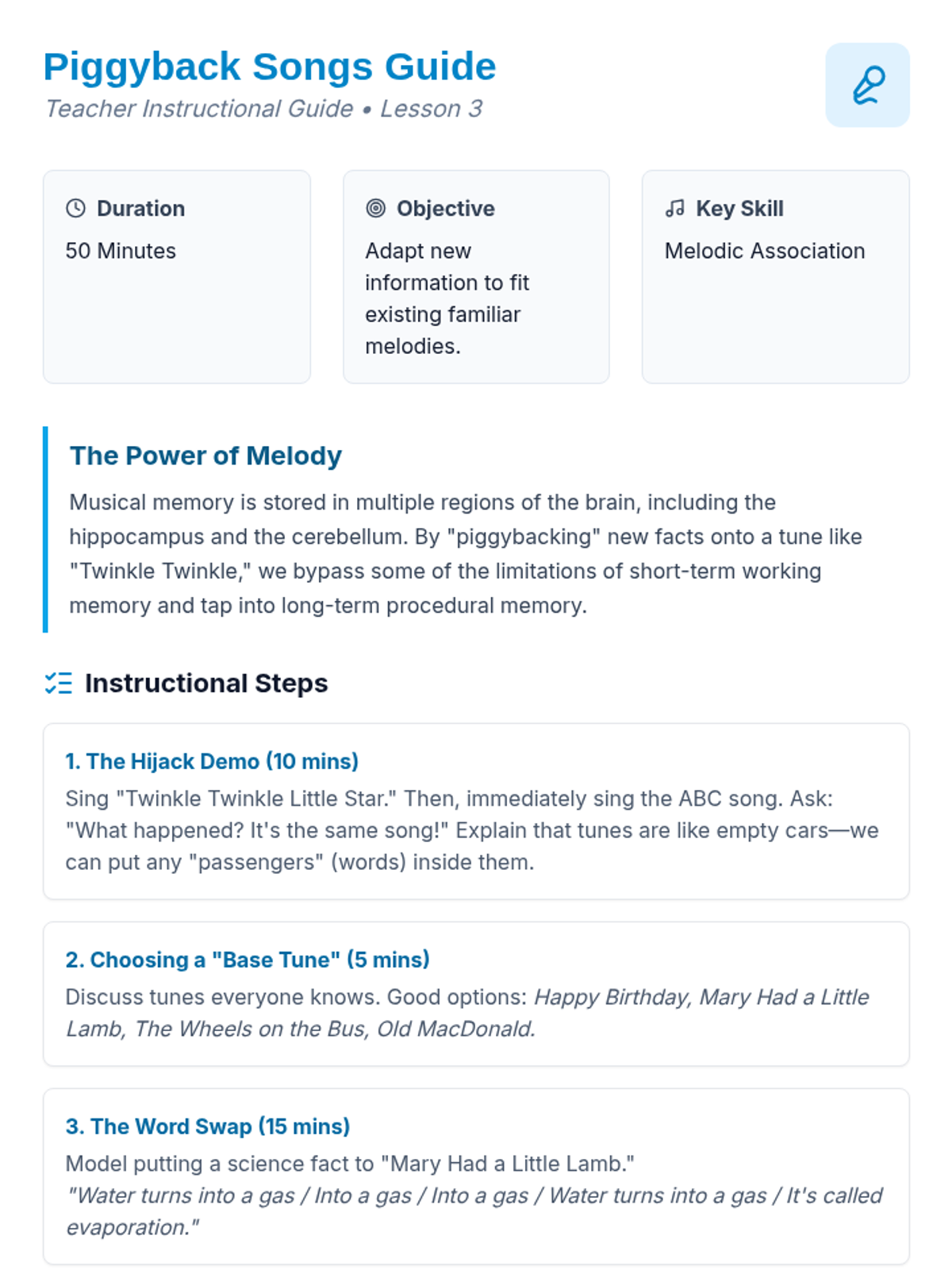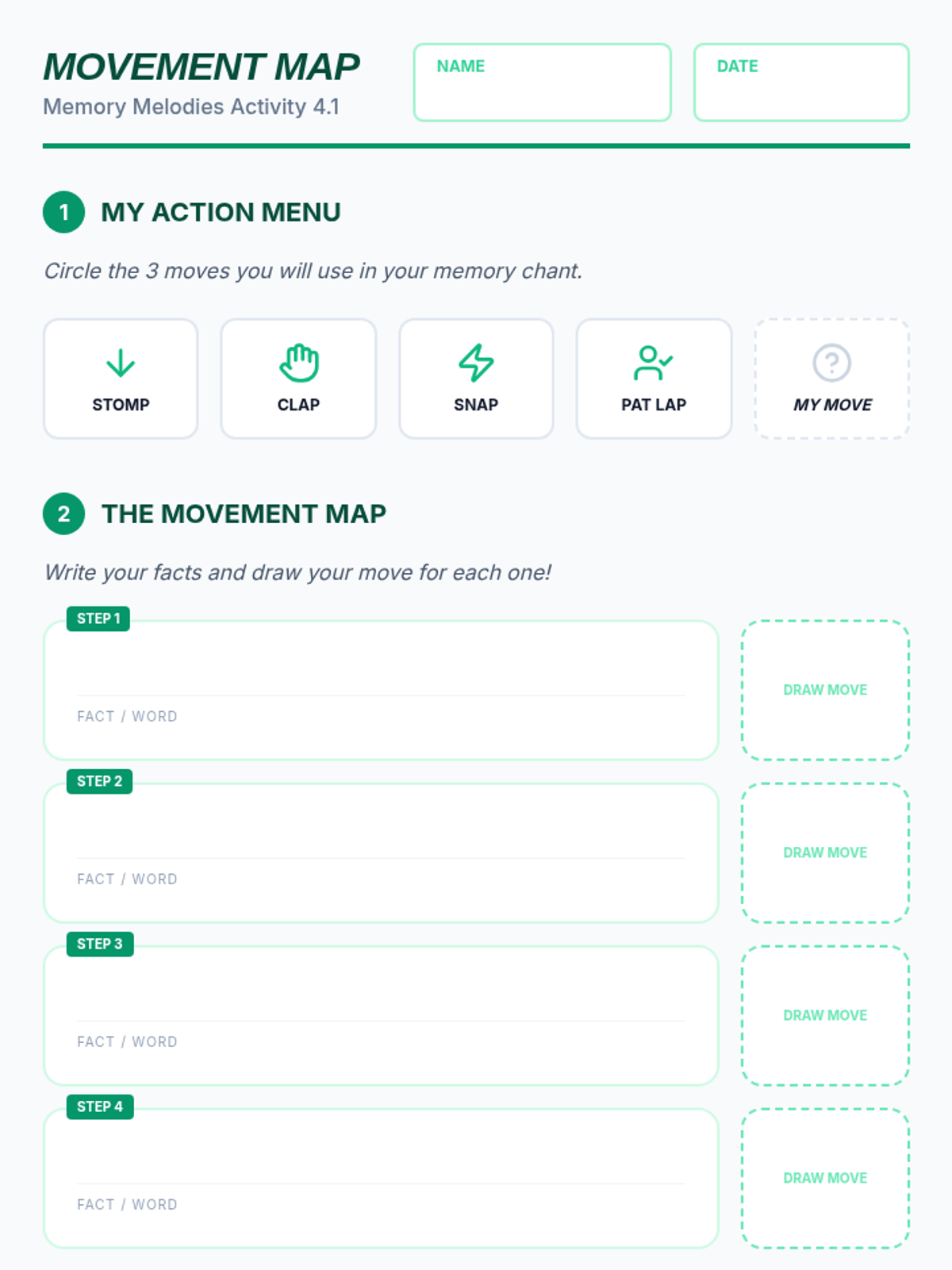 A specialized sequence designed for 3rd-grade students with working memory challenges. It teaches them how to use rhythm, rhyme, melody, and movement to 'glue' information in their minds for easier recall.
