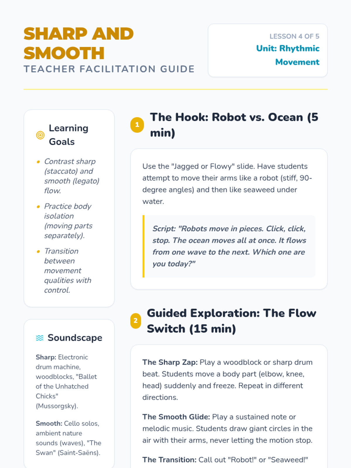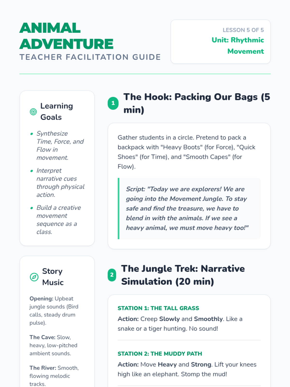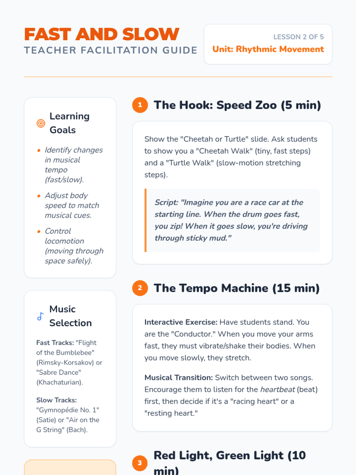 A four-day music and movement unit for K-3 students focused on collaboration, rhythm, and creative choreography. Groups work together to select songs and build original dance routines.