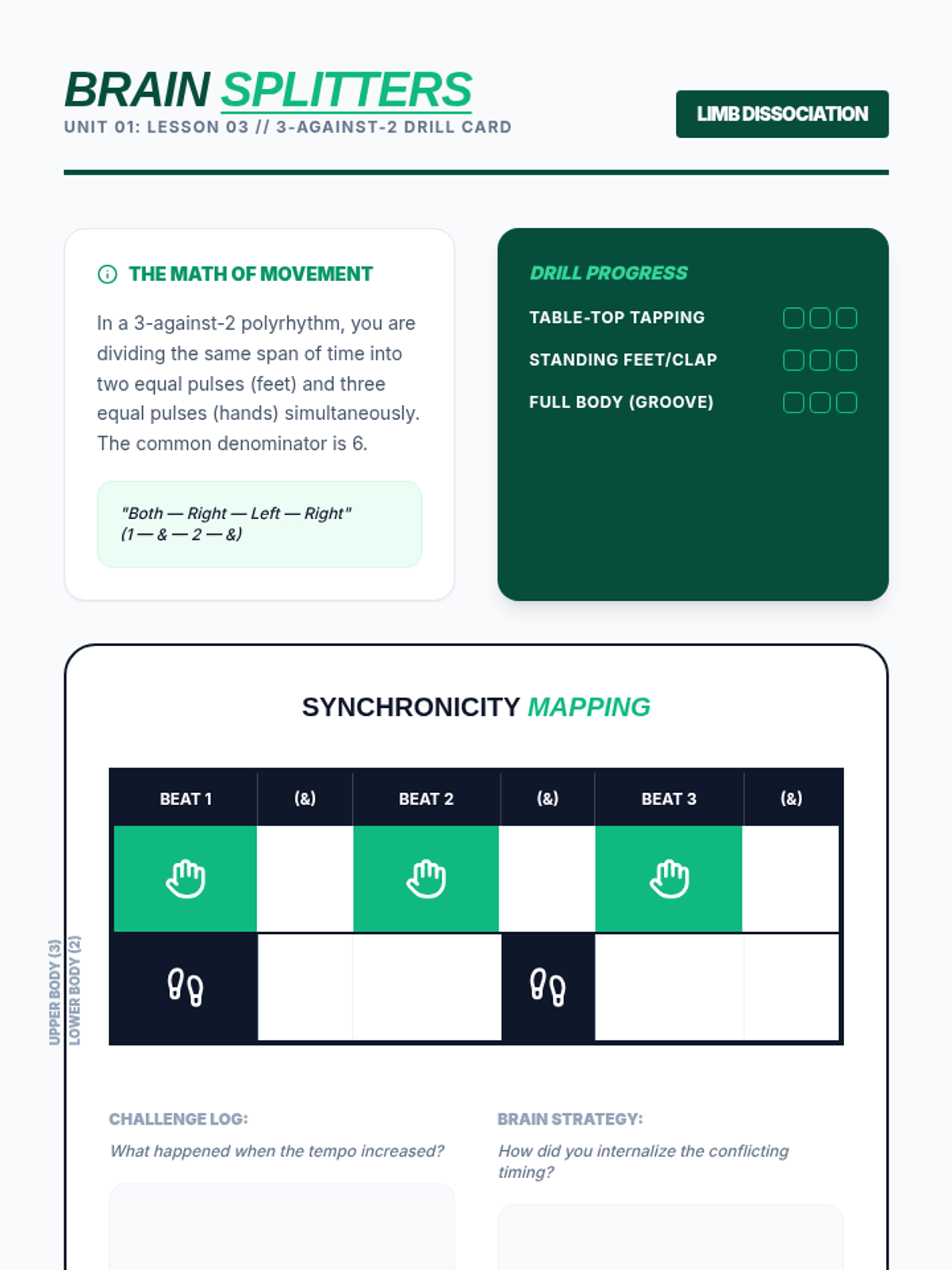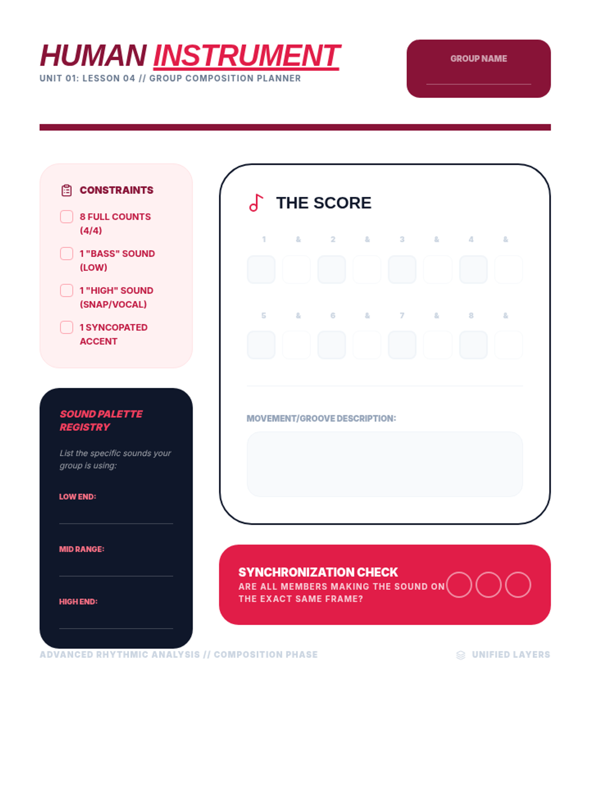 A high-level physical education sequence for 12th graders focusing on the intersection of music theory and movement. Students progress from basic beat identification to complex polyrhythmic coordination and body percussion.