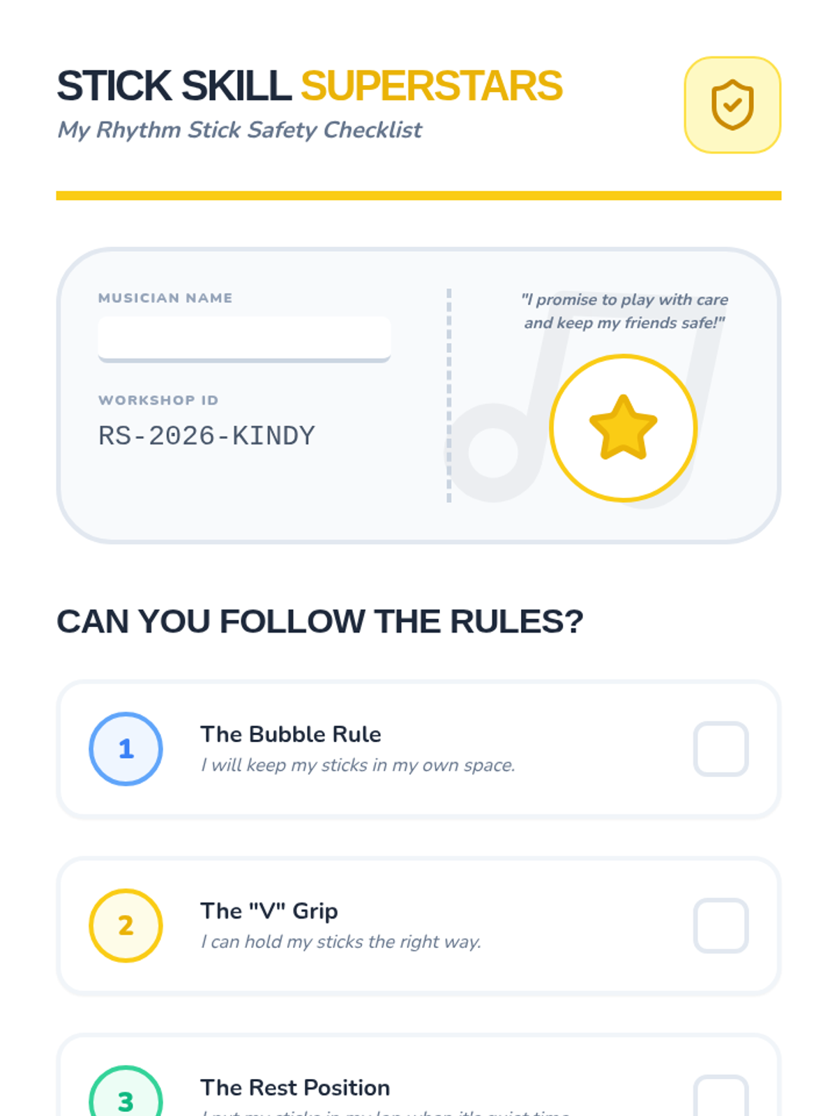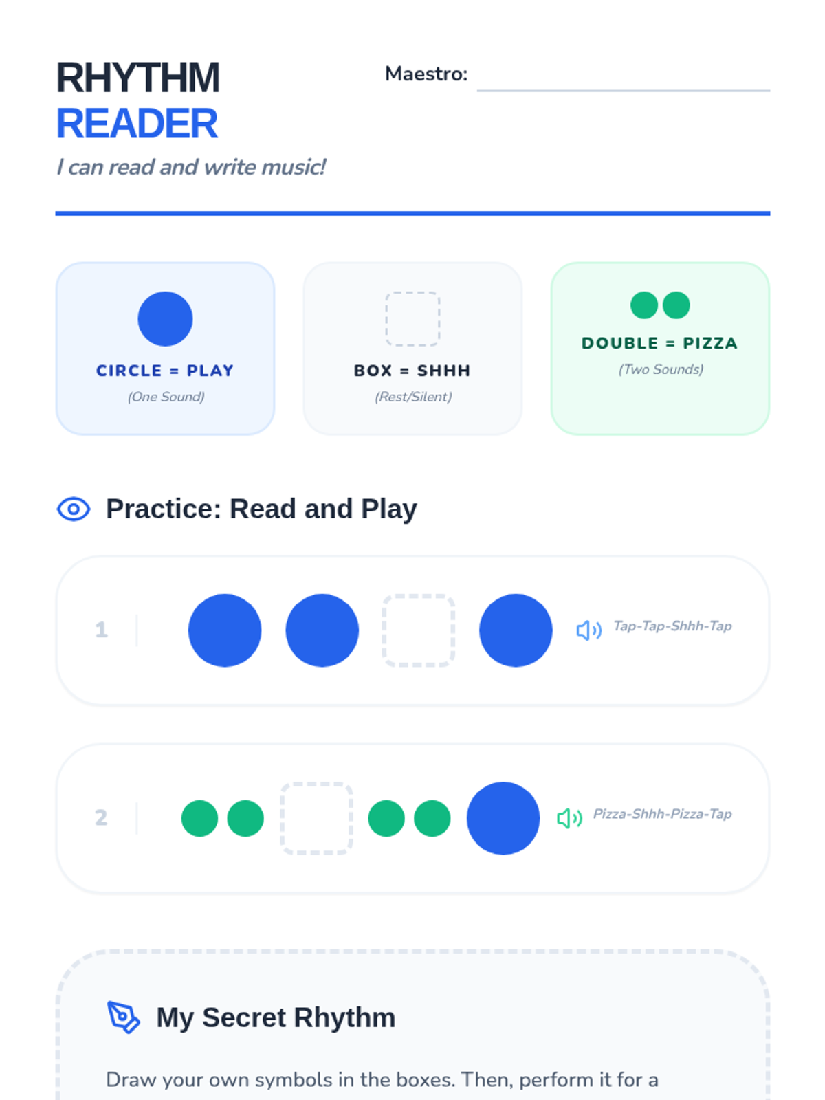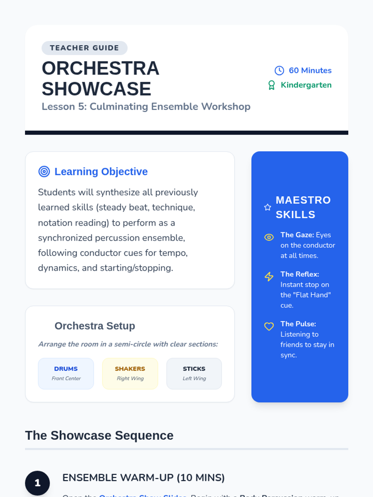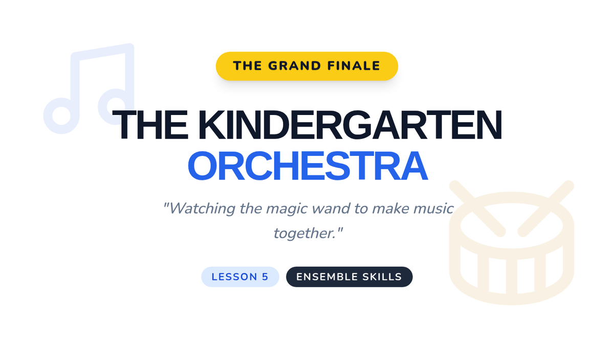 A foundational sequence for Kindergarten students focusing on steady beat, percussion technique, and ensemble skills using body percussion, rhythm sticks, shakers, and drums. Students progress from physical coordination to reading iconic notation and performing as a synchronized group.