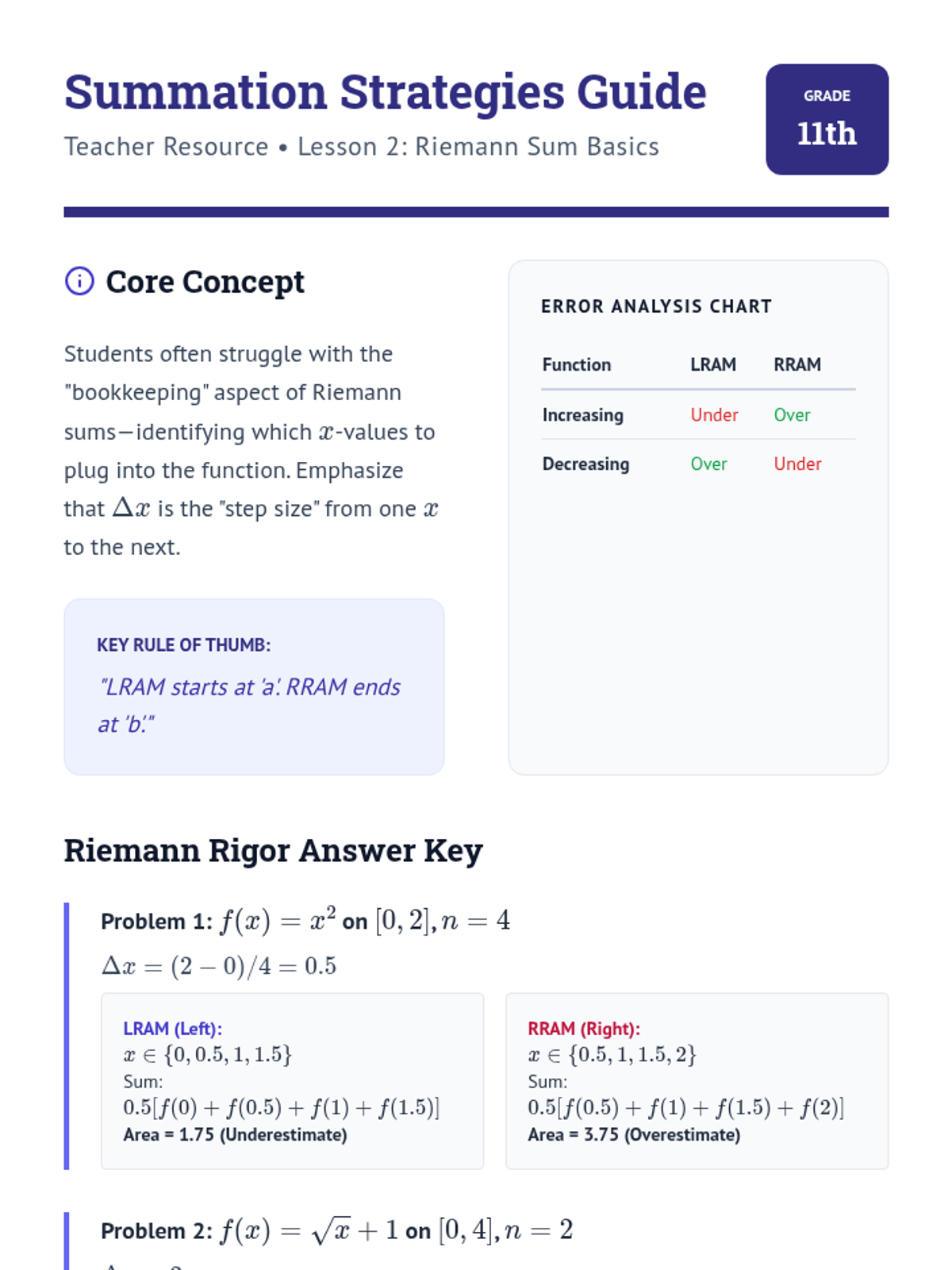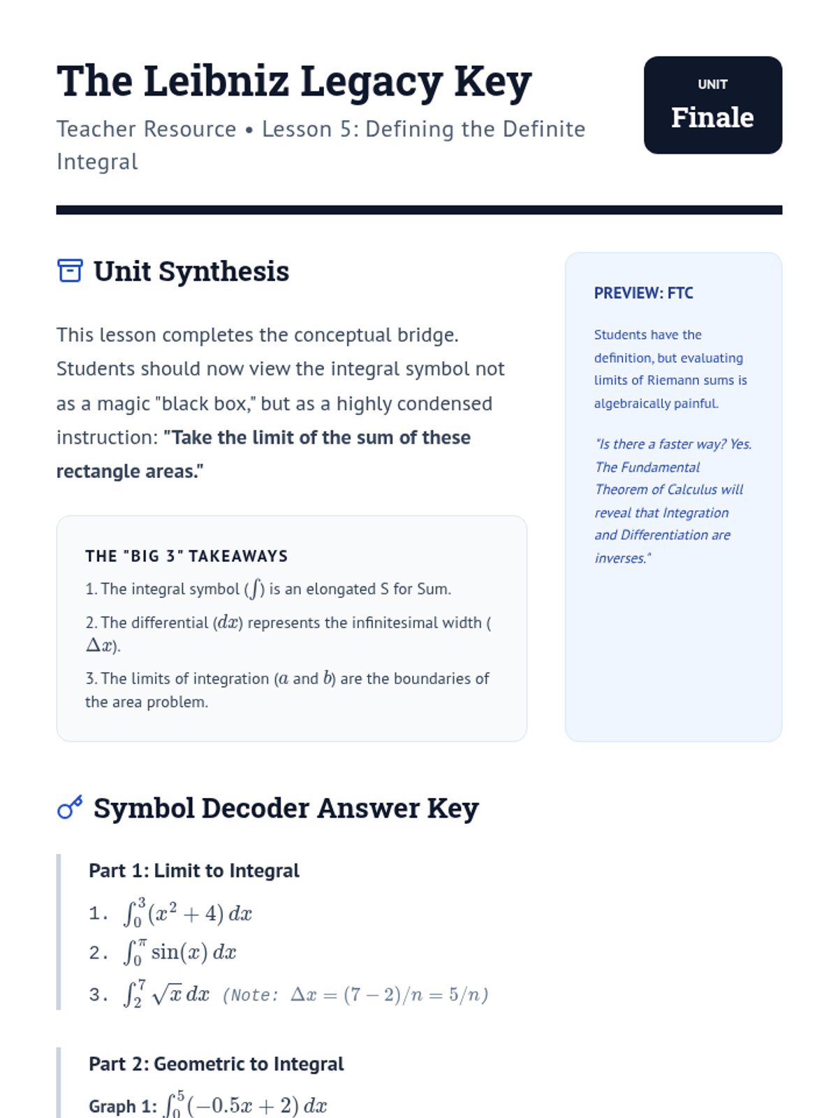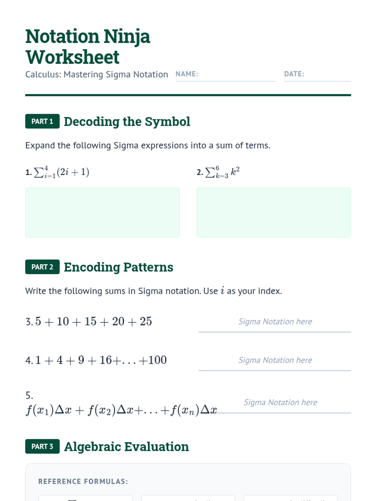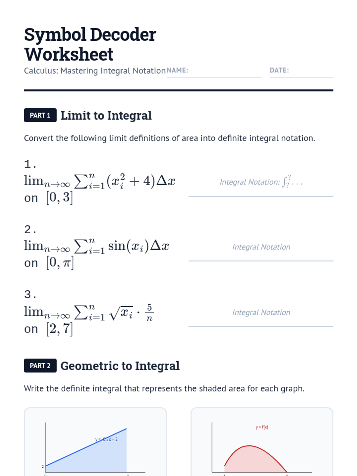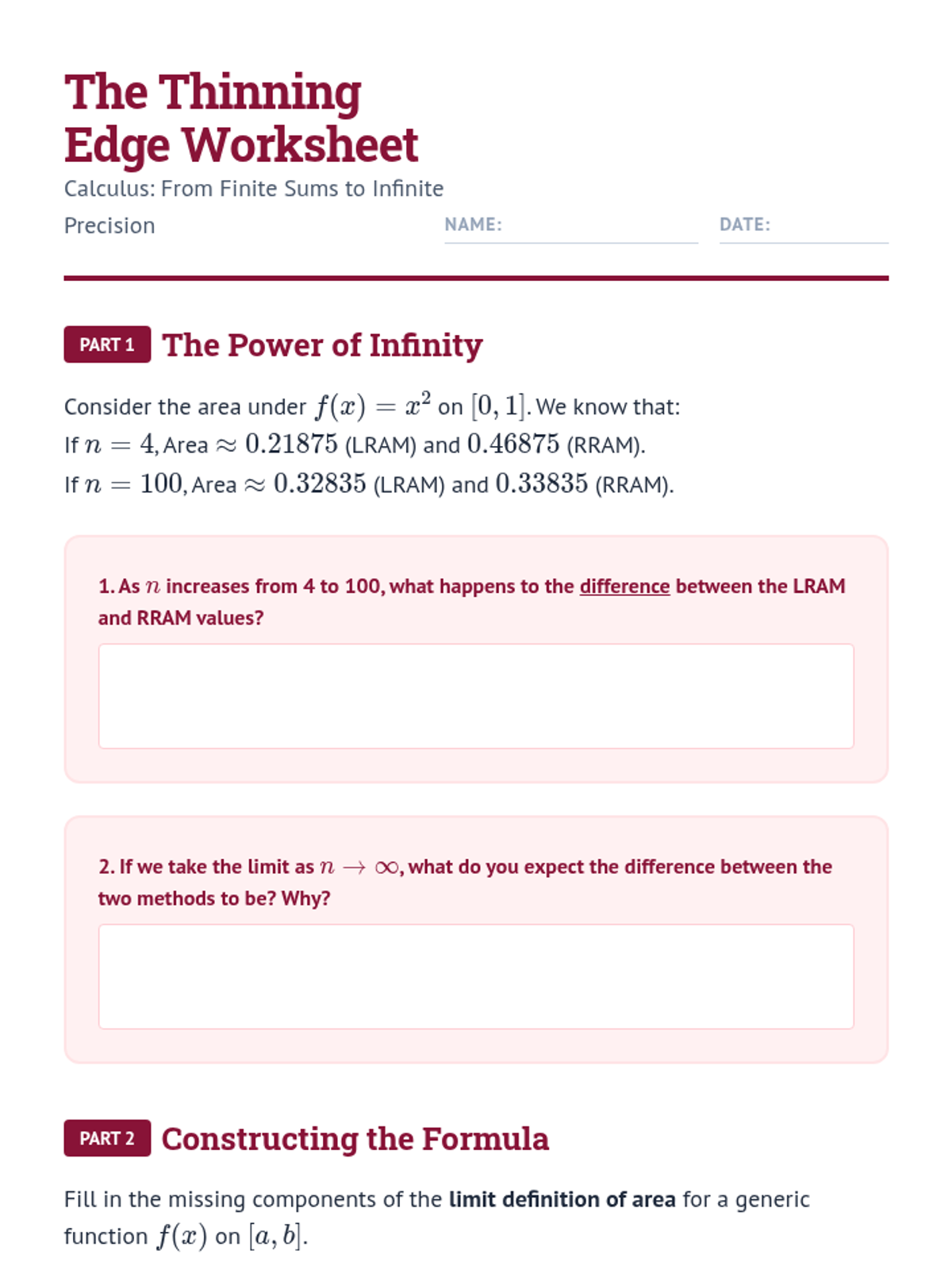 This sequence guides students through the conceptual transition from geometry to calculus by investigating the Area Problem. Students begin by estimating areas under curves using geometric shapes, discovering the relationship between rectangle width and approximation accuracy. As the sequence progresses, learners formalize these approximations using Sigma notation and limits, ultimately defining the definite integral.
