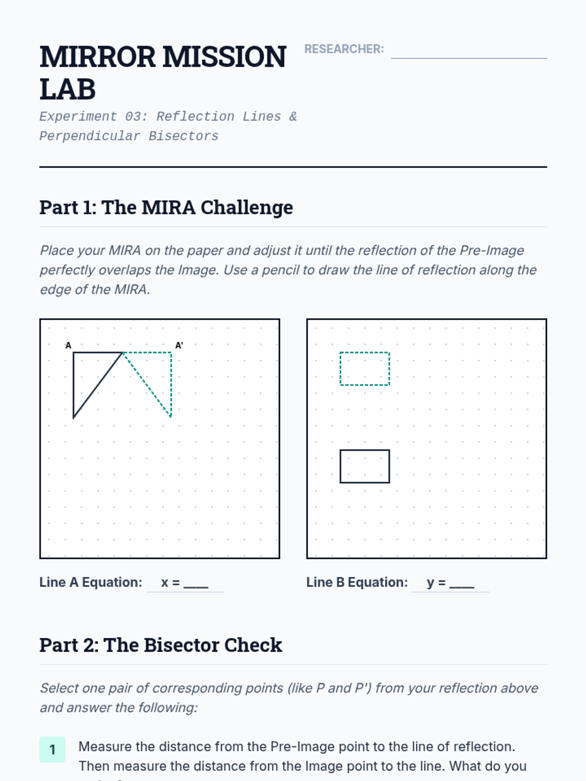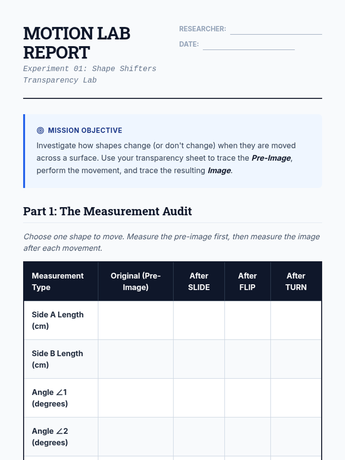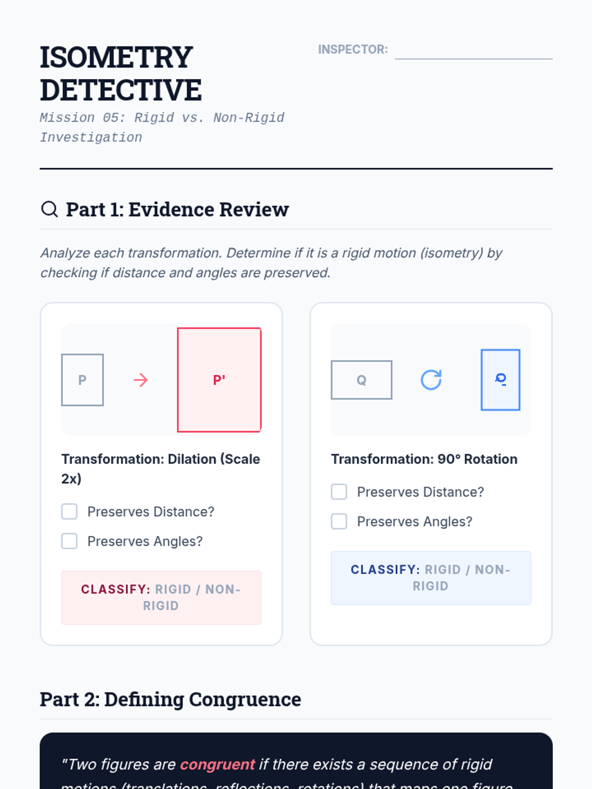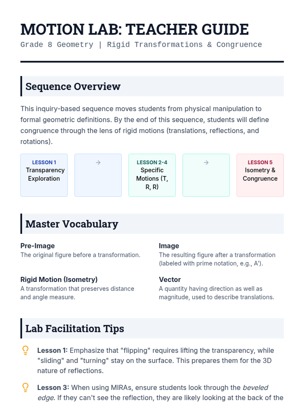 An 8th-grade geometry sequence exploring translations, reflections, and rotations through physical manipulation and coordinate-based analysis to define rigid motions and congruence.