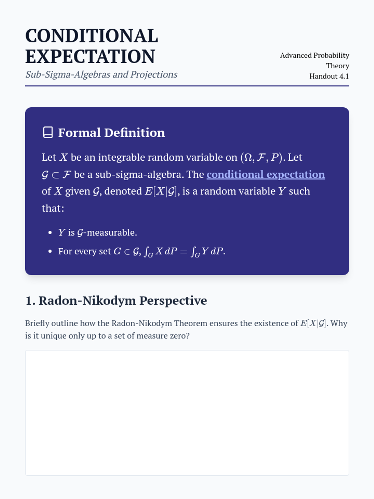 A graduate-level exploration of expected value through the lens of measure theory, covering Lebesgue integration, fundamental inequalities, convergence theorems, and conditional expectation using Sigma-algebras.