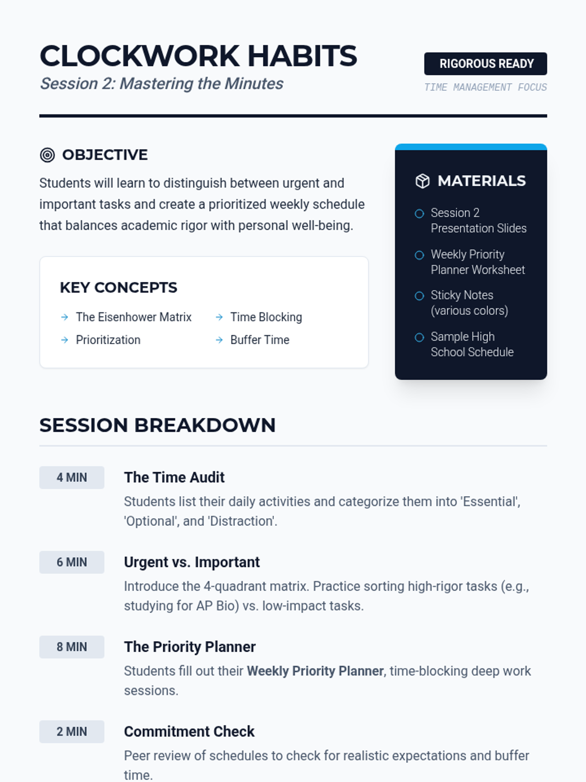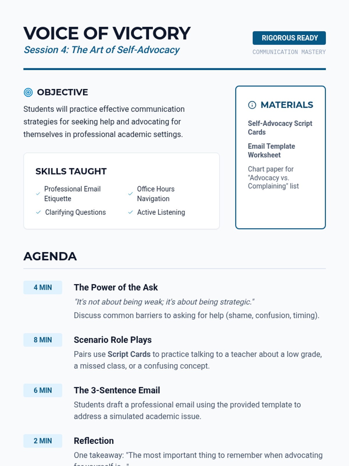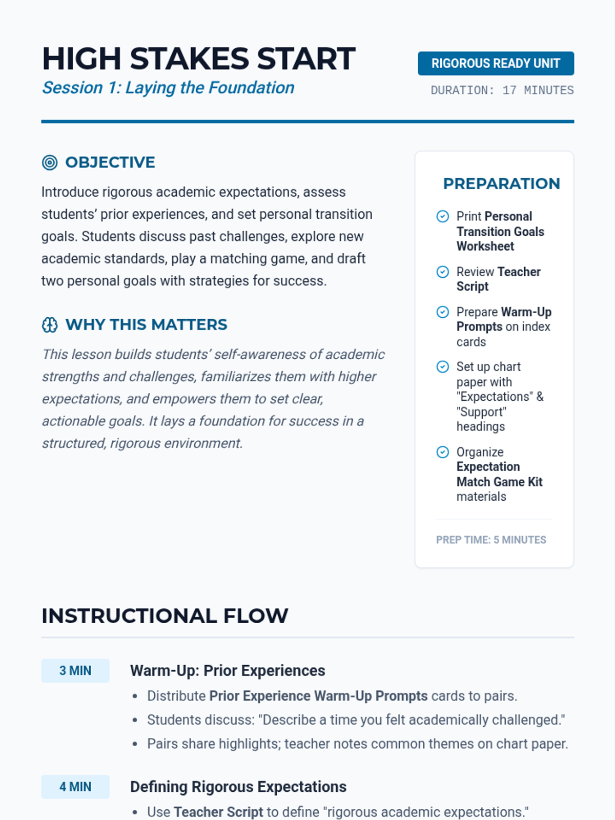 A 6-session transition unit designed to prepare high school students for the academic rigor of a charter school environment through study habits, organization, and self-advocacy.