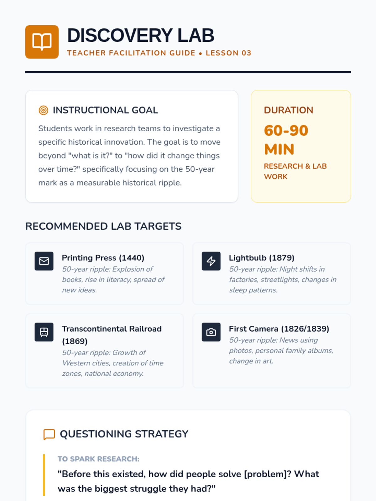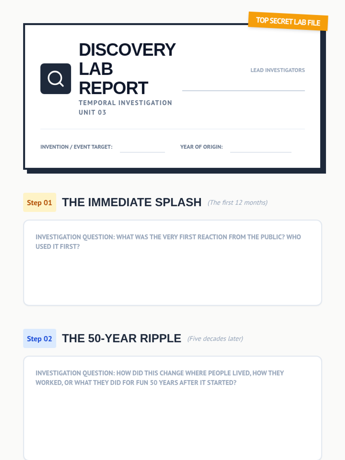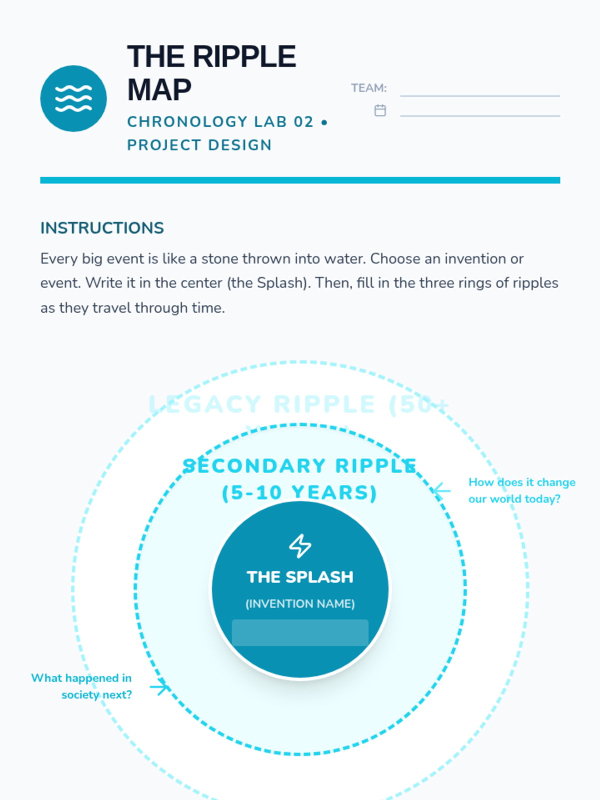 A 4th-grade social studies sequence focusing on chronology and causation by distinguishing between short-term impacts and long-term consequences of major innovations and events. Students use the 'Ripple Effect' metaphor to map how history continues to shape the modern world.