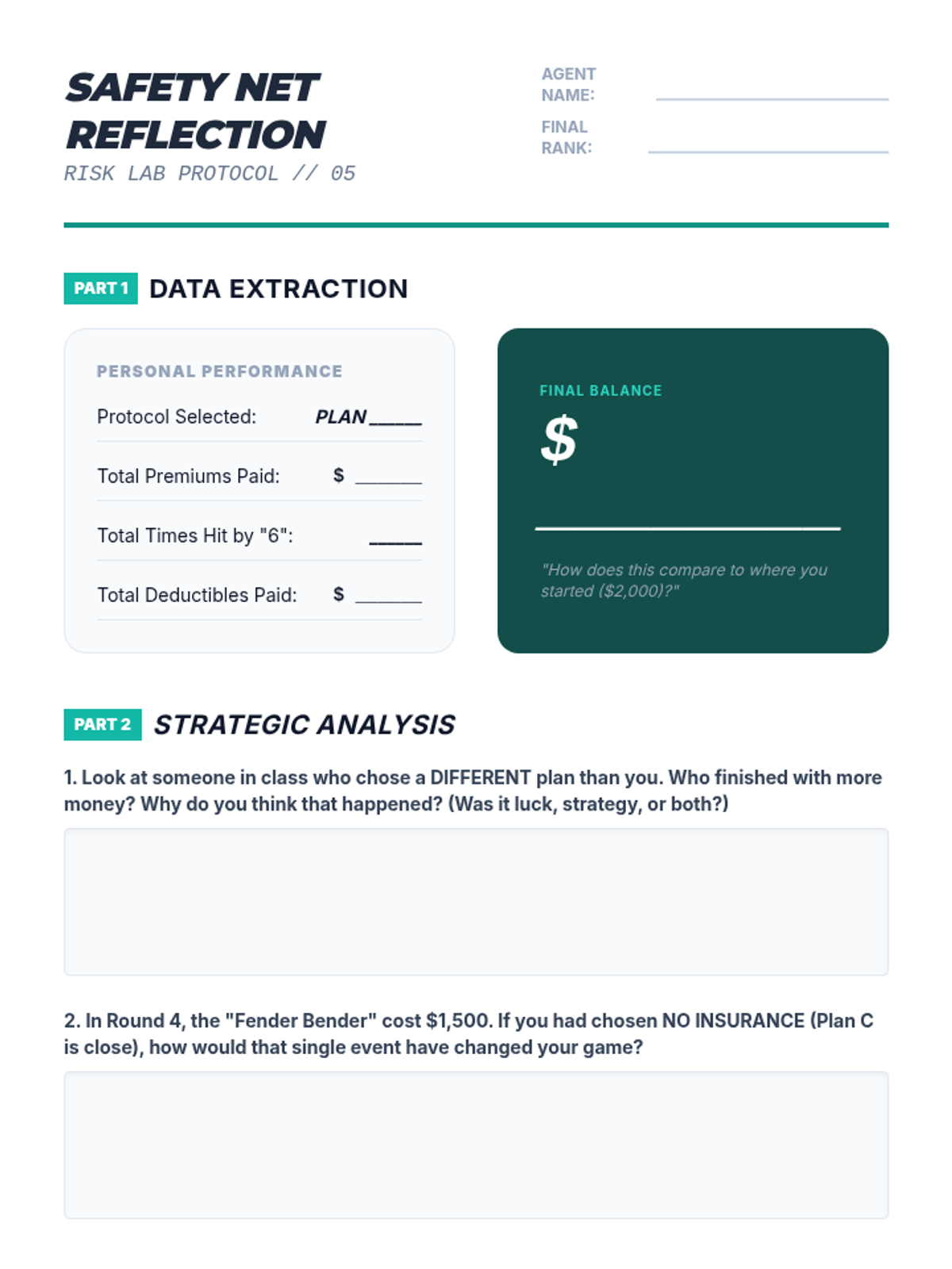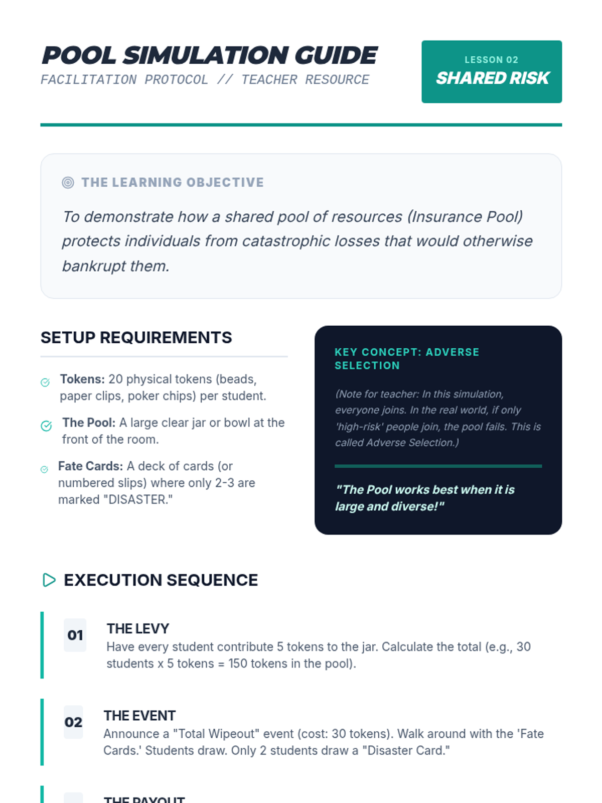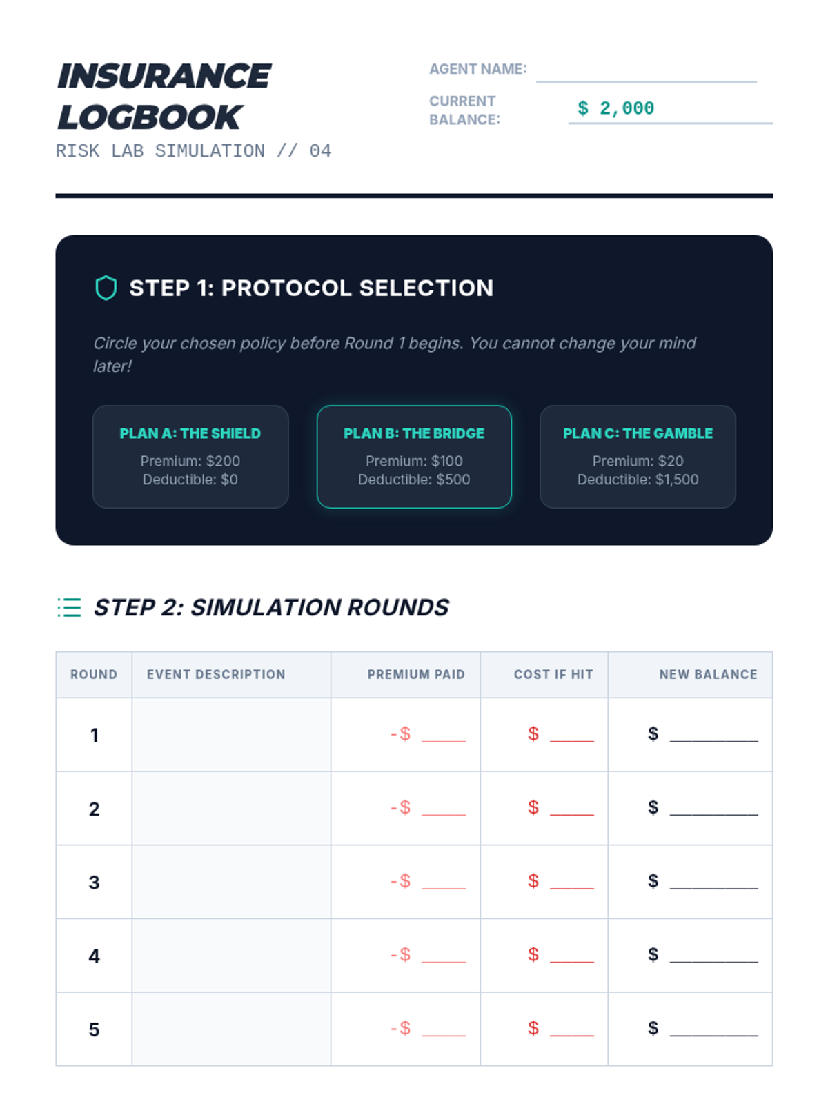 A gamified introduction to insurance, focusing on risk assessment, shared risk pools, and the trade-offs between premiums and deductibles. Students use simulations to understand how insurance provides a financial safety net.