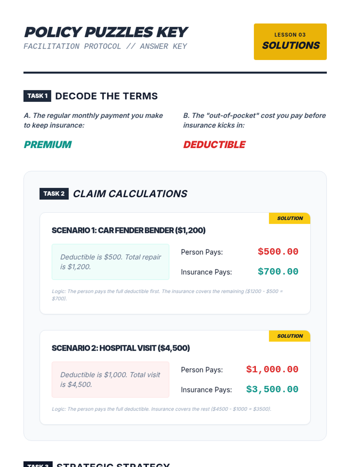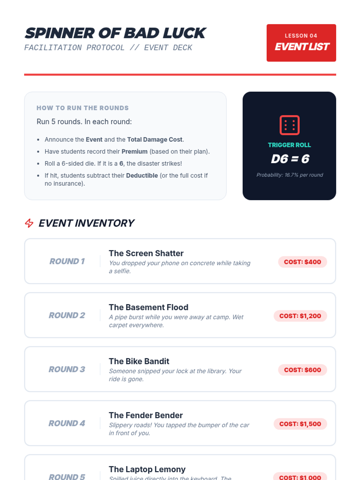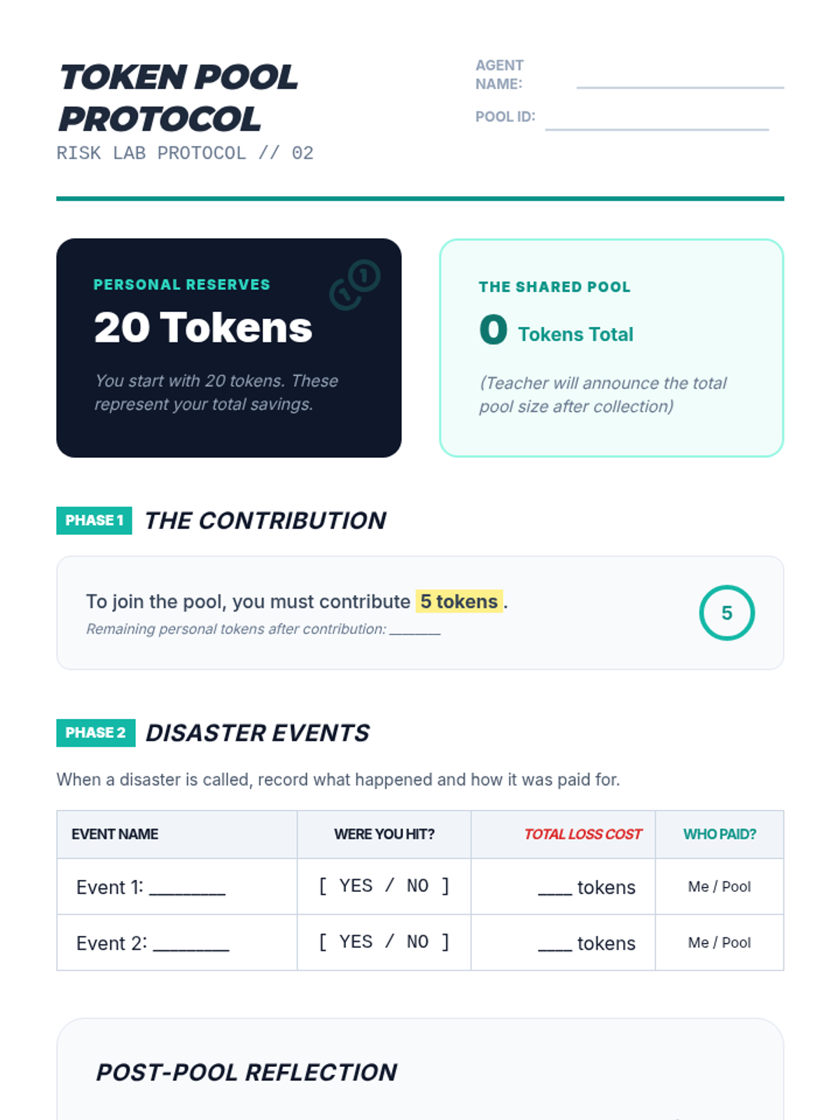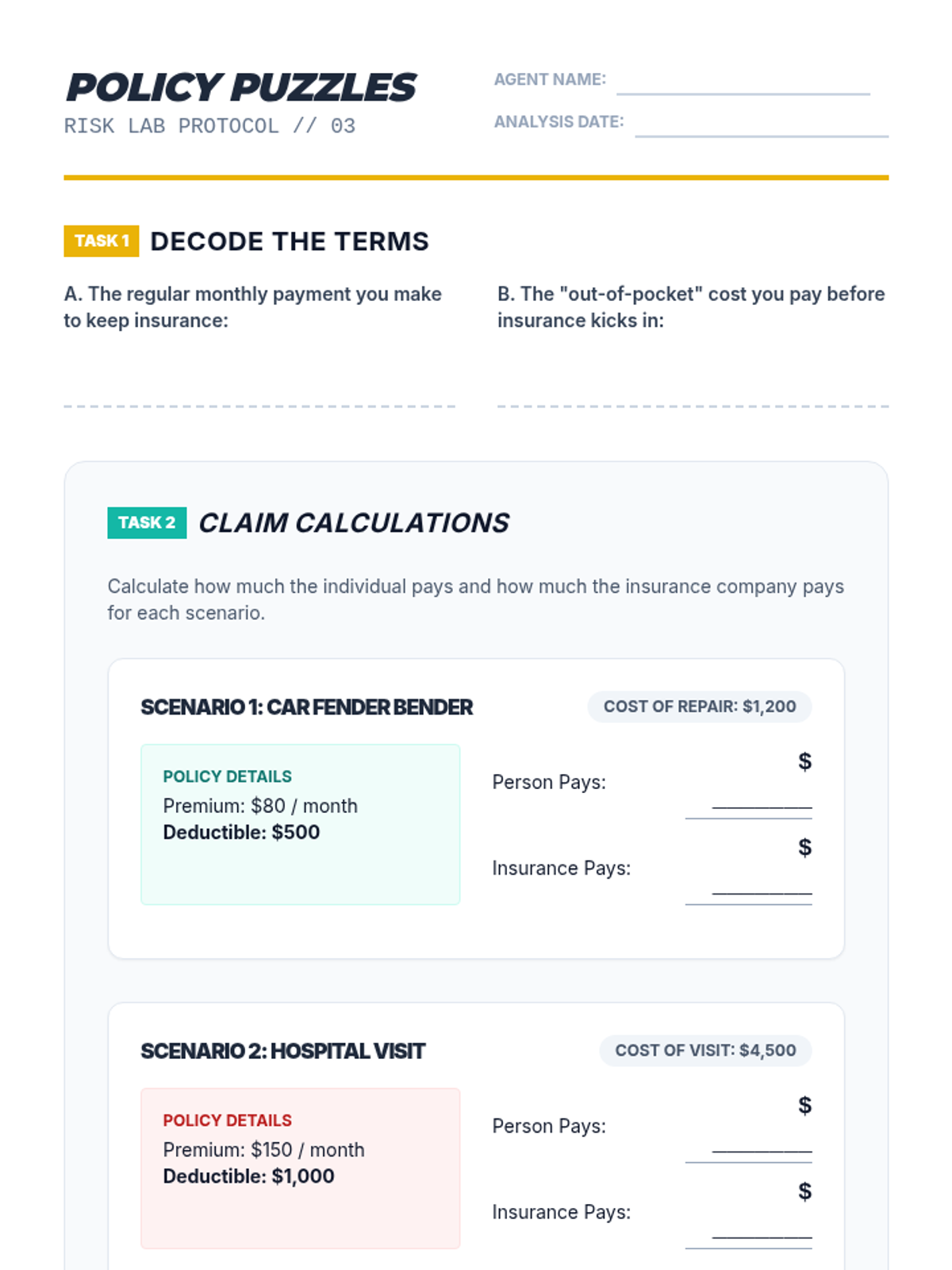 A gamified introduction to insurance, focusing on risk assessment, shared risk pools, and the trade-offs between premiums and deductibles. Students use simulations to understand how insurance provides a financial safety net.