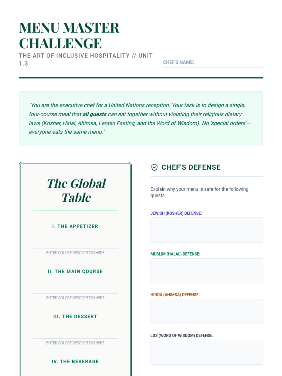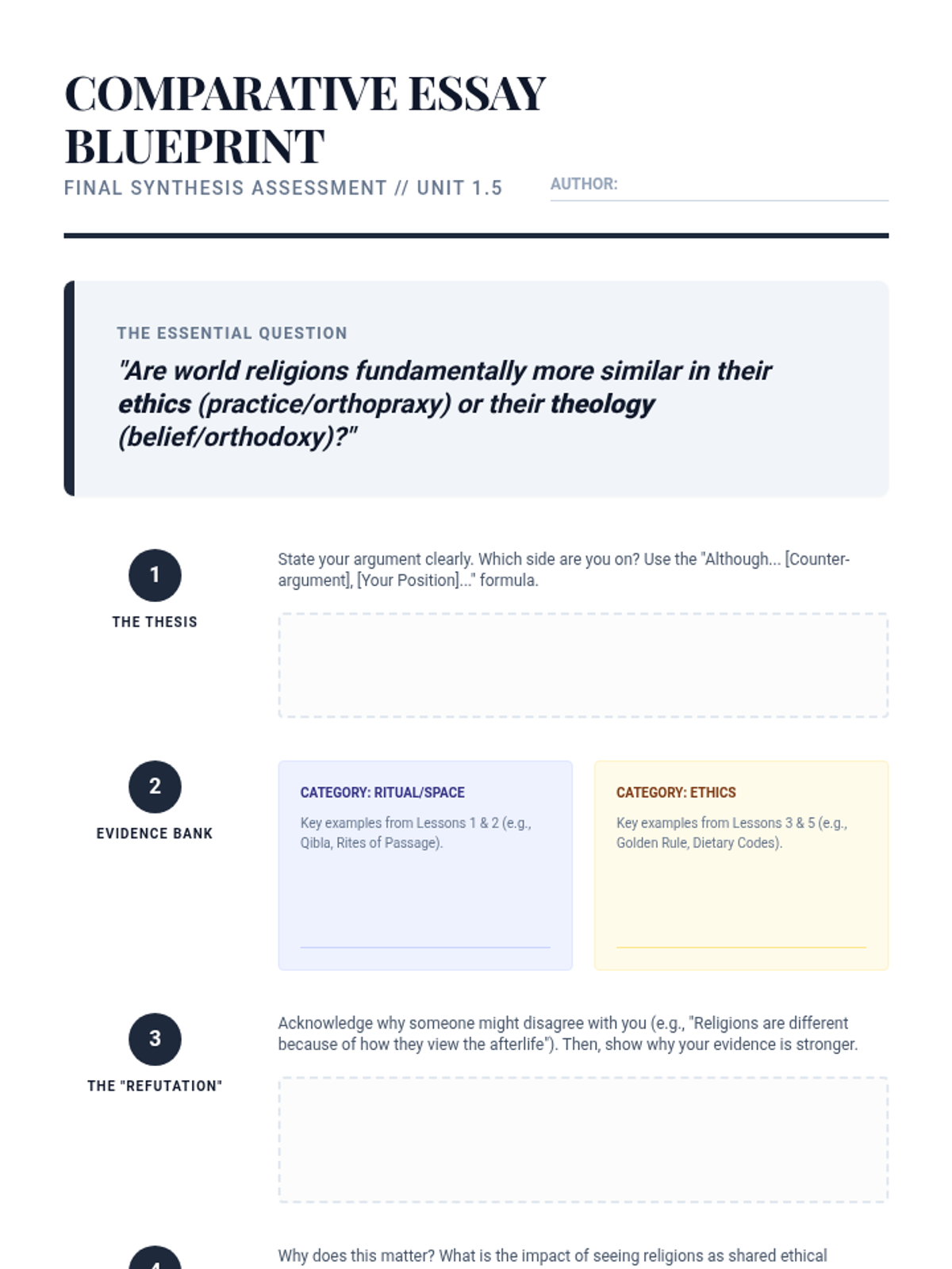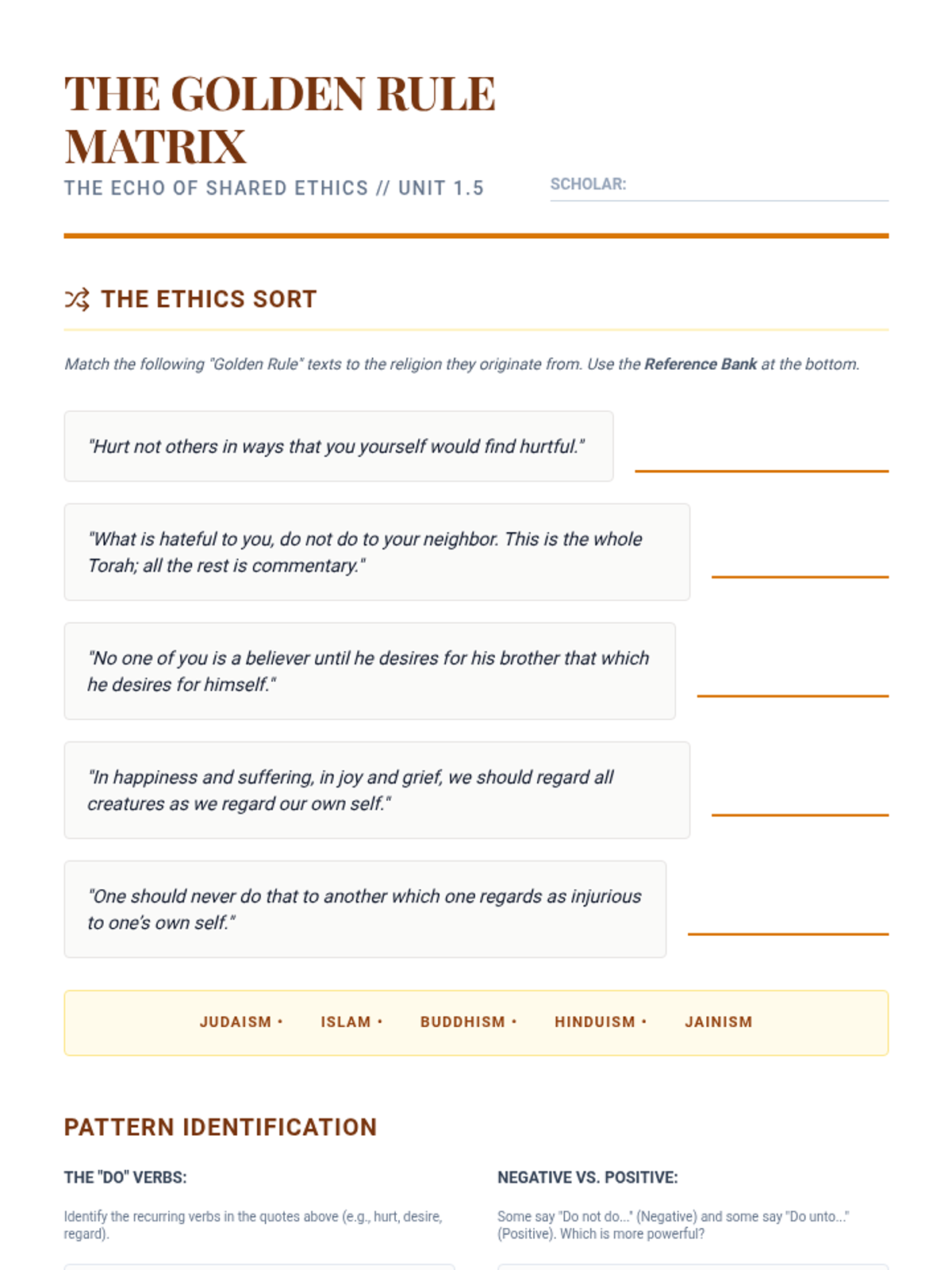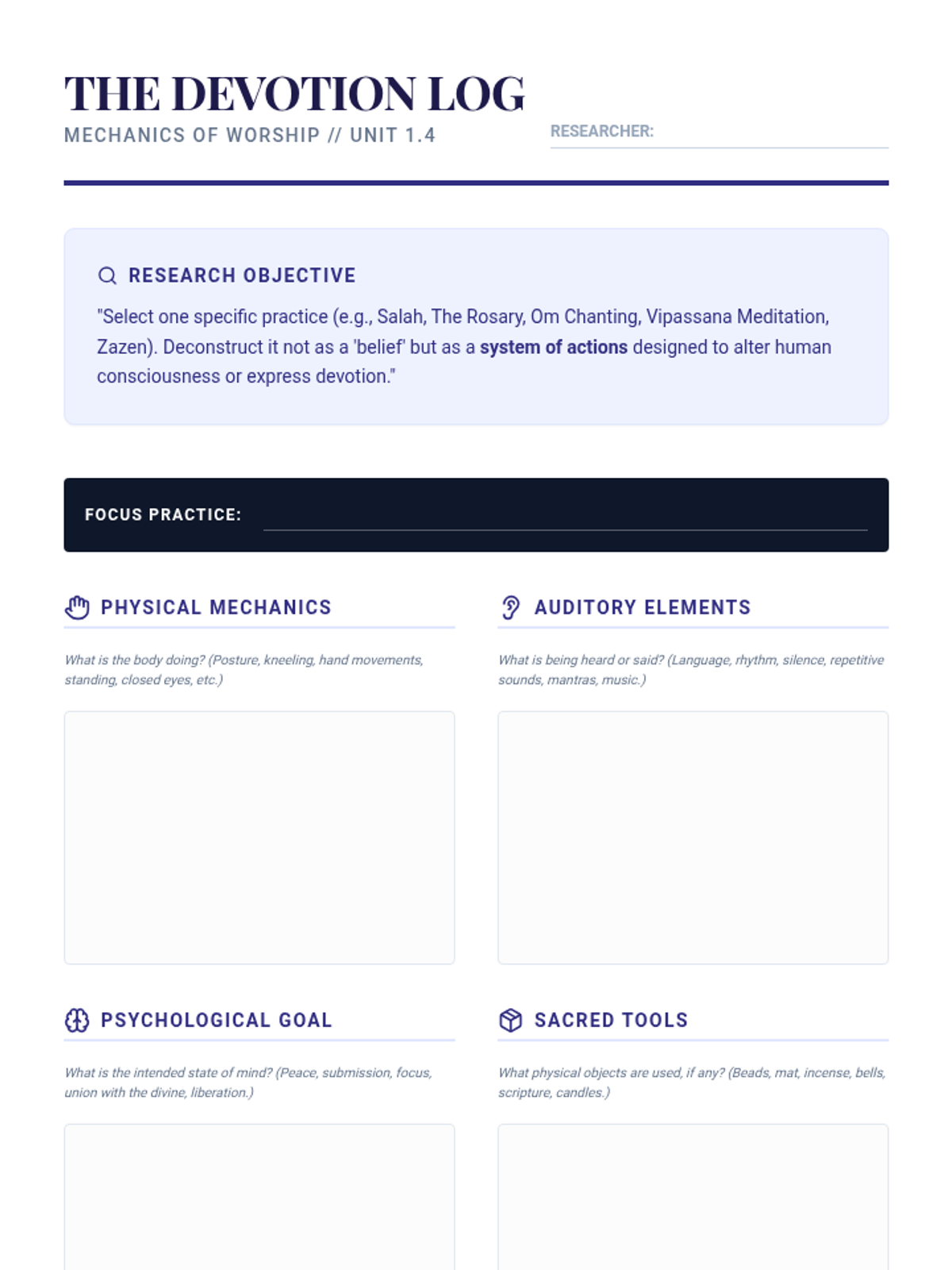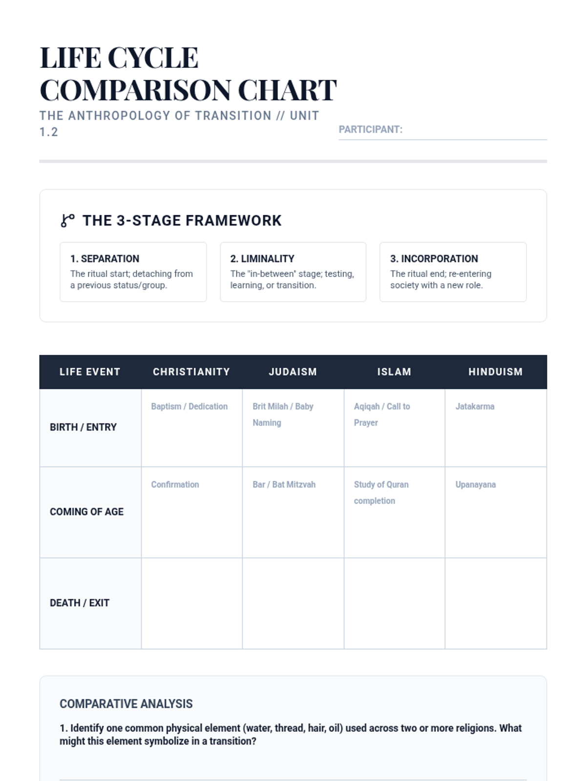 A comparative study of world religions focusing on orthopraxy (practice) through rituals, sacred architecture, dietary codes, and ethical frameworks. Students examine how different faiths address universal human experiences across various cultures.
