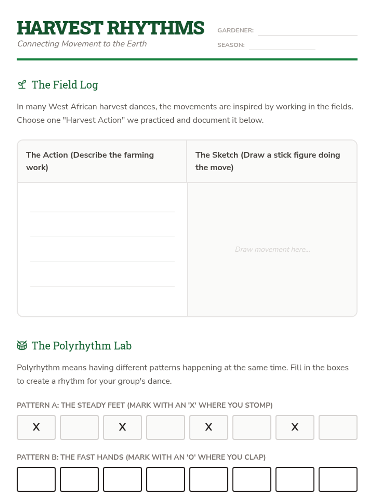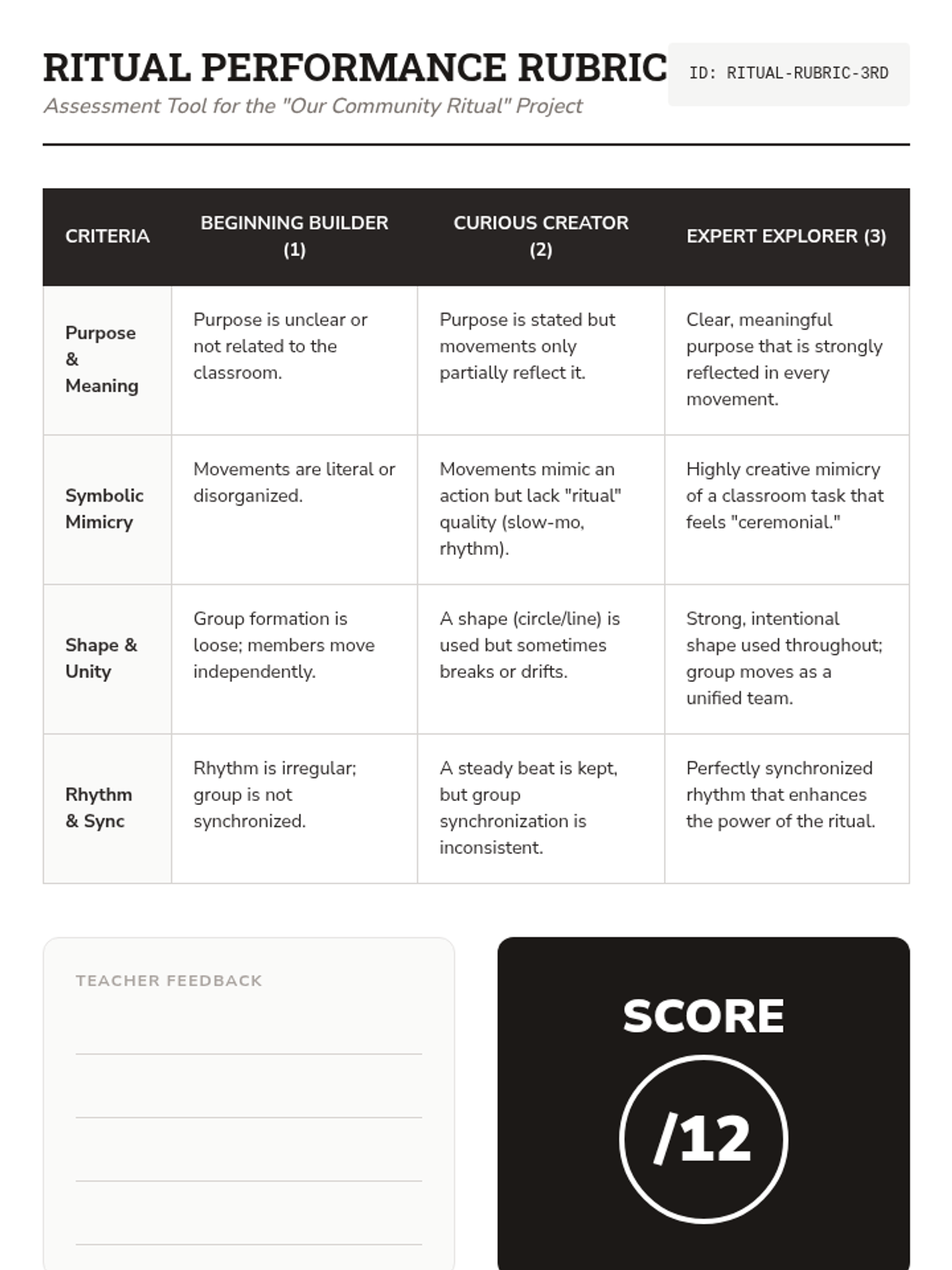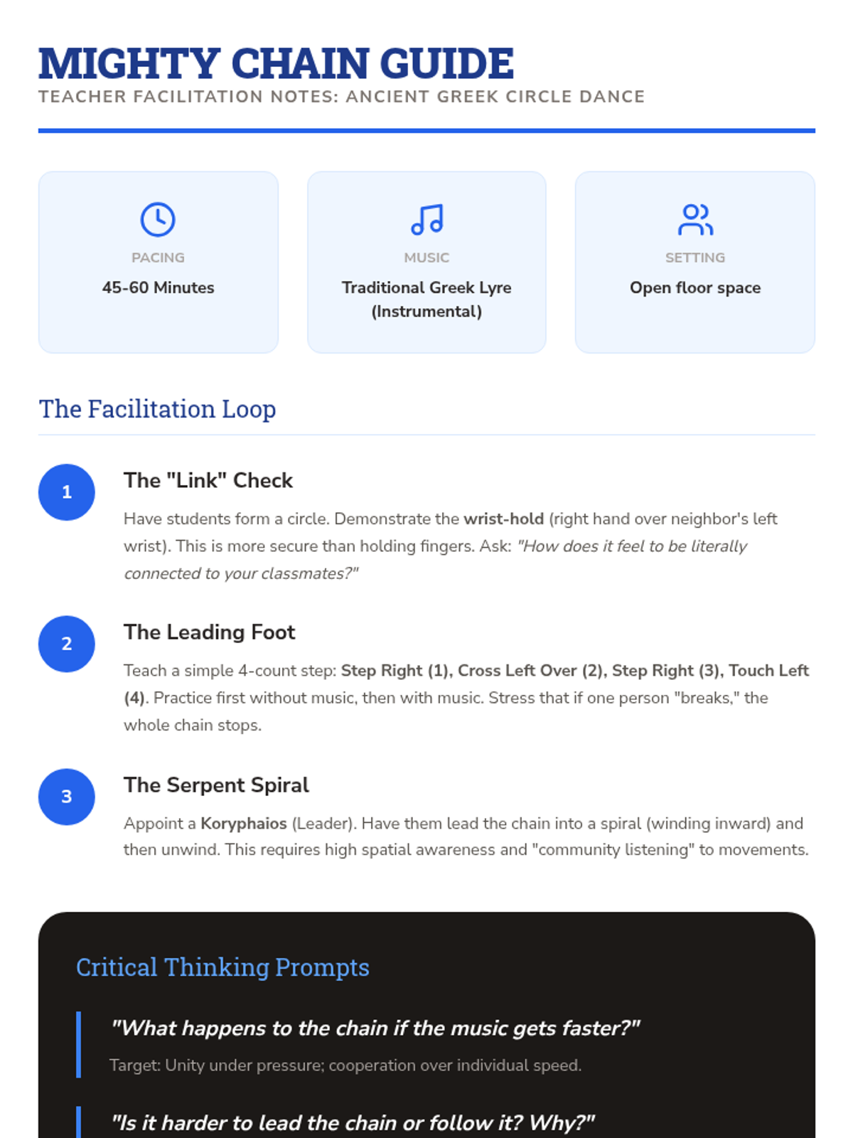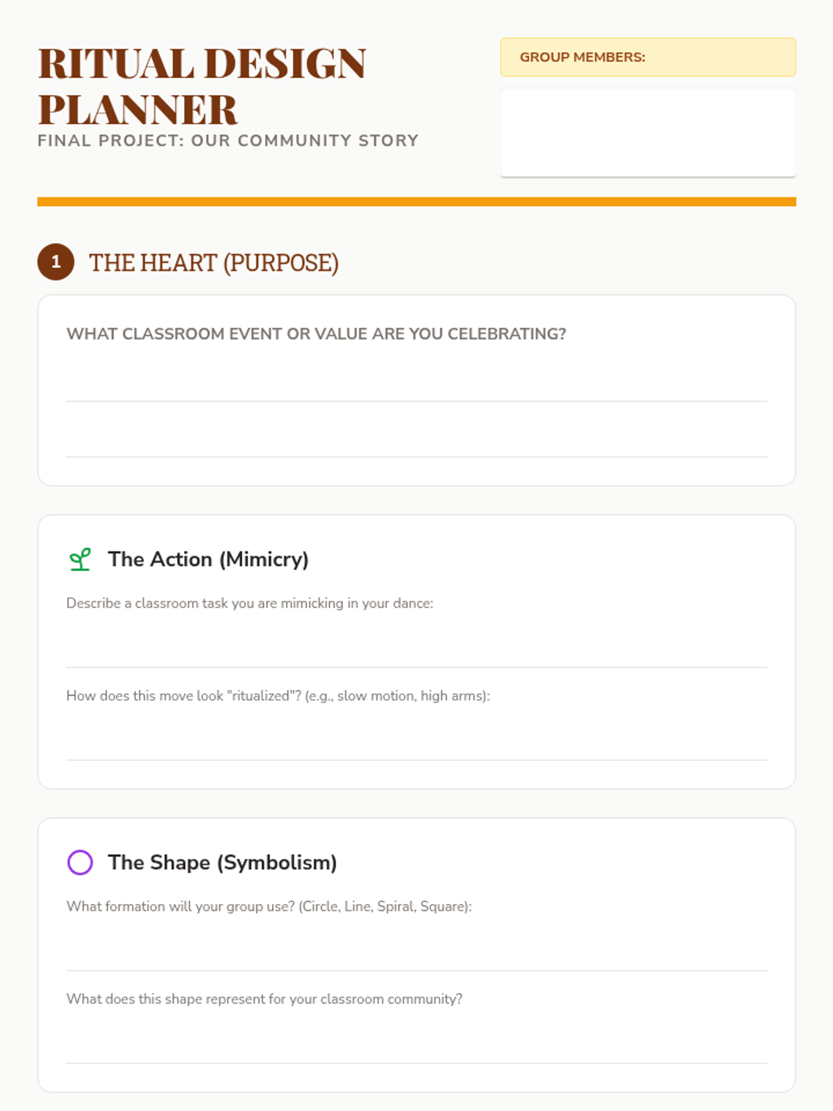 A 3rd-grade dance history sequence exploring the functional origins of dance in ancient and indigenous communities. Students investigate how movement serves rituals of worship, harvest, and community building across Native American, West African, and Ancient Greek cultures.