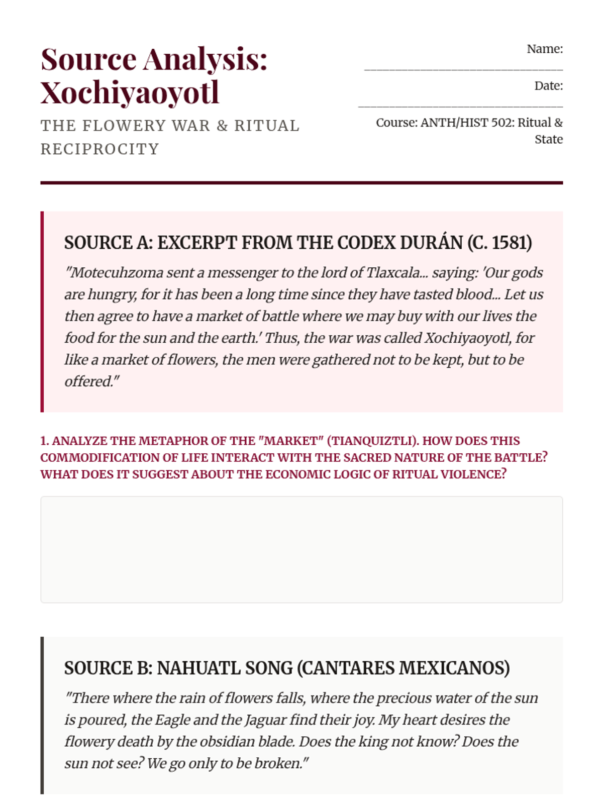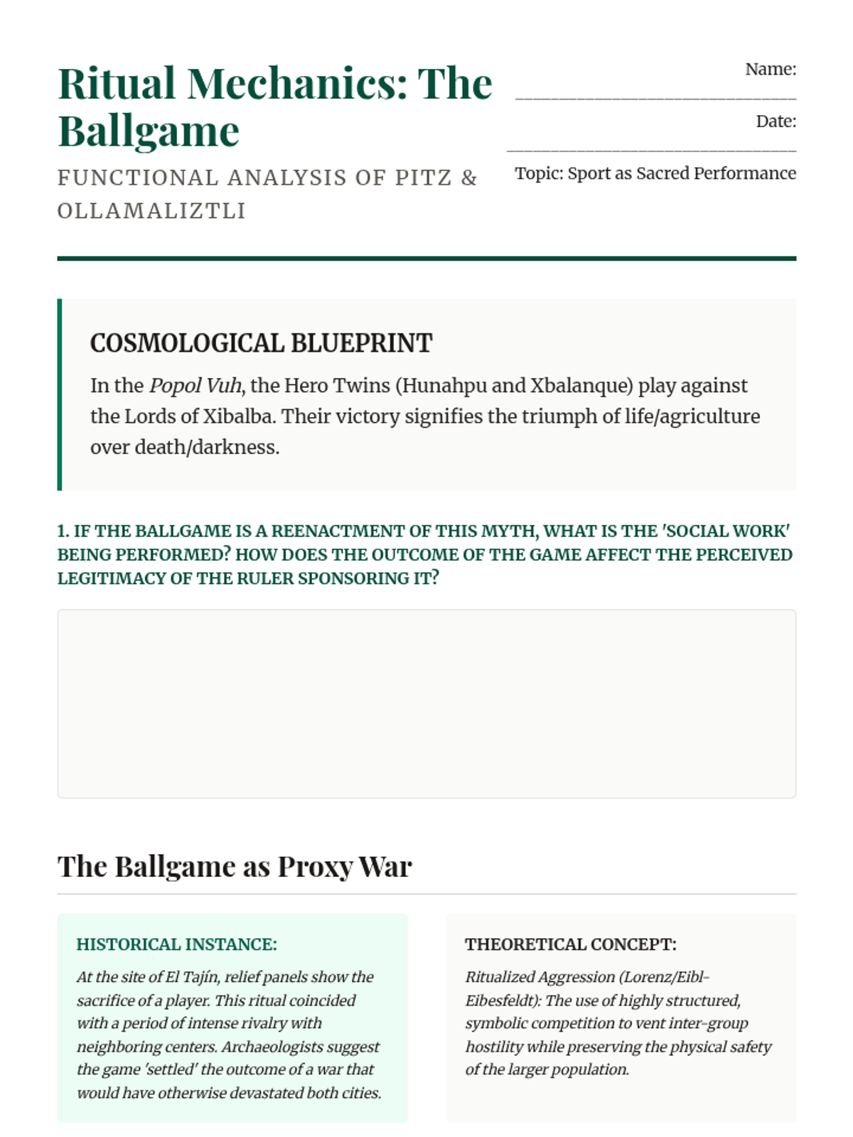 A graduate-level exploration of the functional roles of ritual violence and cosmology in Mesoamerican and South American states. This sequence applies anthropological and historical theories to analyze how sacrifice and performance maintained state power and cosmic order.