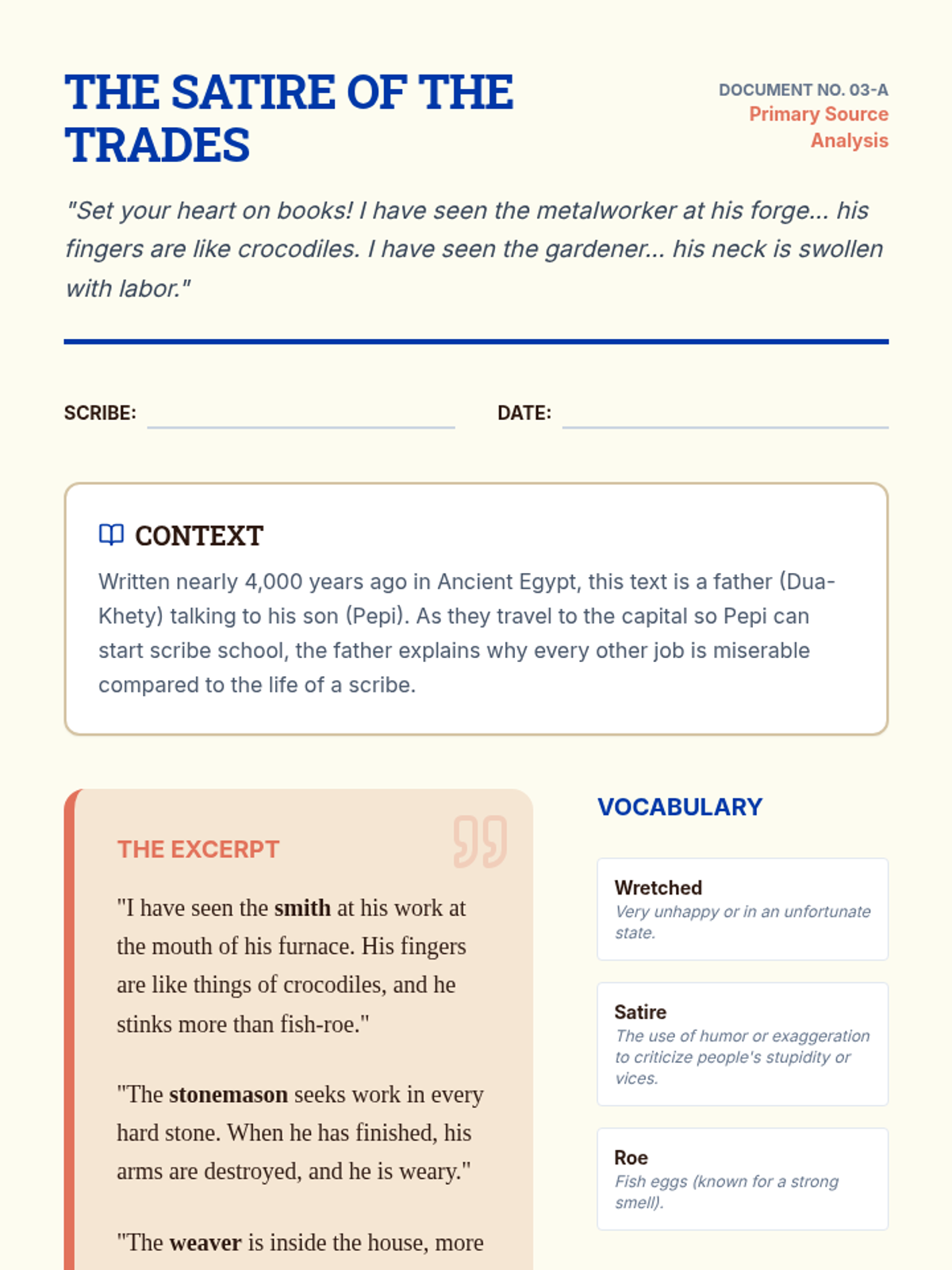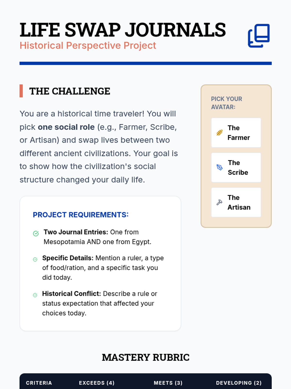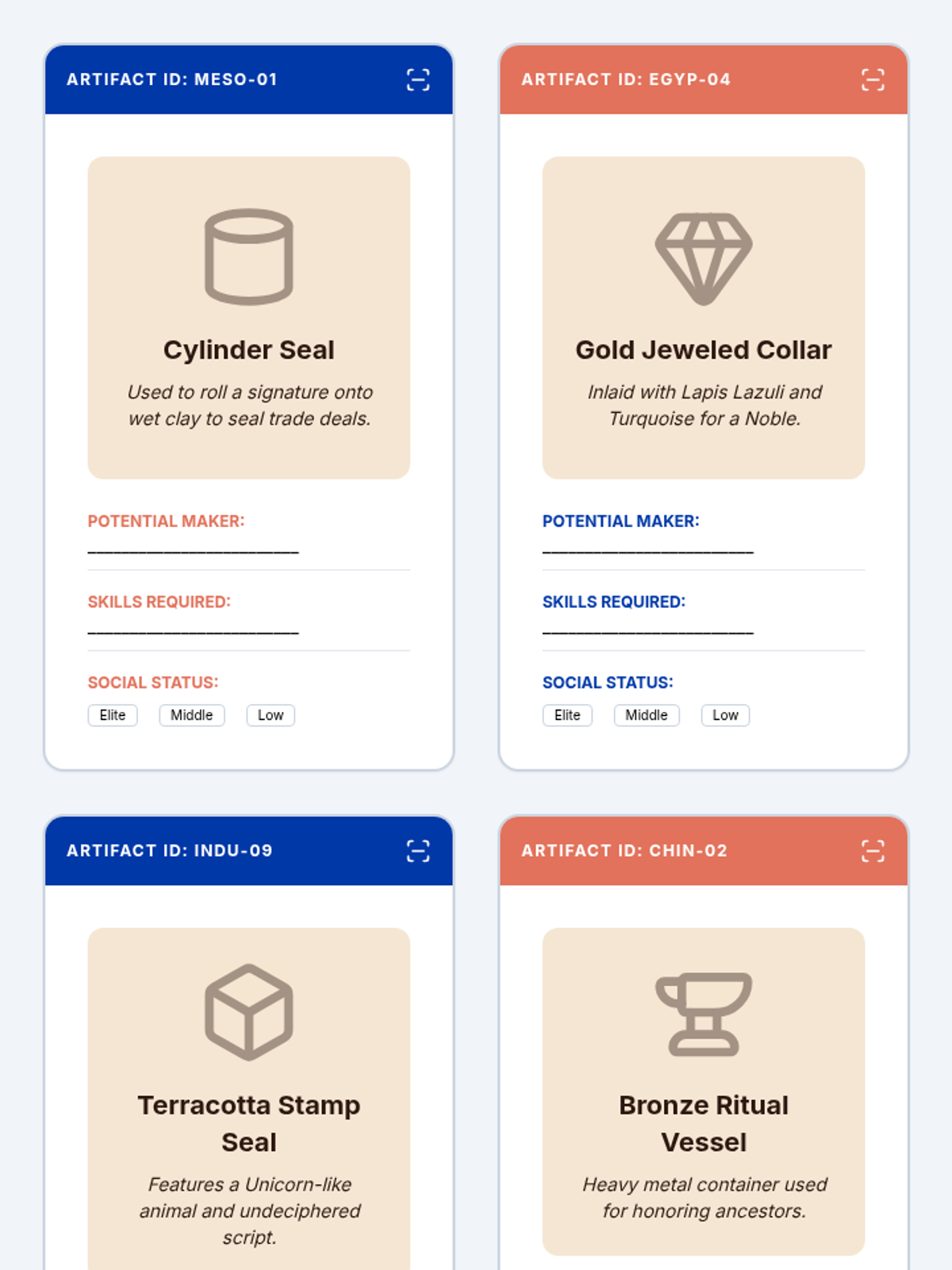Students explore and compare the social hierarchies of ancient Mesopotamia, Egypt, the Indus Valley, and China, analyzing how power, labor, and status shaped daily life and civilization.