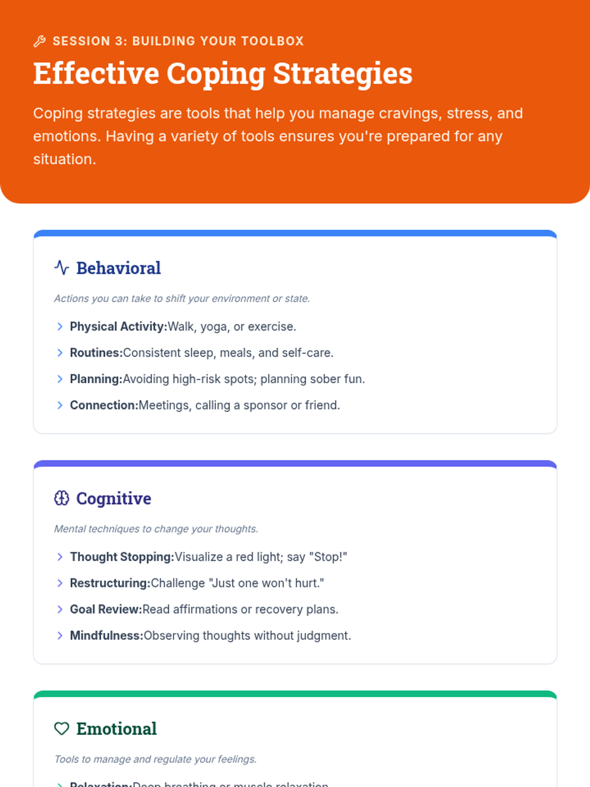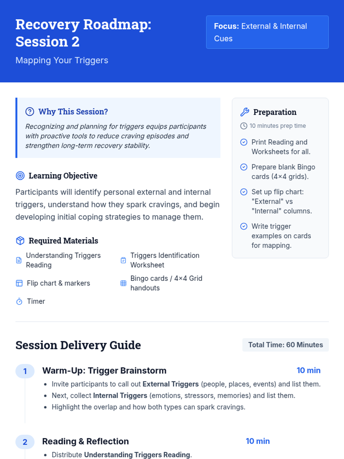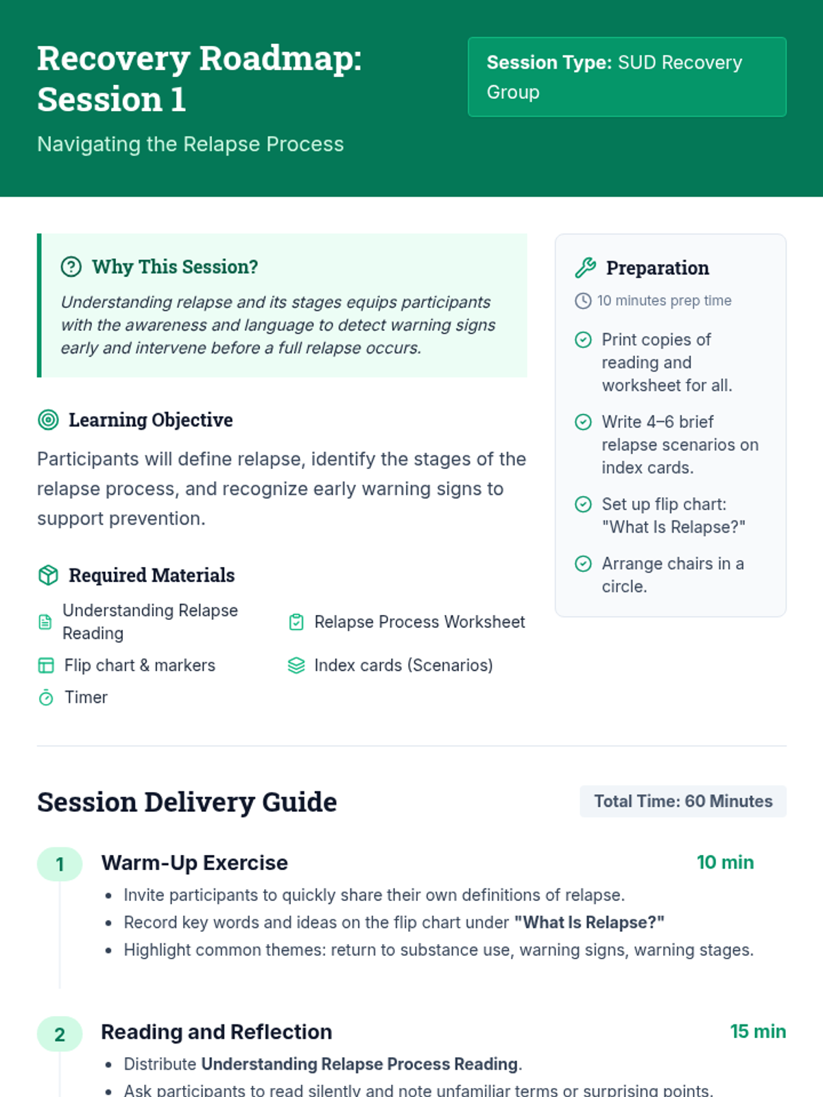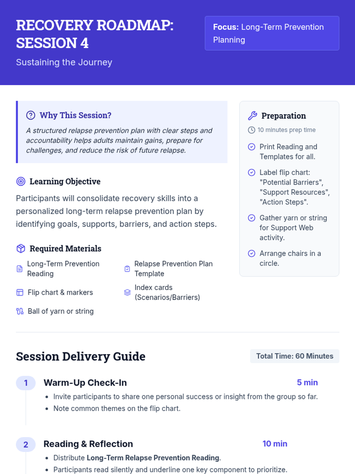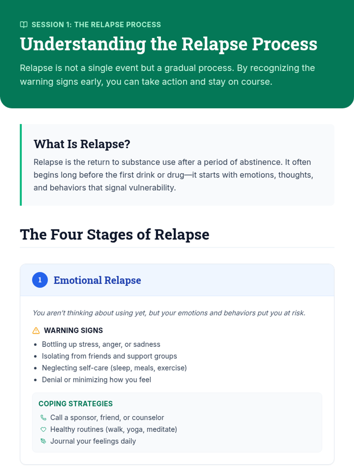 A 4-session relapse prevention group for adults in SUD recovery, focusing on understanding relapse, identifying triggers, building coping strategies, and creating long-term support plans. This program helps participants develop skills to maintain sobriety through interactive readings, discussions, activities, and games.