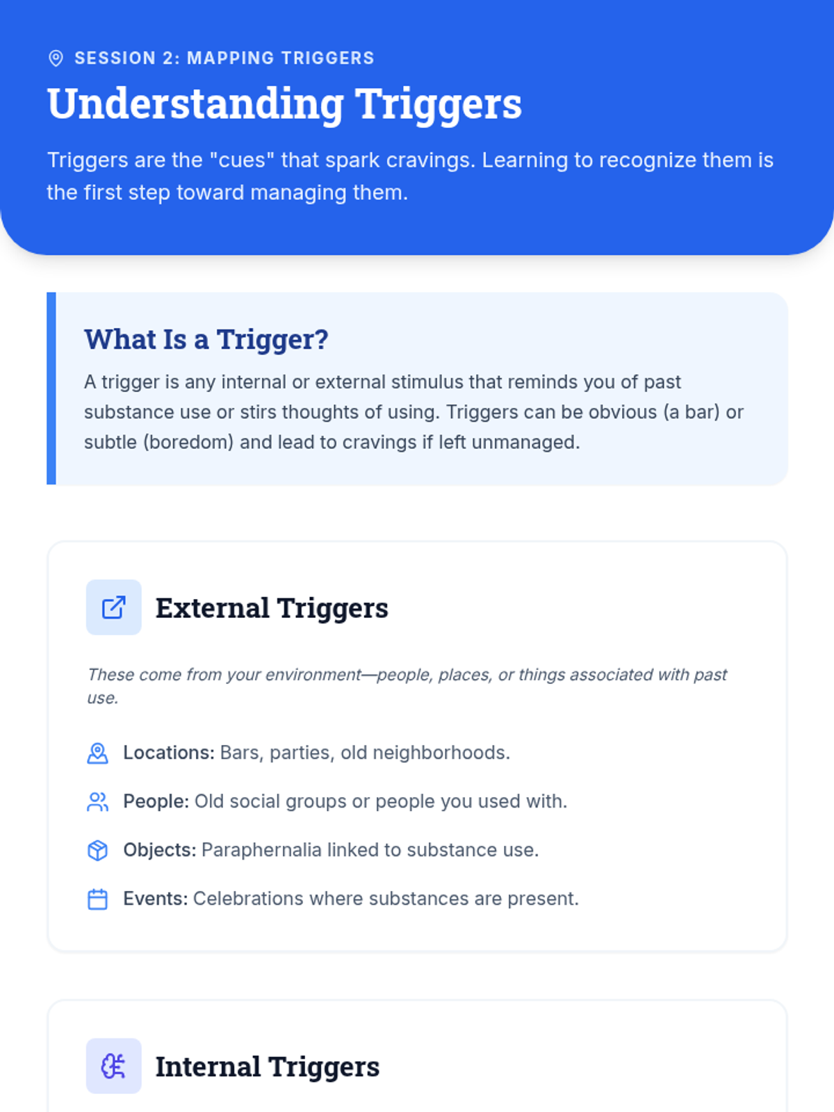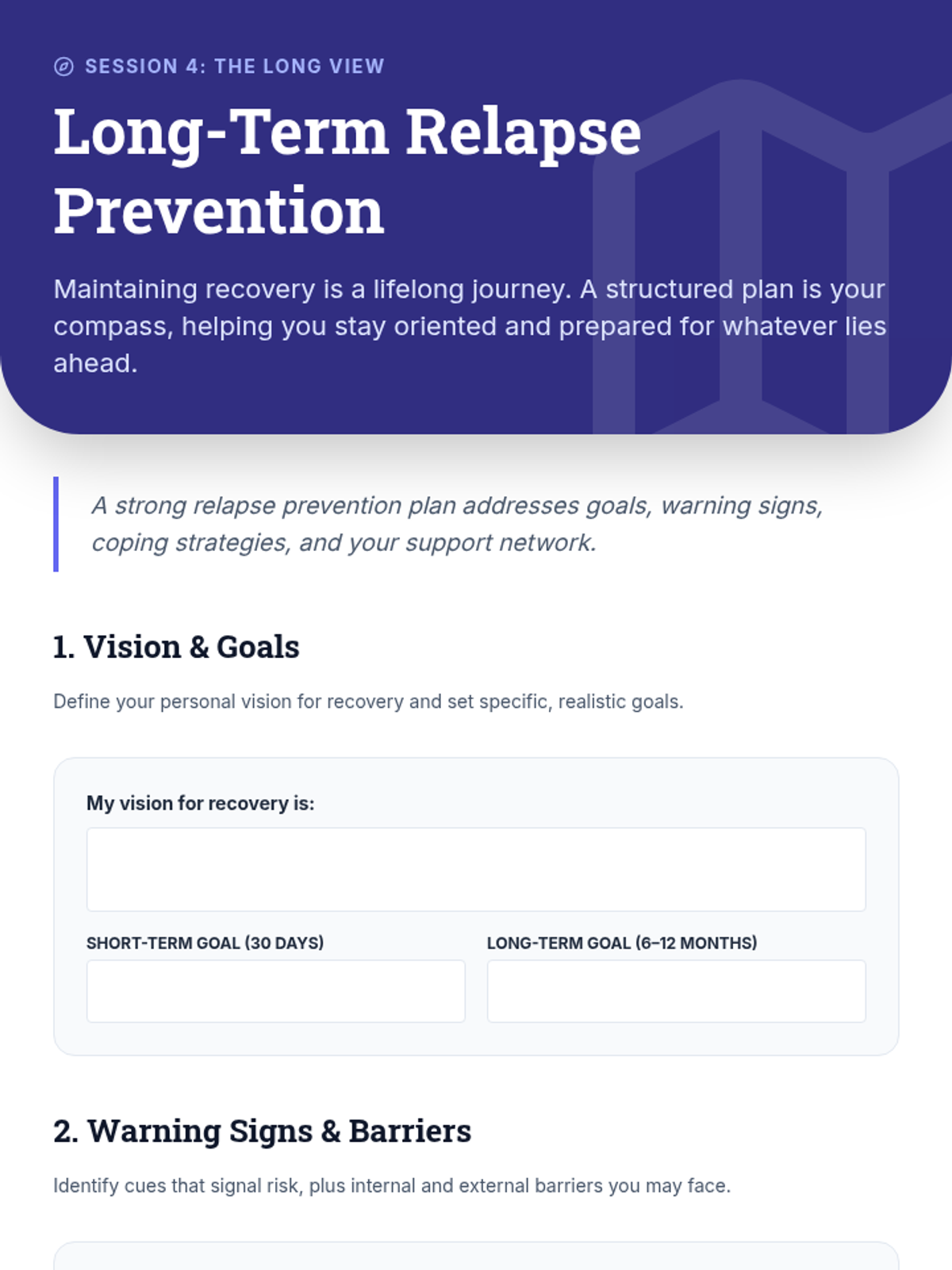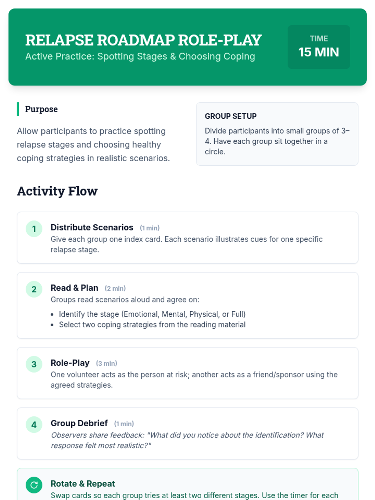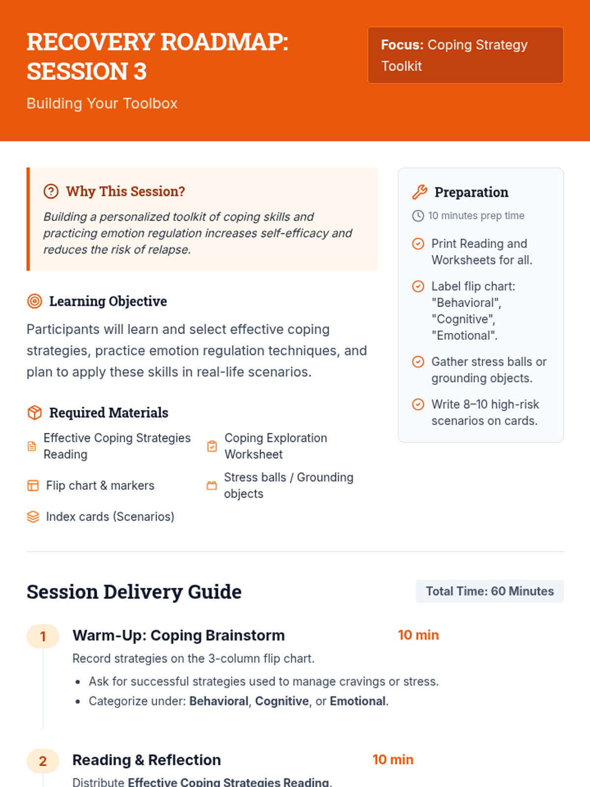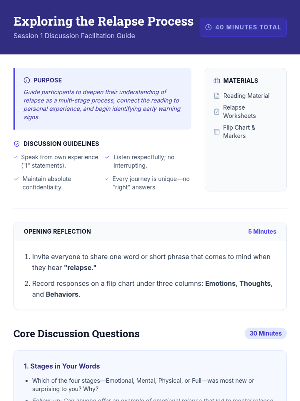 A 4-session relapse prevention group for adults in SUD recovery, focusing on understanding relapse, identifying triggers, building coping strategies, and creating long-term support plans. This program helps participants develop skills to maintain sobriety through interactive readings, discussions, activities, and games.
