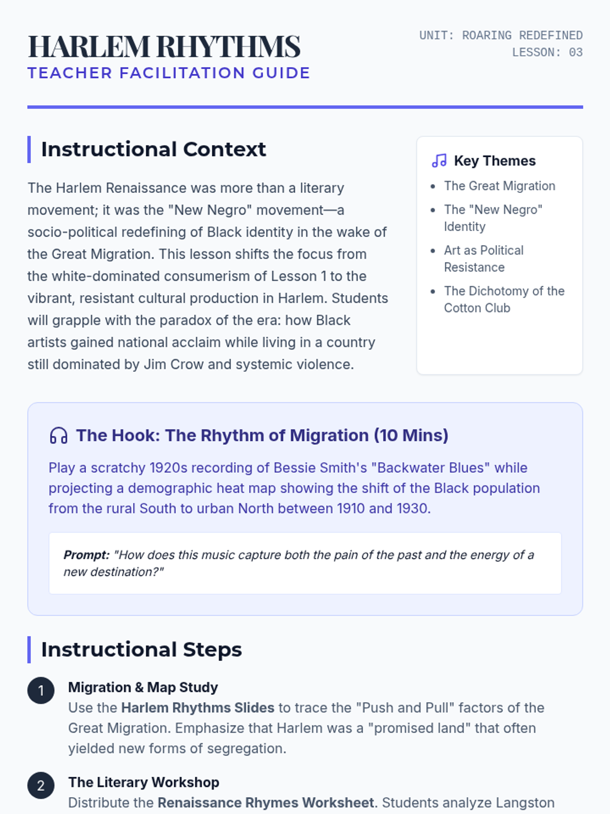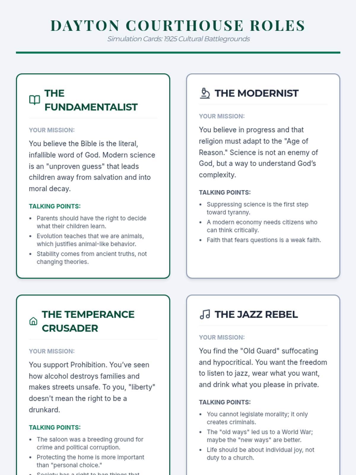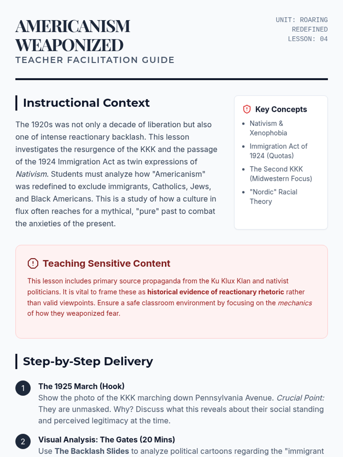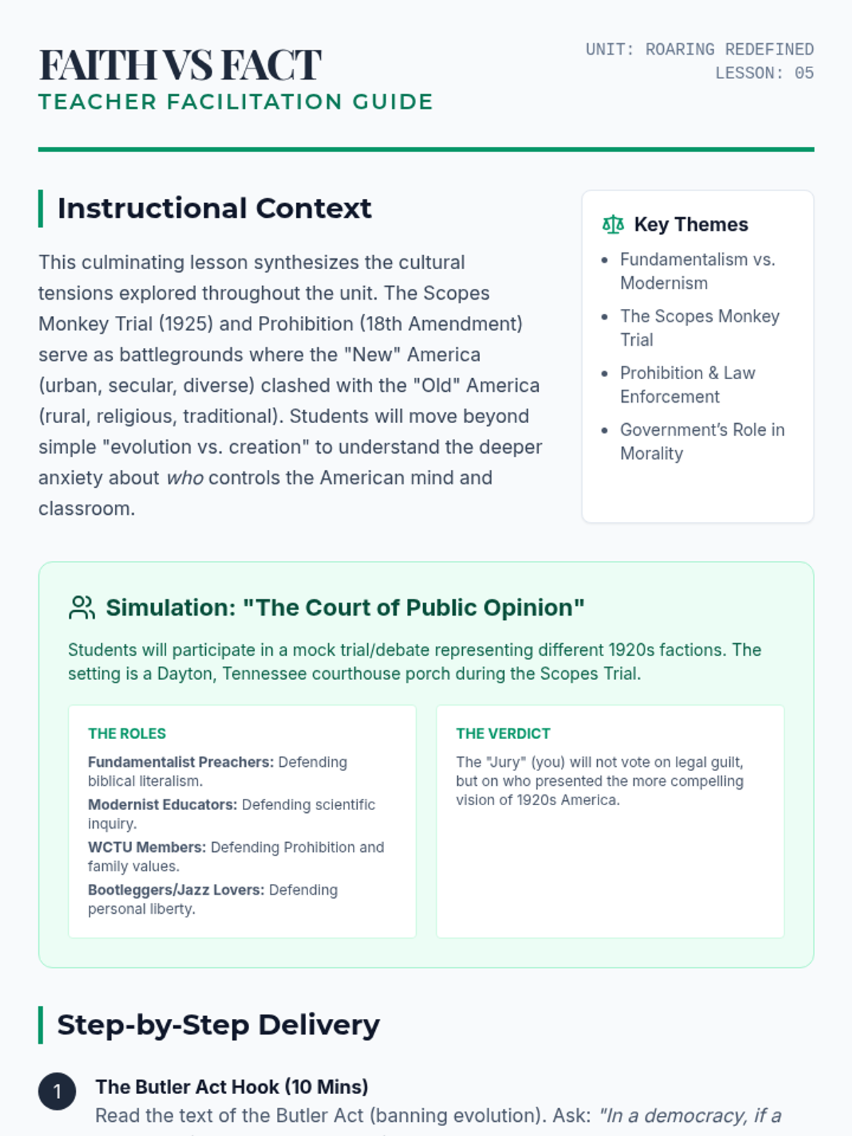 This advanced 12th-grade sequence explores the 1920s as the birthplace of modern American cultural conflicts. Students analyze the tension between emerging modernism—driven by consumerism, jazz, and changing gender roles—and the reactionary responses of traditionalism, nativism, and religious fundamentalism.