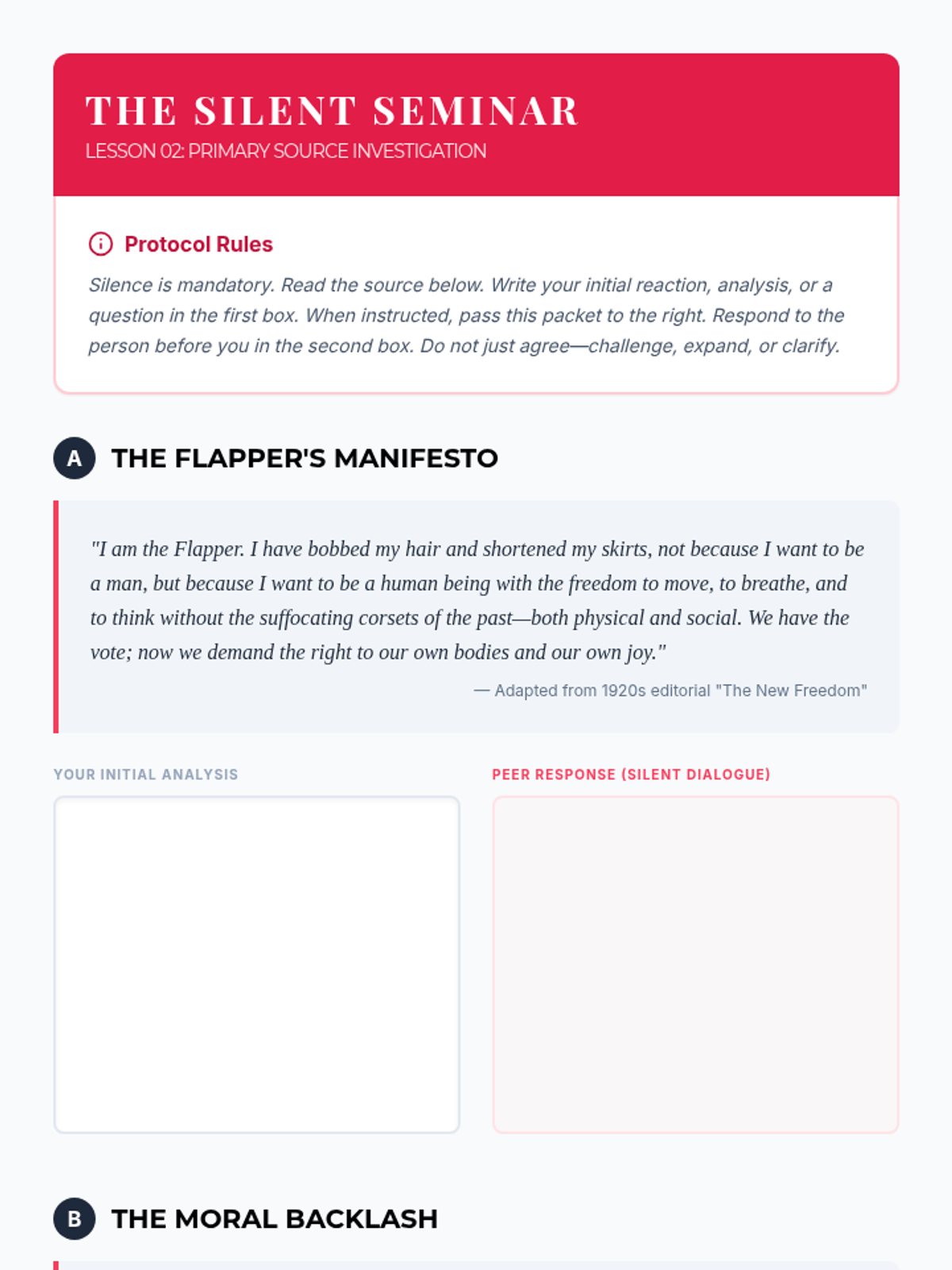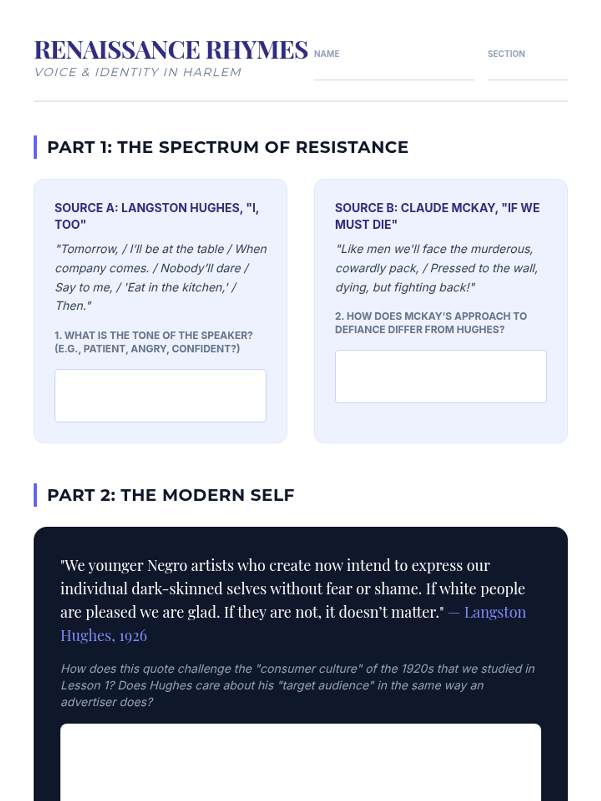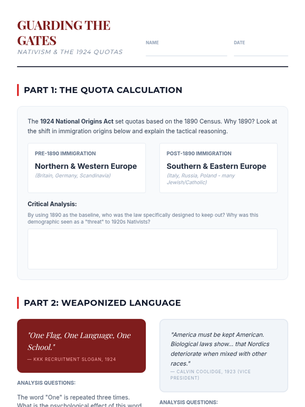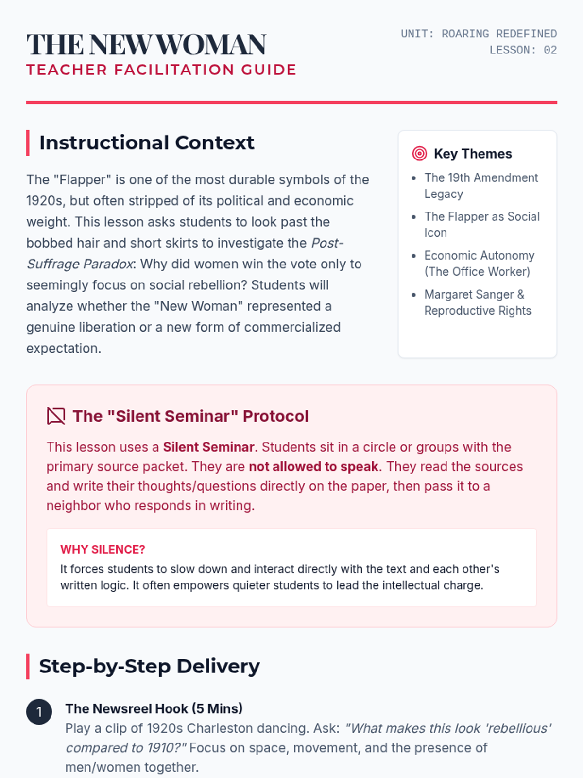 This advanced 12th-grade sequence explores the 1920s as the birthplace of modern American cultural conflicts. Students analyze the tension between emerging modernism—driven by consumerism, jazz, and changing gender roles—and the reactionary responses of traditionalism, nativism, and religious fundamentalism.