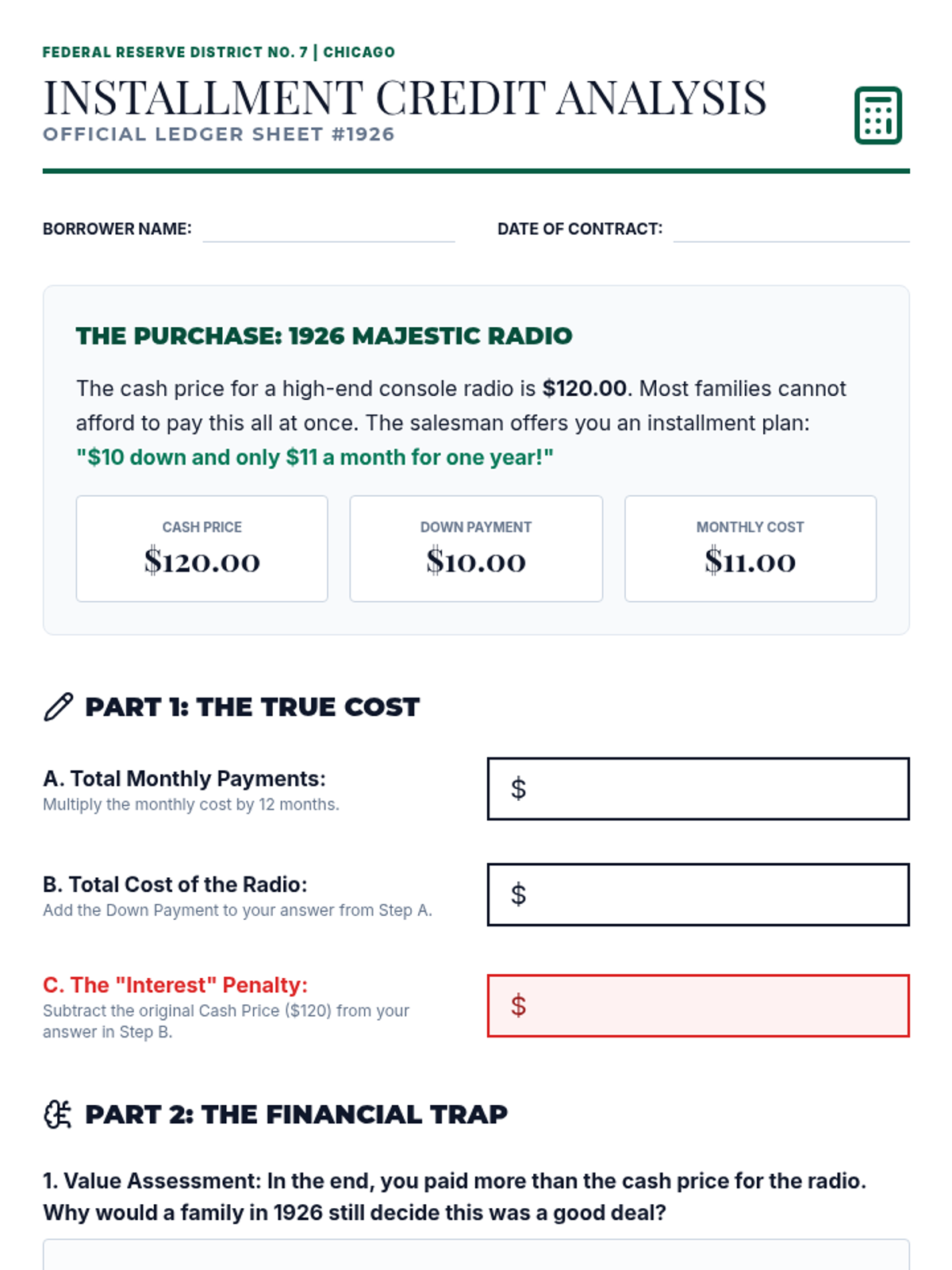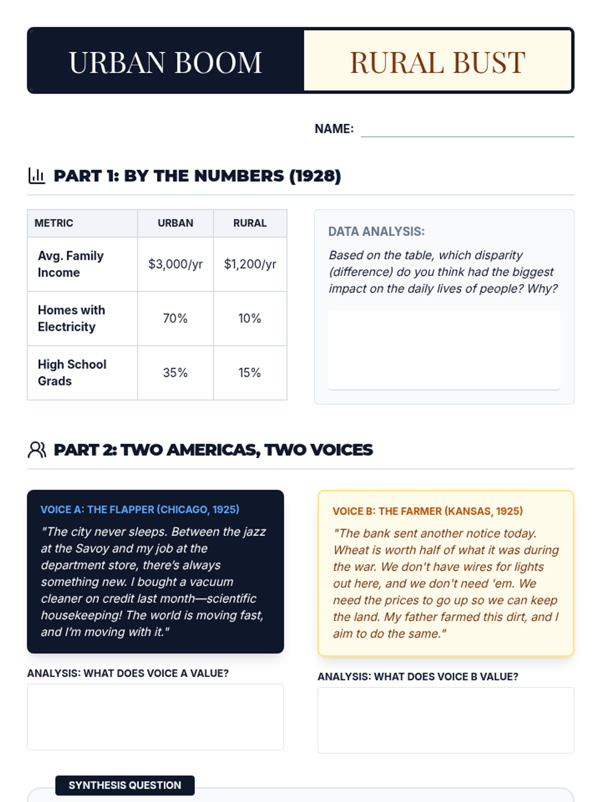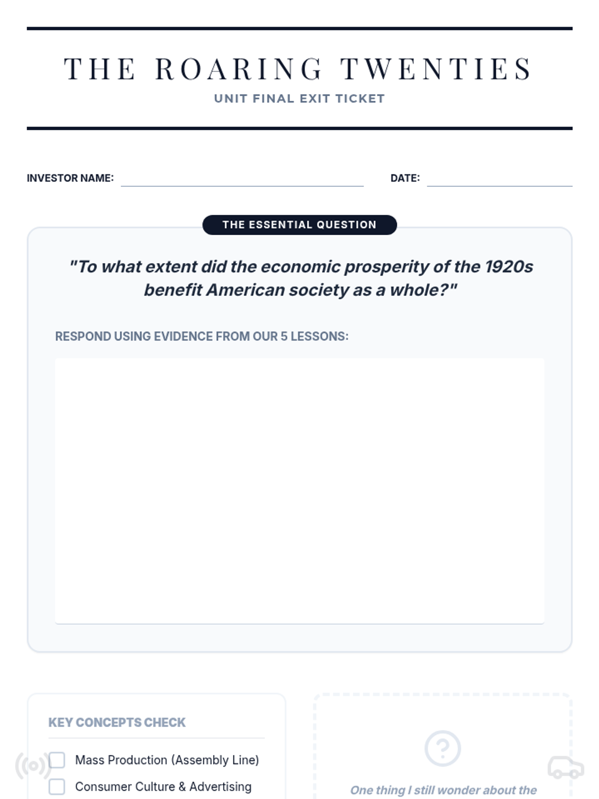 An exploration of the 1920s economic boom, focusing on mass production, consumerism, credit, and the eventual market crash. Students analyze the sustainability of this period's prosperity and its impact on various social groups.