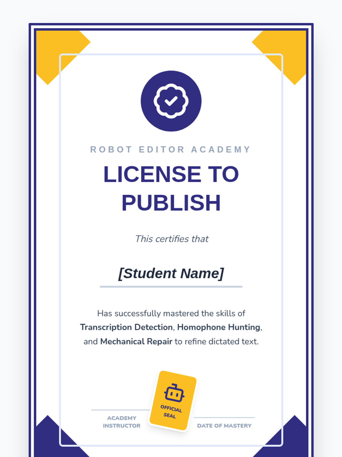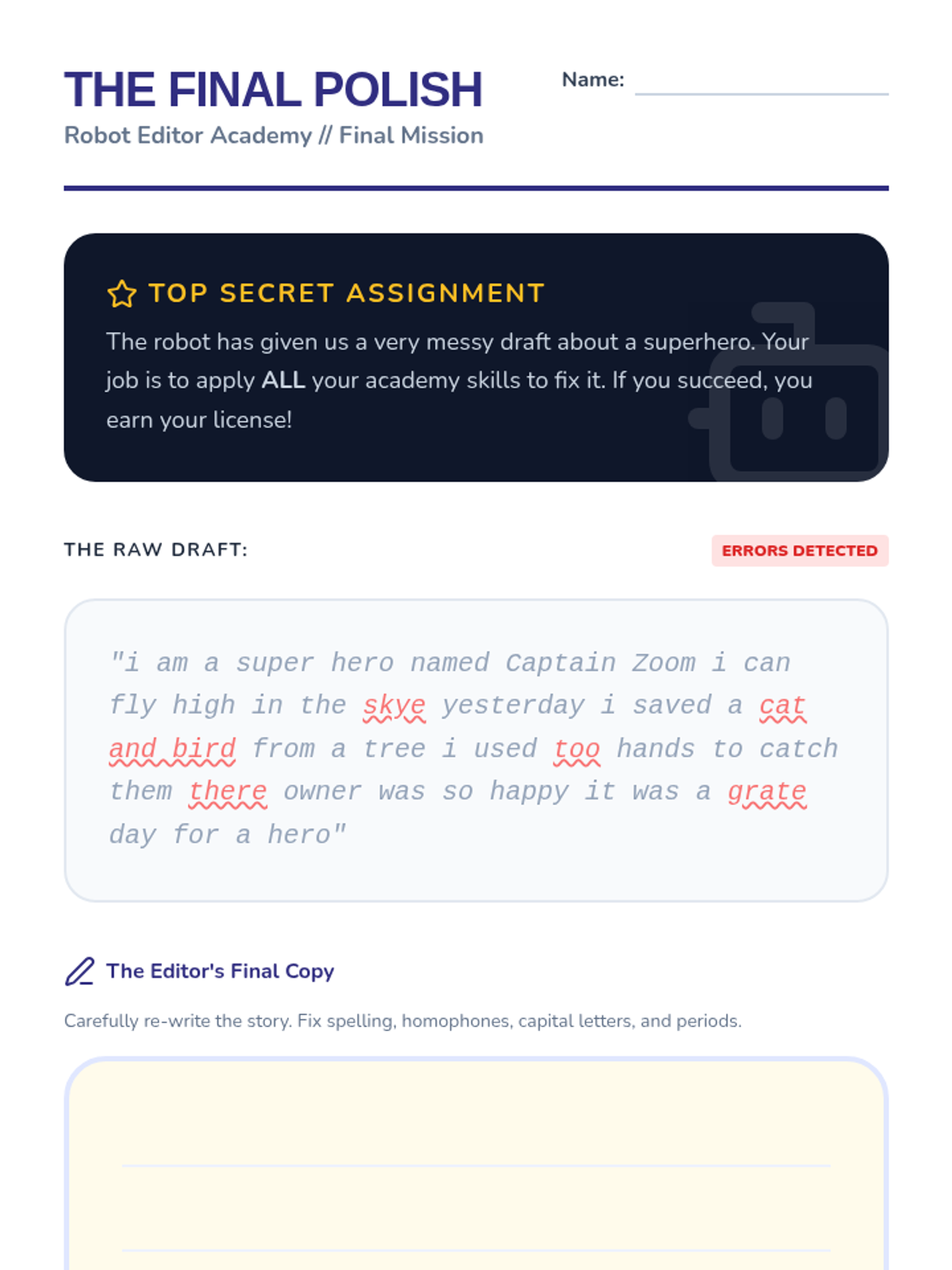 A 5-lesson sequence for 3rd graders on editing and refining speech-to-text dictation. Students take on the role of 'Robot Editors' to detect errors, fix homophones, and apply punctuation to dictated drafts.
