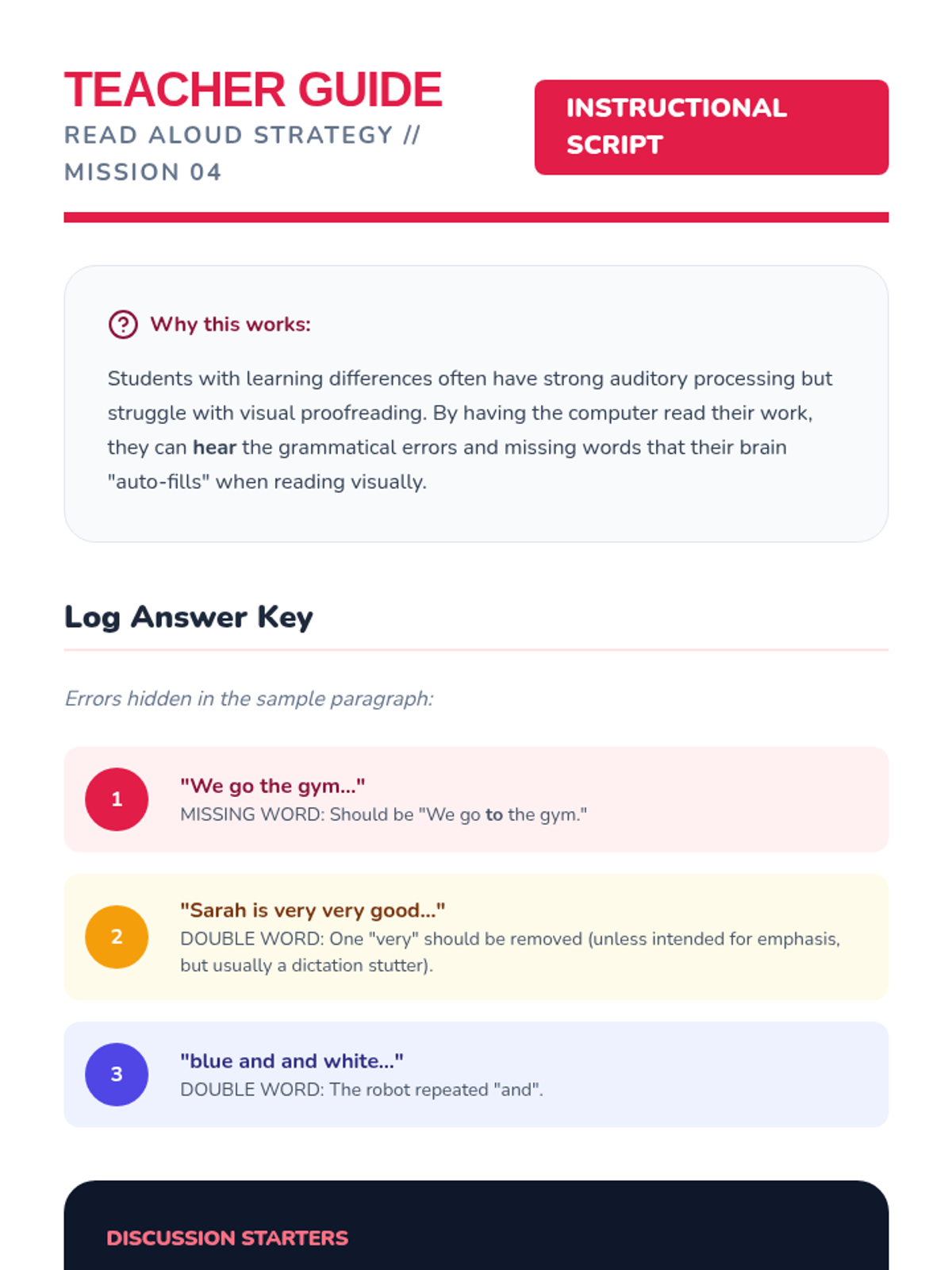 This sequence teaches 3rd-grade students how to use Text-to-Speech (TTS) as a powerful proofreading tool. Students transition from identifying errors in provided texts to applying auditory feedback strategies to their own writing, focusing on missing words, sentence flow, and homophones.