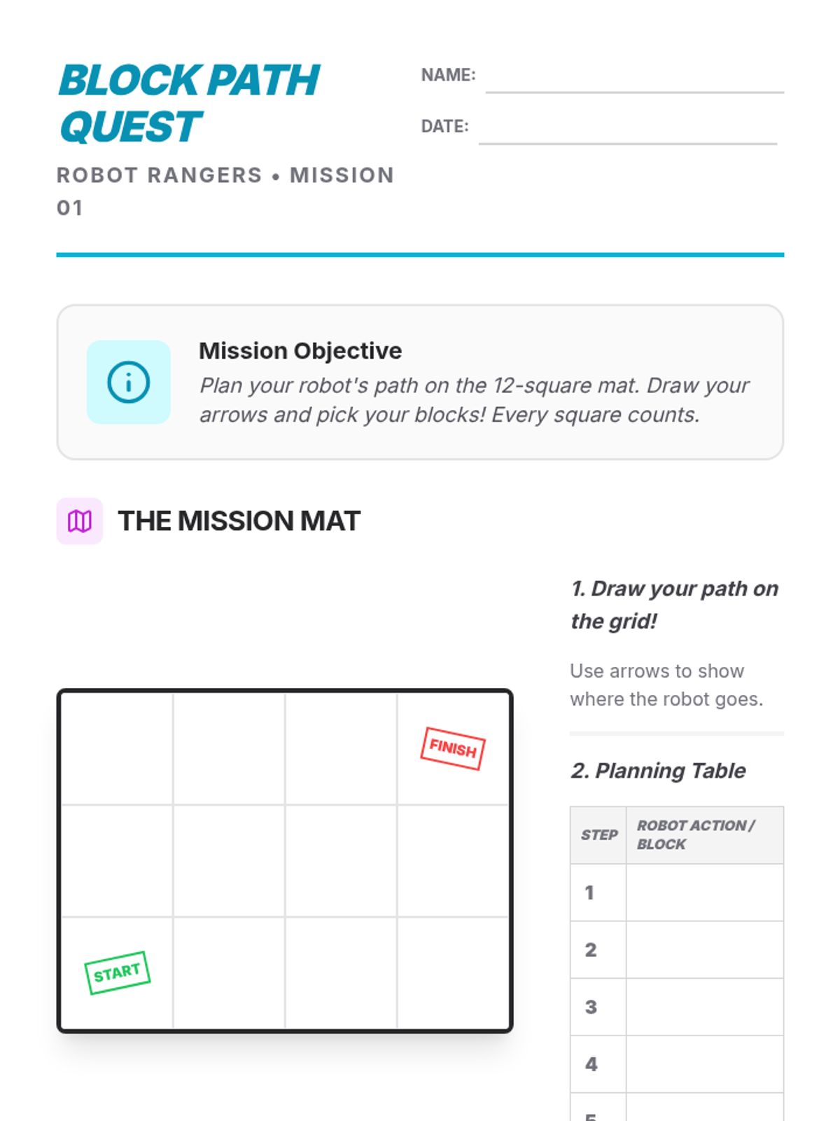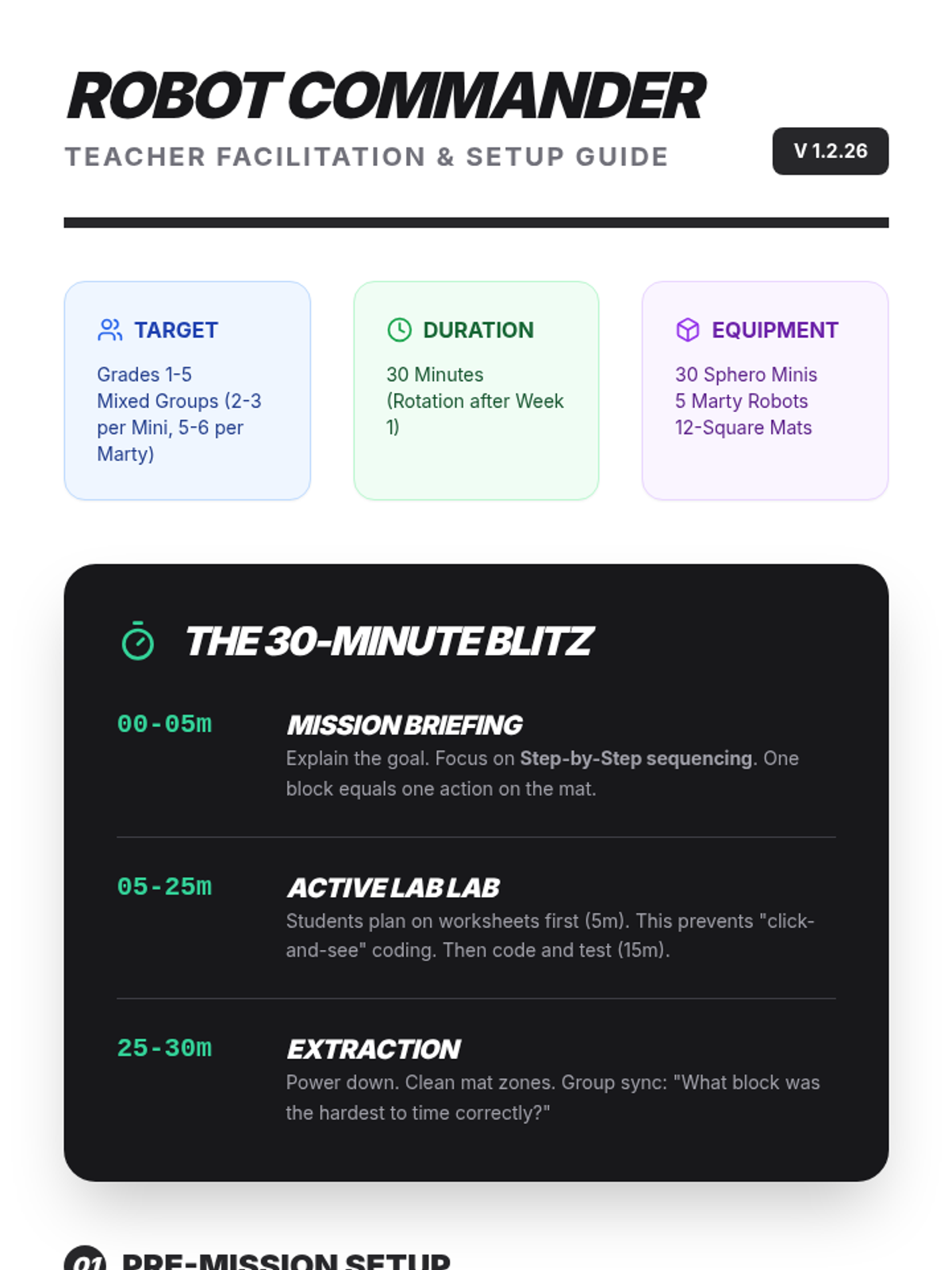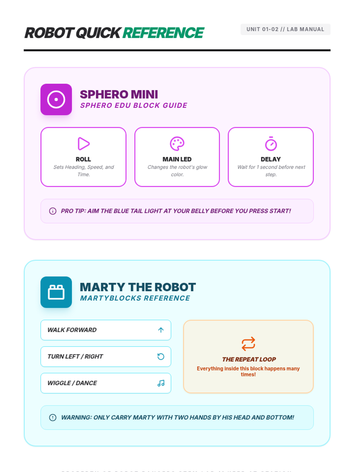 A comprehensive STEM unit introducing block coding and robotics using Marty the Robot and Sphero Minis. Students explore sequencing, loops, and color-based commands across two weeks of rotating hands-on lab sessions.