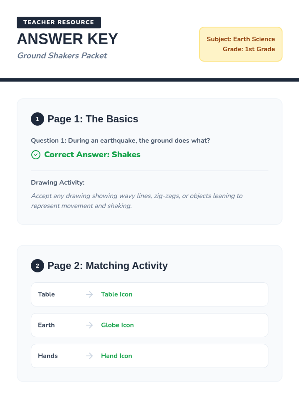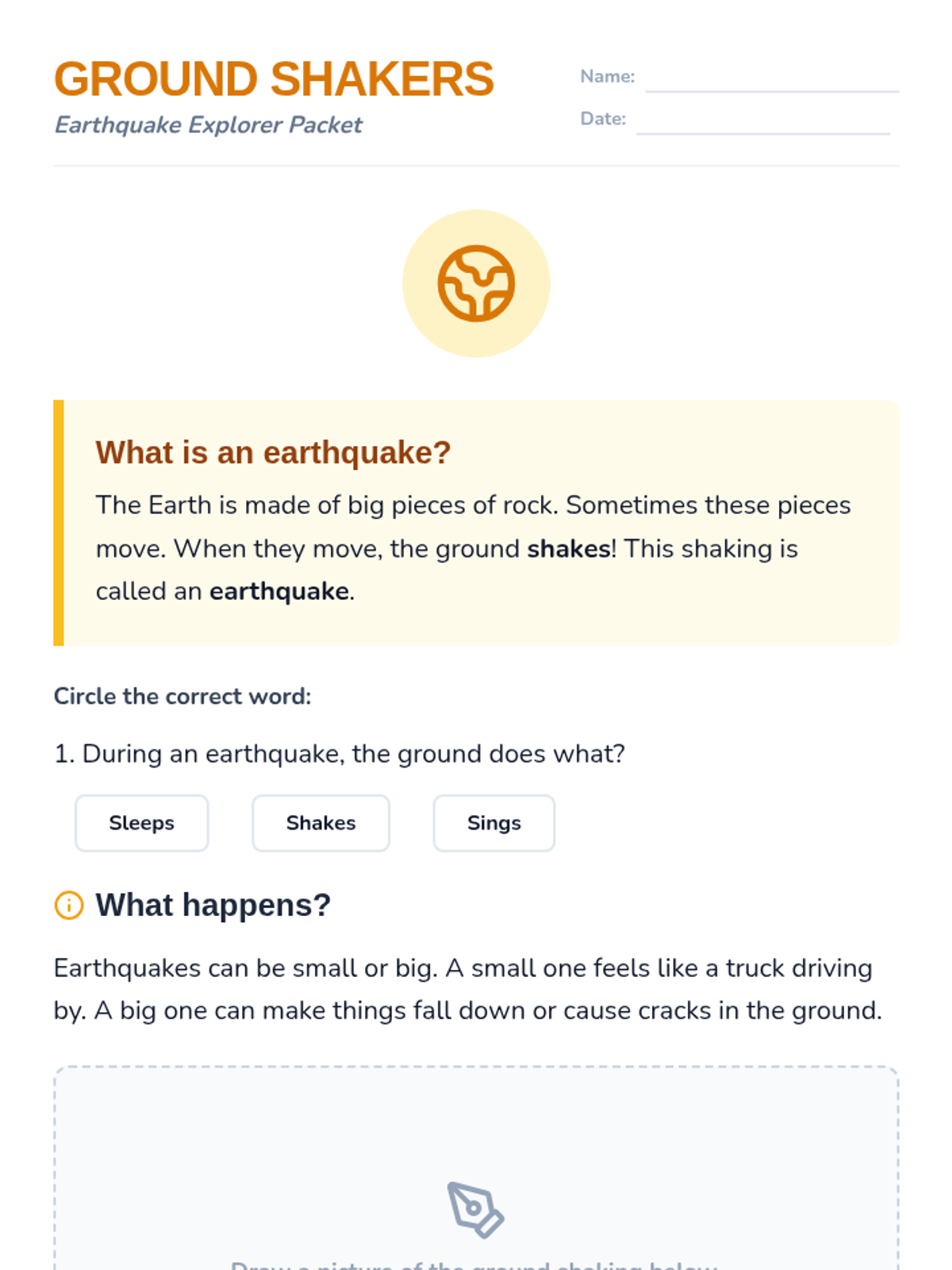 A first-grade science and safety sequence focused on understanding what earthquakes are, why they happen, and how to stay safe during one. It includes a comprehensive student packet, visual slides, and teacher resources.