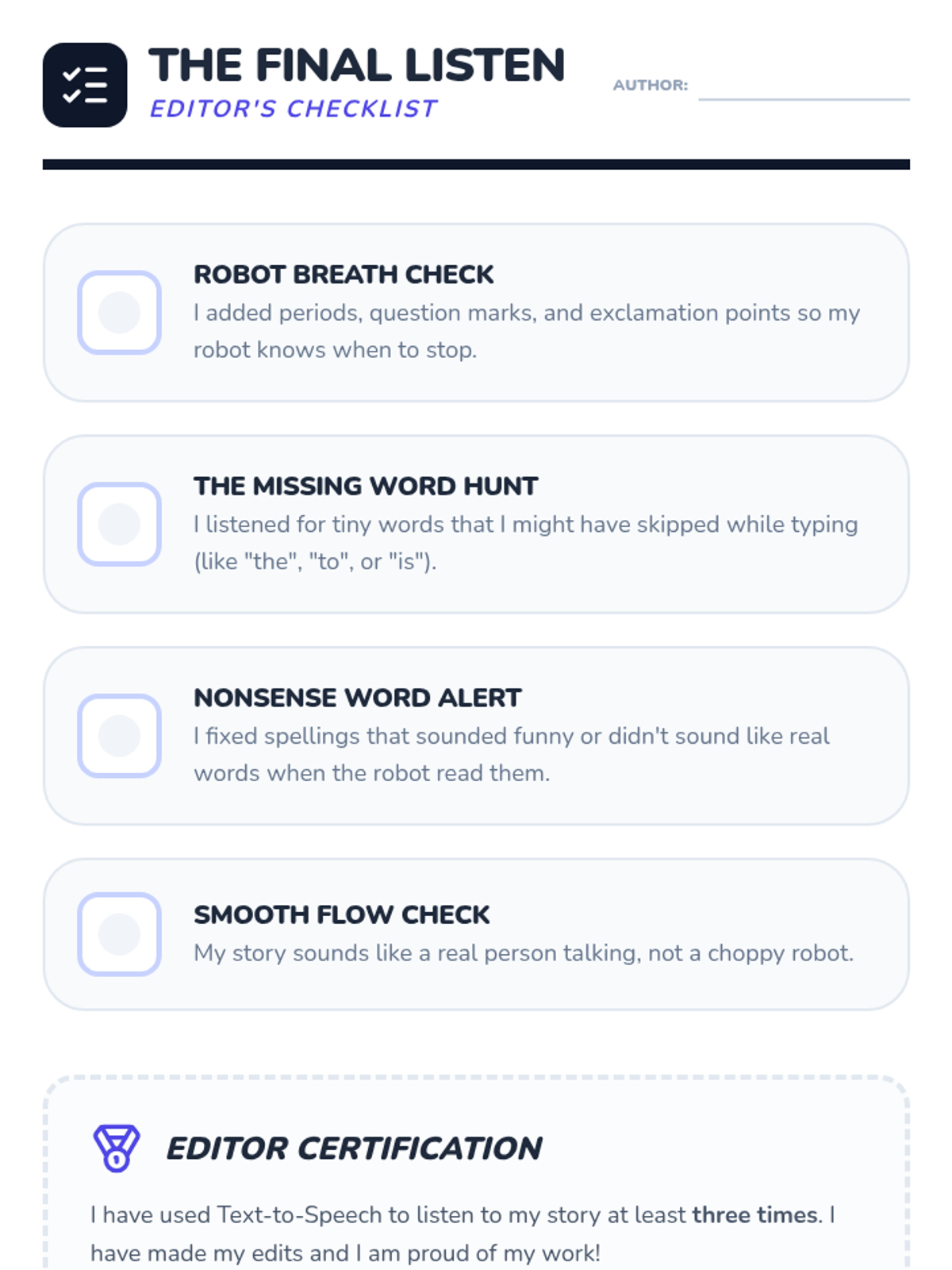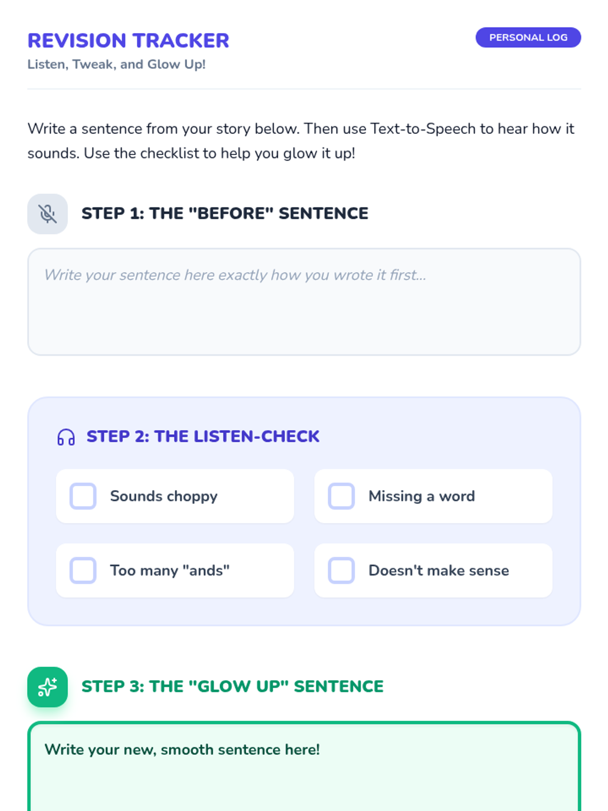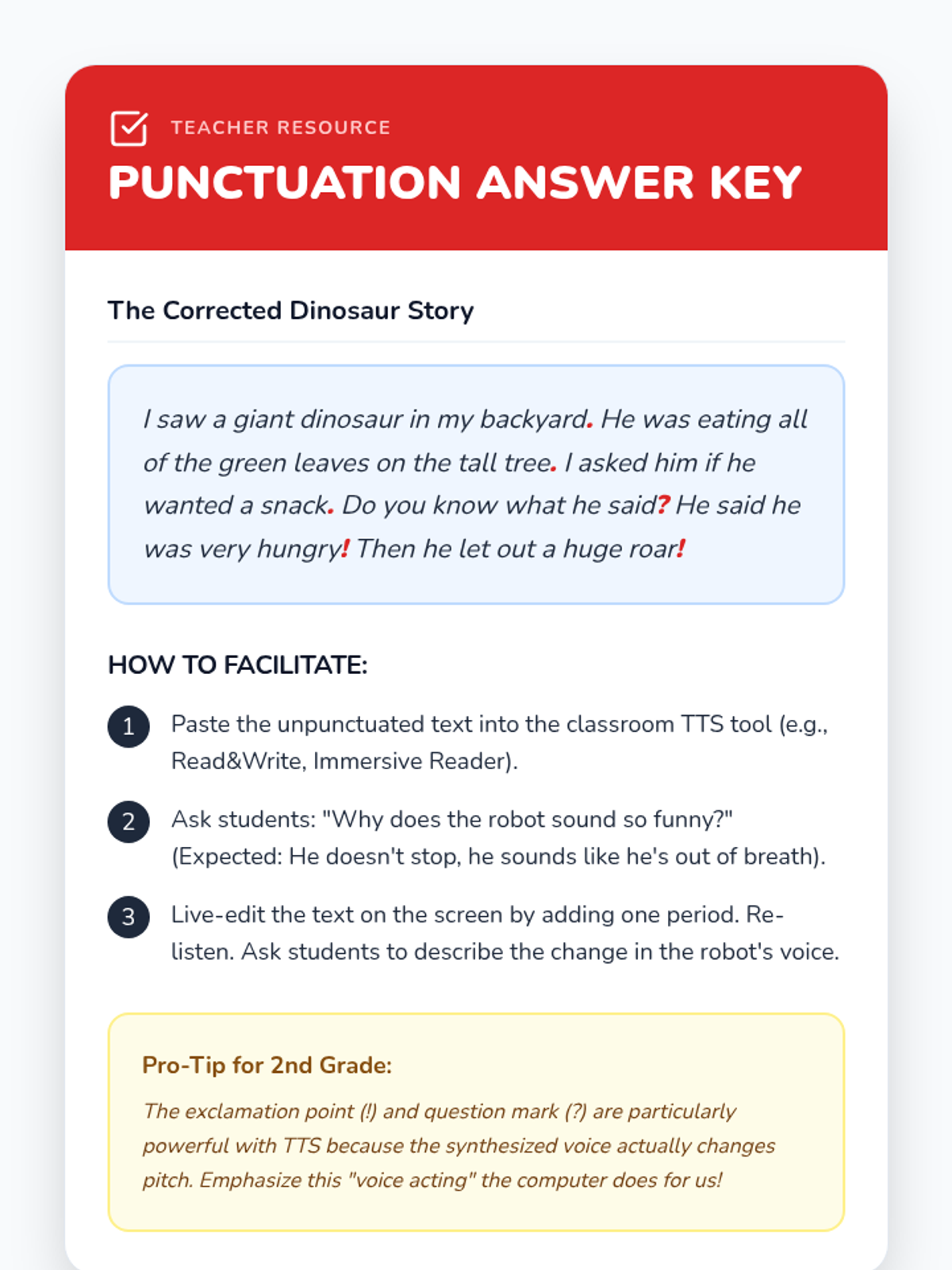 This sequence teaches 2nd-grade students how to use Text-to-Speech (TTS) technology as a powerful editing tool for their writing. Students progress from identifying simple missing words to using TTS for punctuation, fluency, and spelling, culminating in a polished final project.