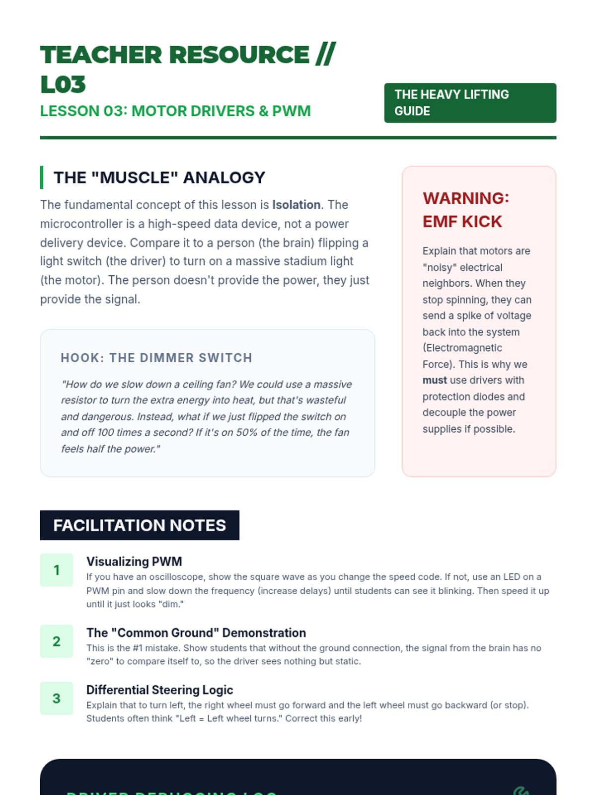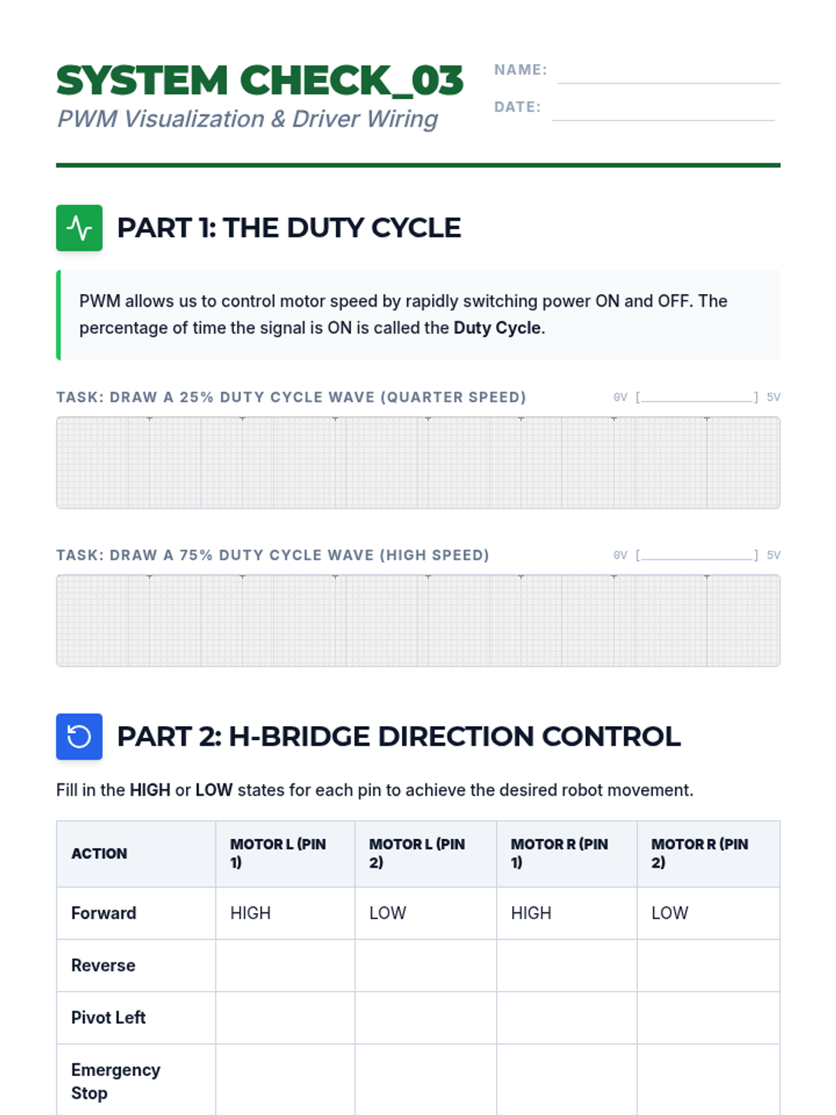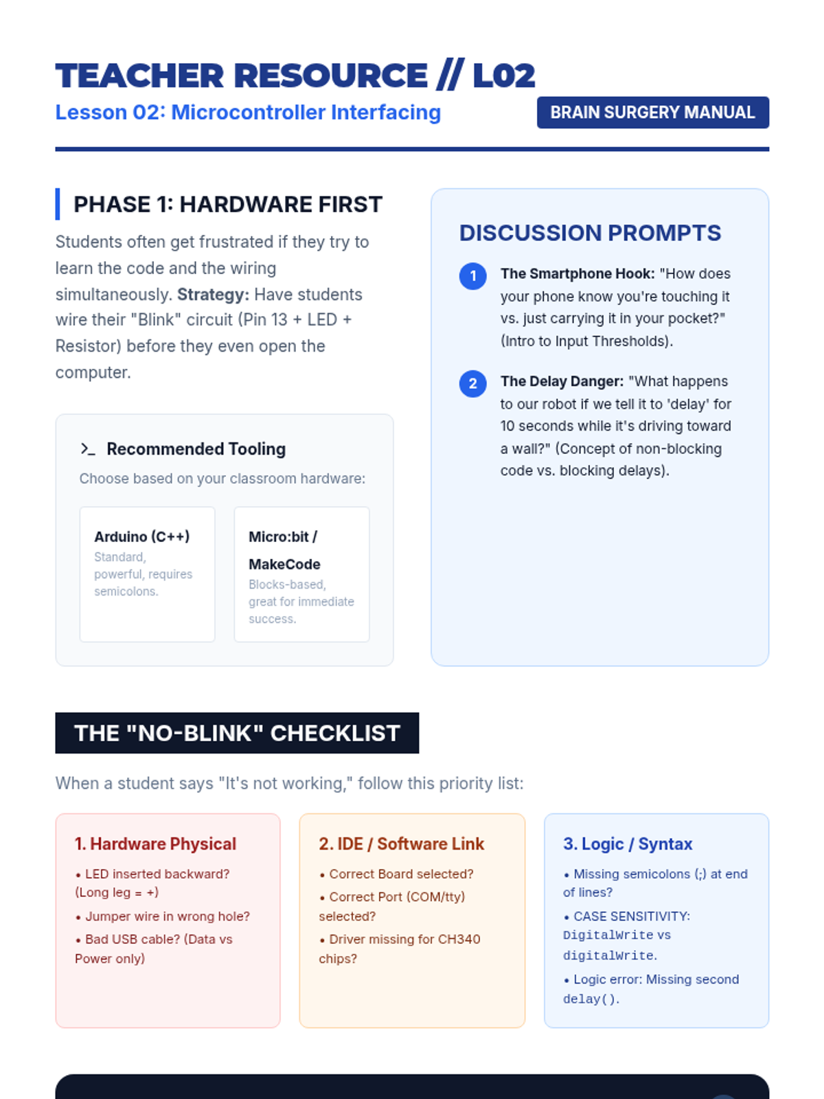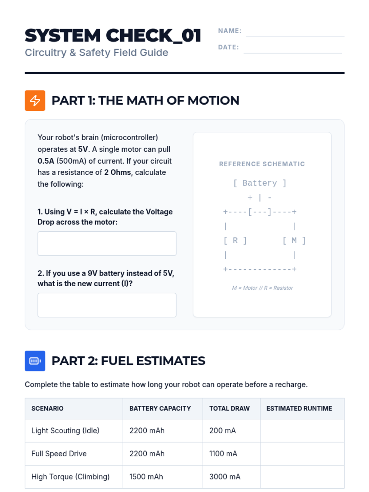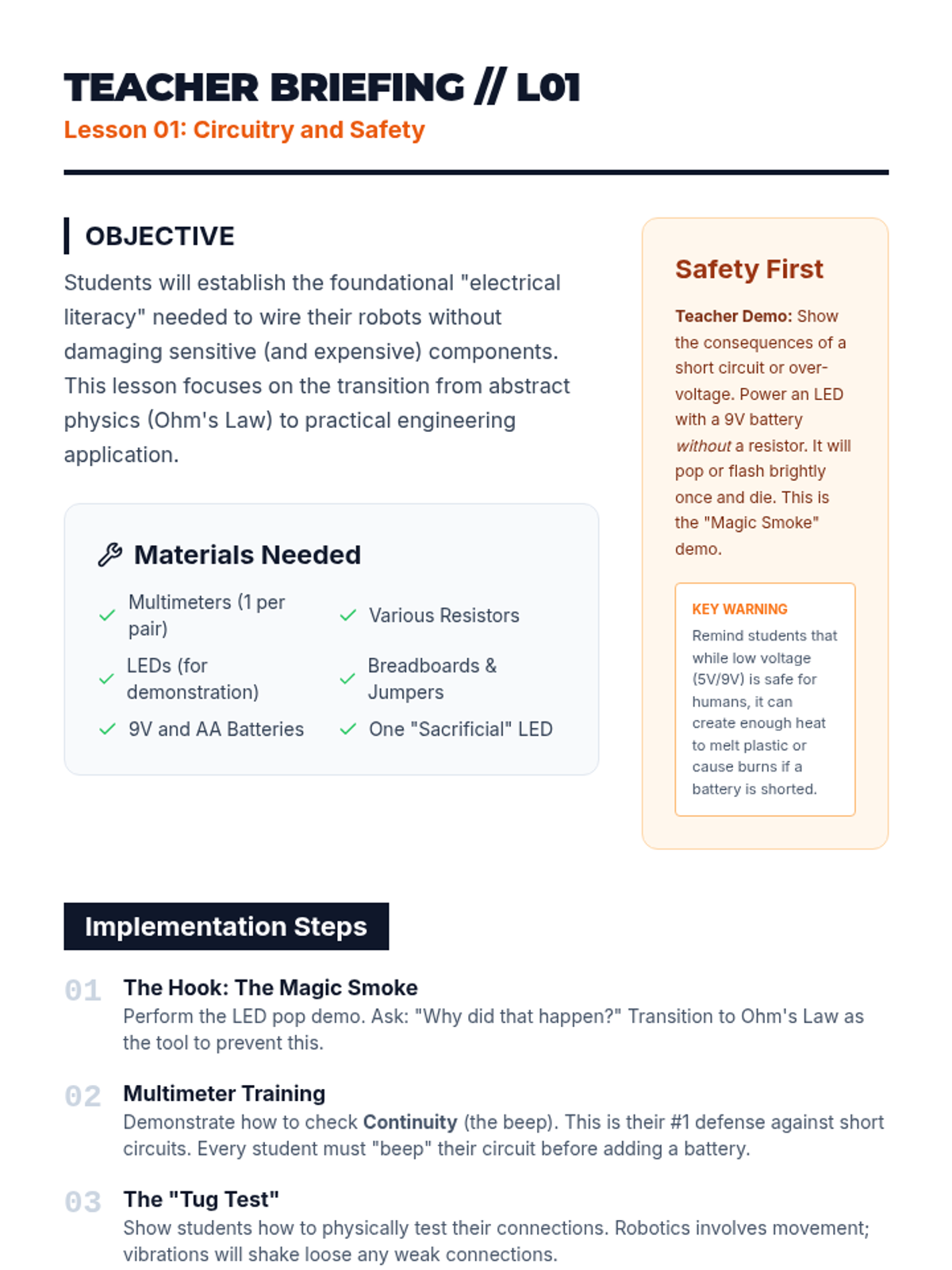 A comprehensive 8th-grade robotics unit focusing on the 'nervous system' of a robot. Students progress from basic circuit theory and safety to microcontroller interfacing, motor control via PWM, and sophisticated power distribution, culminating in a mobile robot capable of programmed movement.