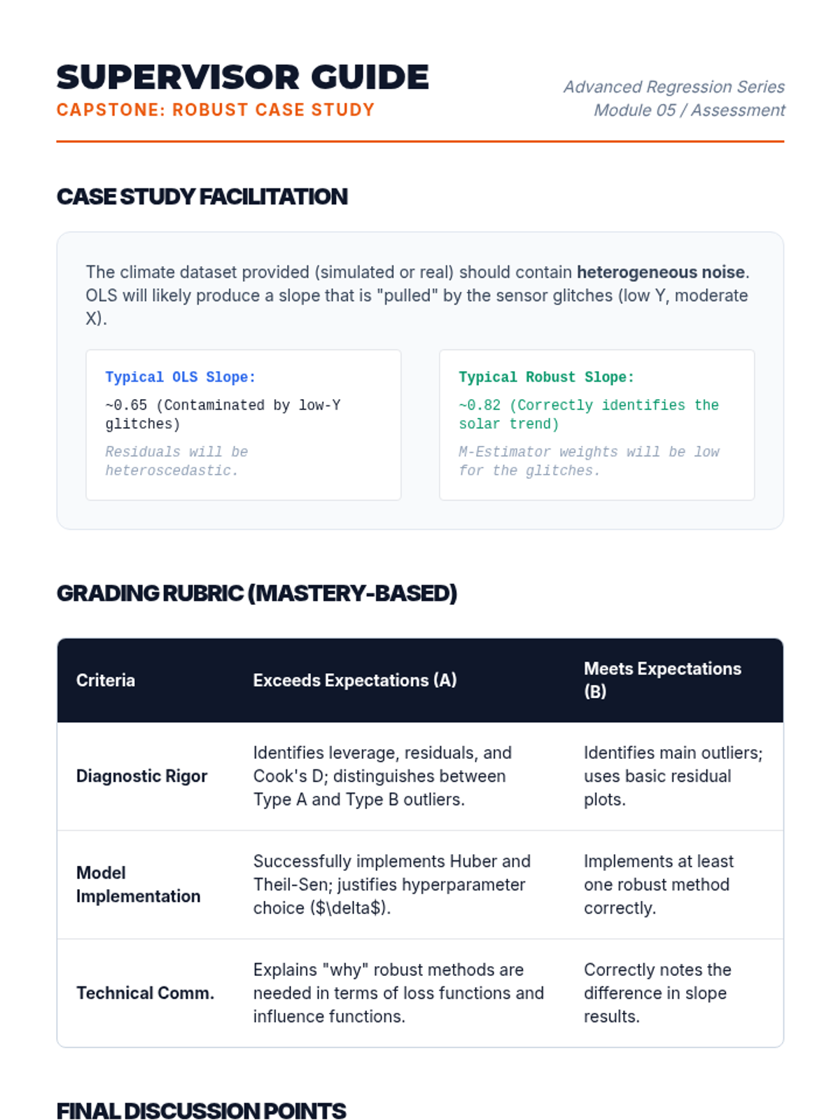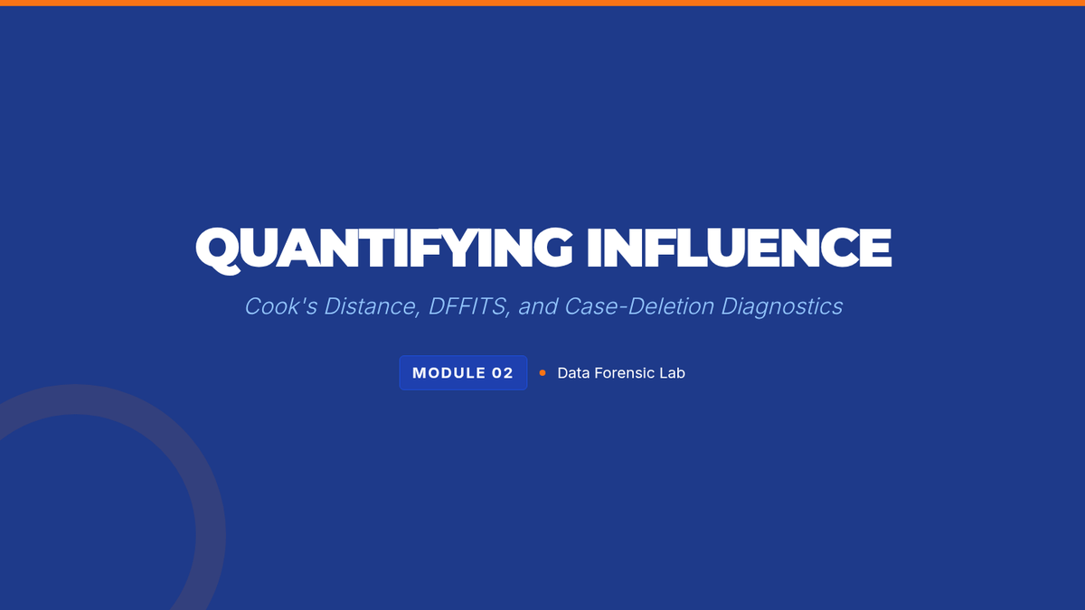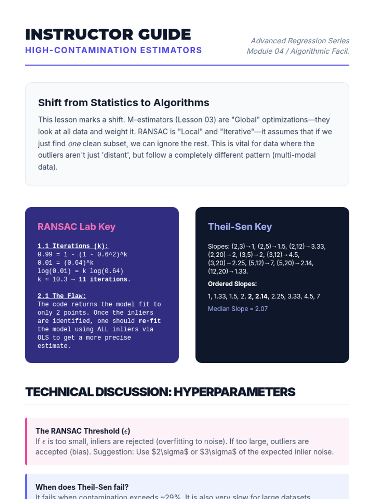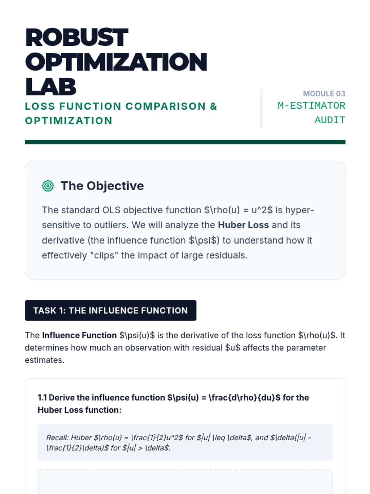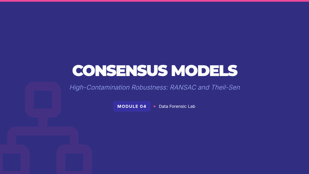 A graduate-level sequence exploring outlier detection, influence diagnostics, and robust regression techniques. Students will progress from identifying anomalies using leverage and Cook's Distance to implementing robust algorithms like RANSAC and M-estimators.