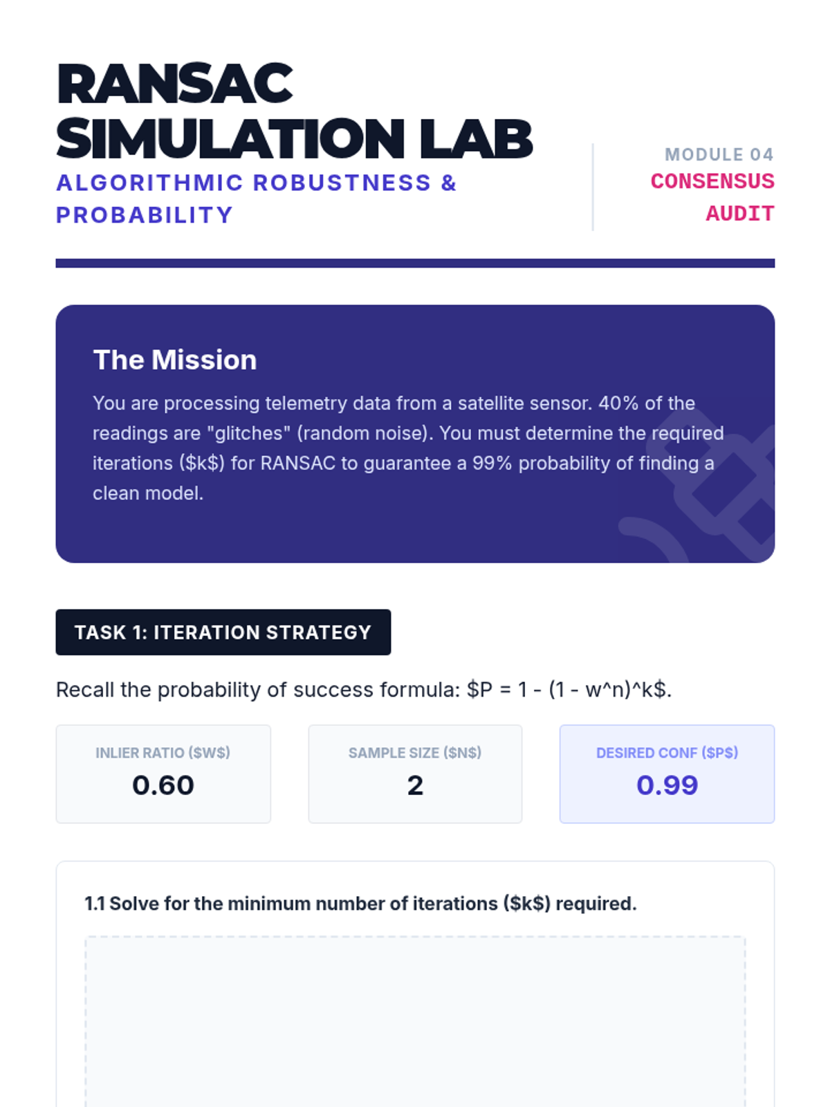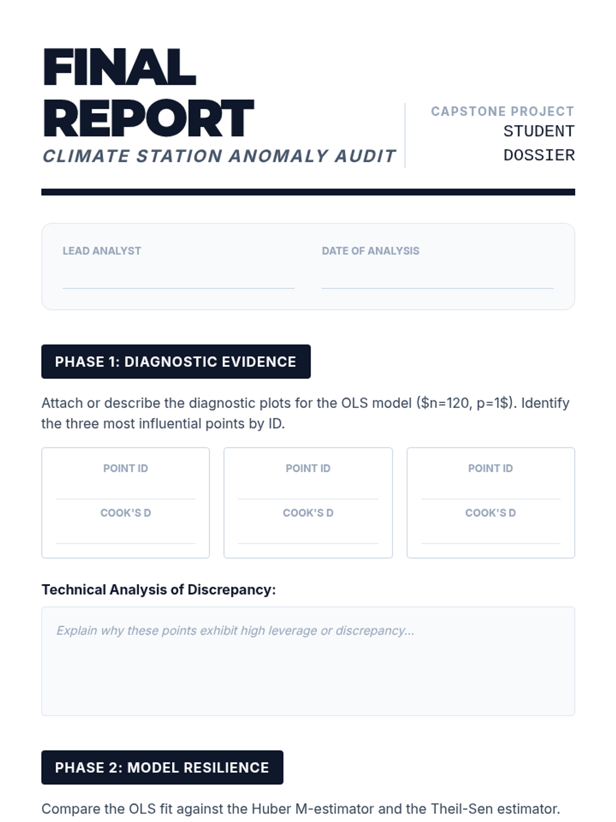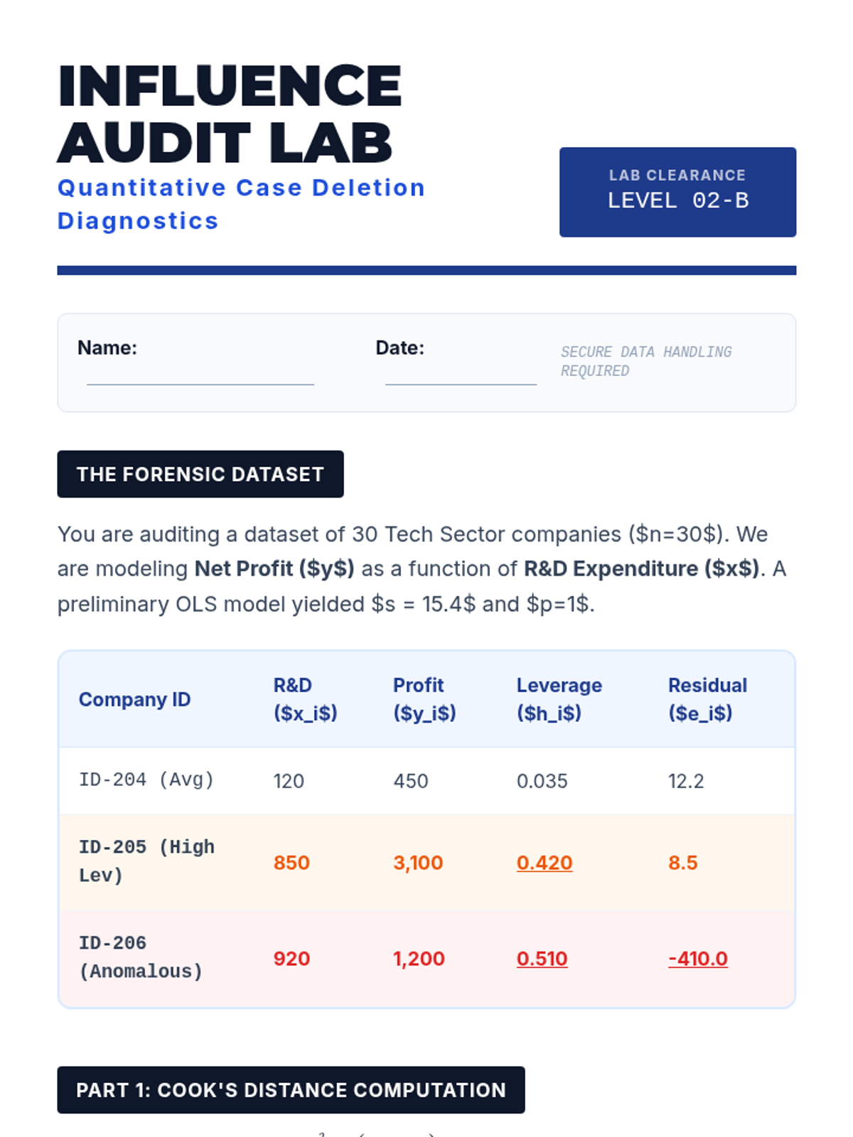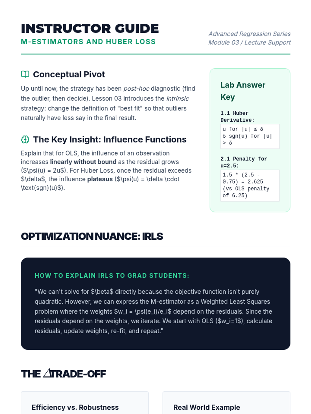 A graduate-level sequence exploring outlier detection, influence diagnostics, and robust regression techniques. Students will progress from identifying anomalies using leverage and Cook's Distance to implementing robust algorithms like RANSAC and M-estimators.