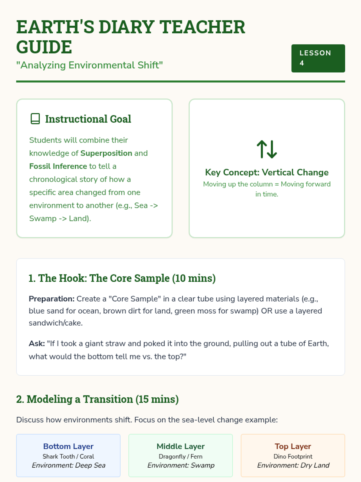 A comprehensive 3rd-grade unit exploring the 4.6 billion-year history of Earth. Students journey from the vast stretches of geologic time through the eras of ancient sea creatures and dinosaurs, investigating the causes of mass extinctions and the eventual rise of mammals and modern adaptations.