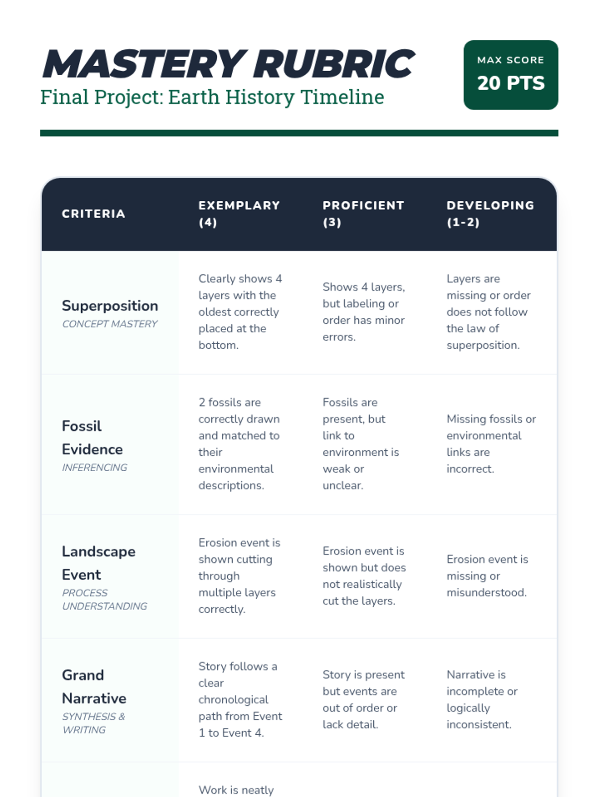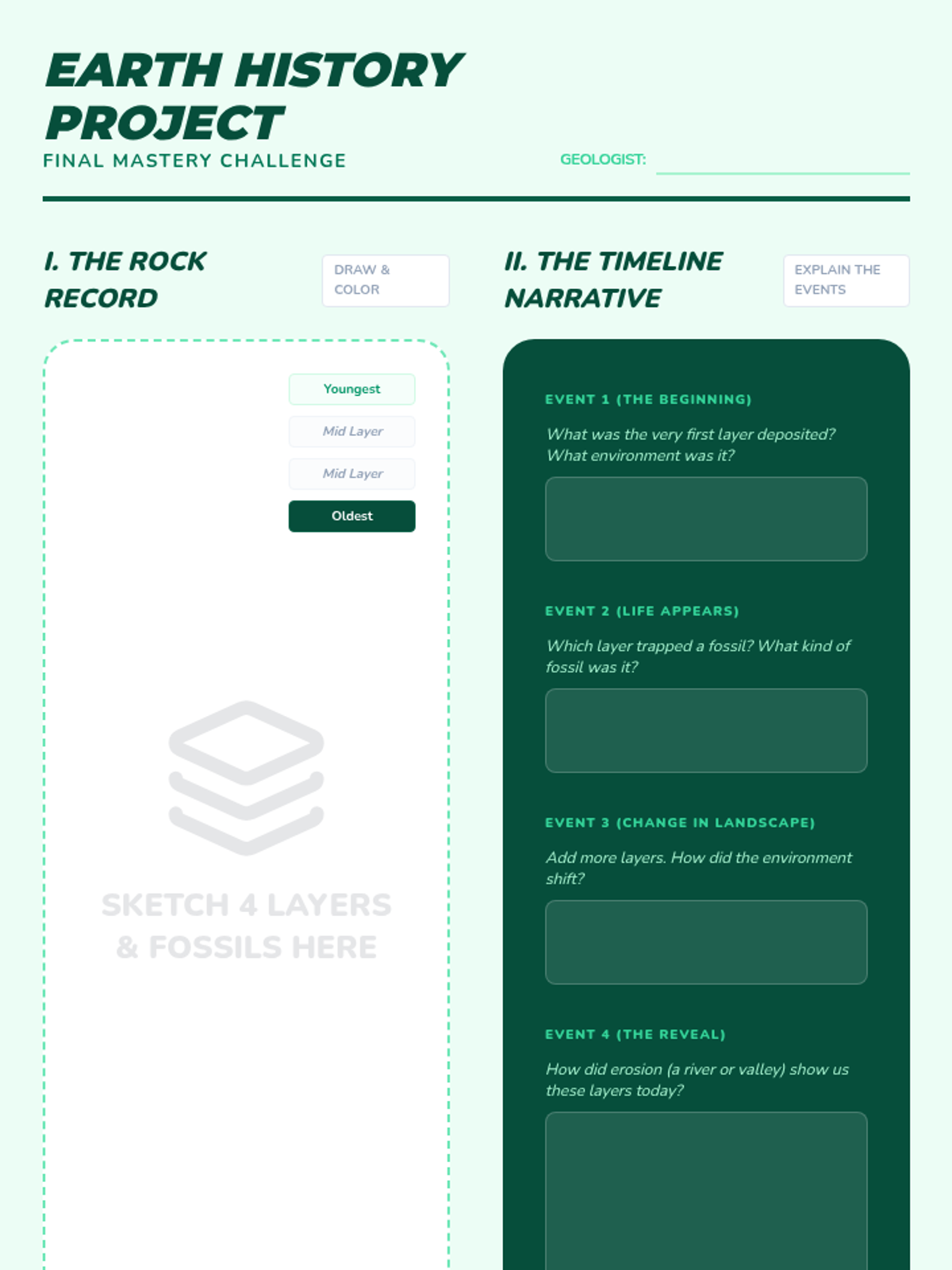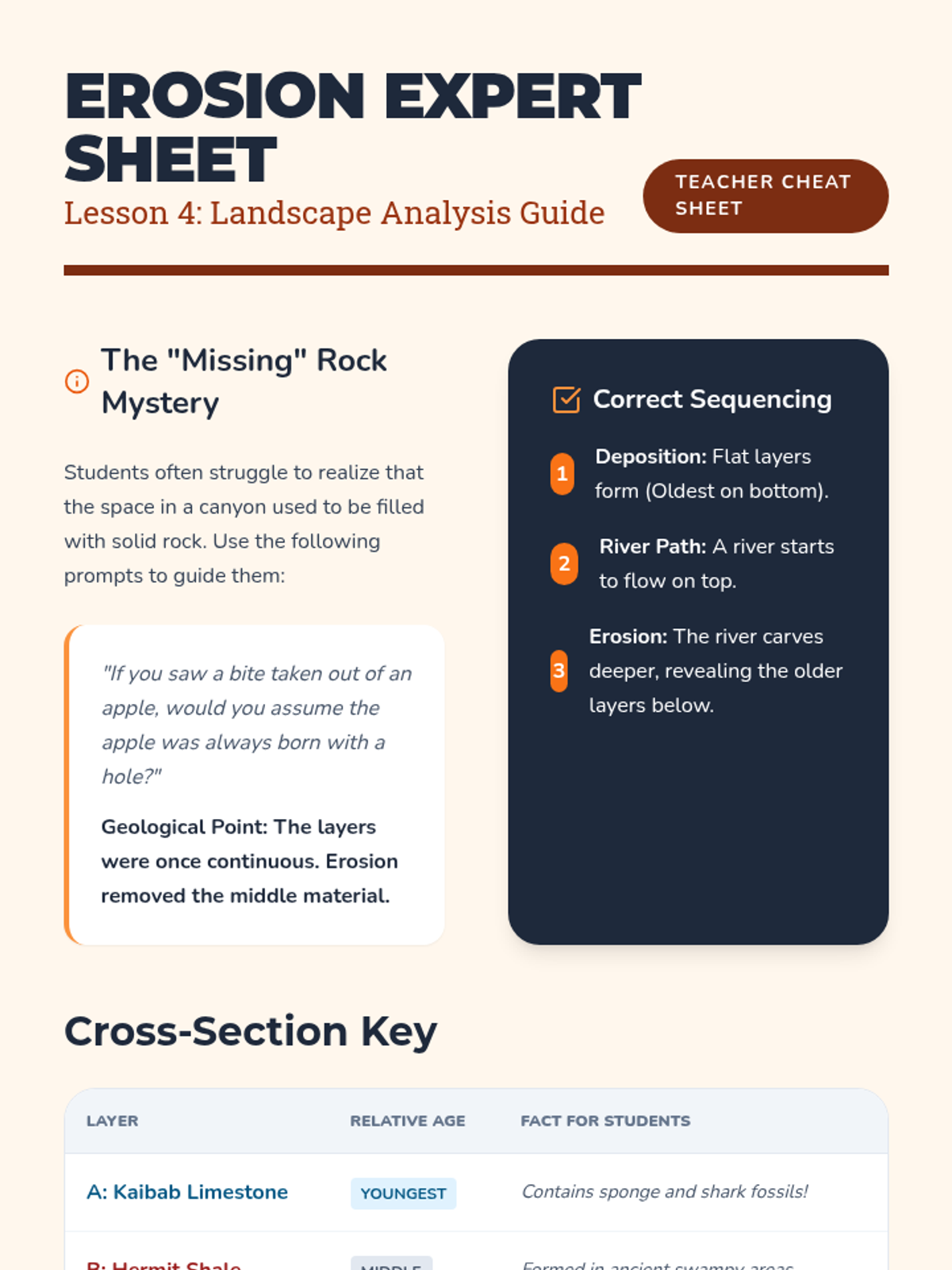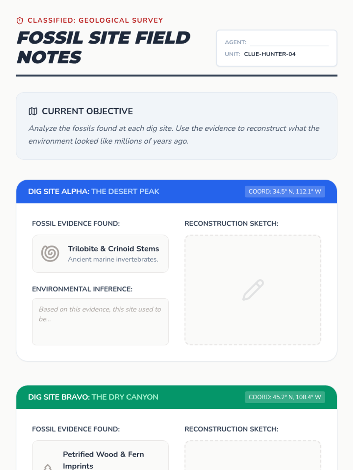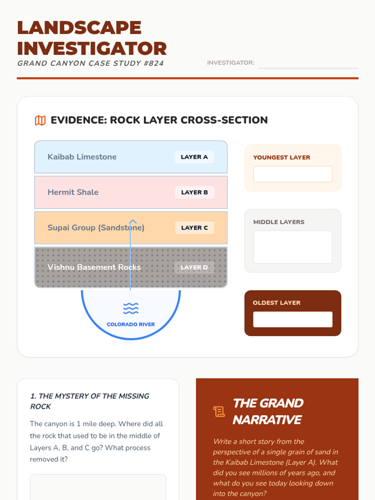 Students become geological detectives, learning to read the Earth's history through rock layers, fossils, and landforms. This sequence covers sedimentation, fossilization, and landscape interpretation to build a comprehensive understanding of geologic time.