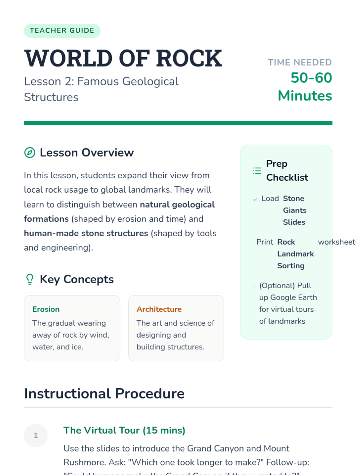 A project-based unit where 2nd-grade students explore the properties of rocks, their uses in human engineering, and famous geological landmarks, culminating in a structural design project.