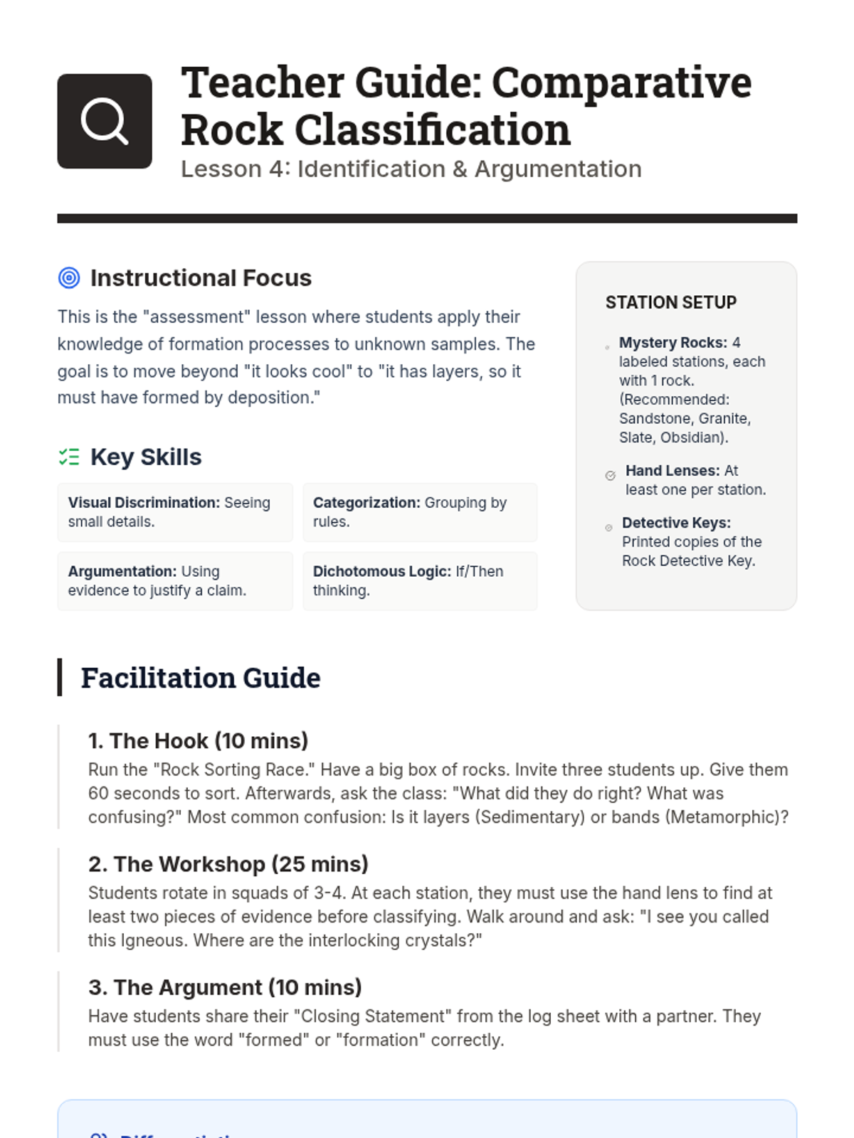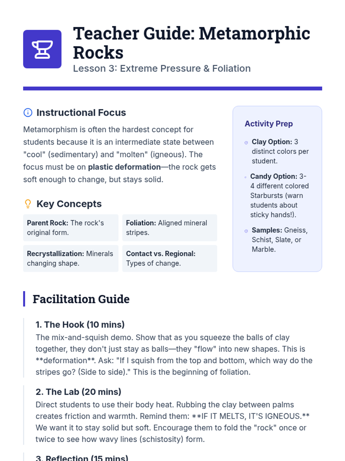A hands-on workshop sequence where 4th-grade students explore the three main rock types—igneous, sedimentary, and metamorphic—through modeling and comparative analysis to understand how formation processes shape physical characteristics.