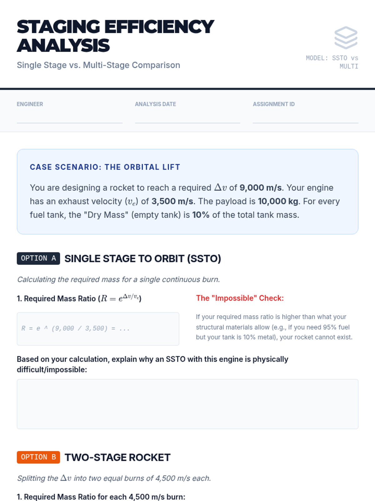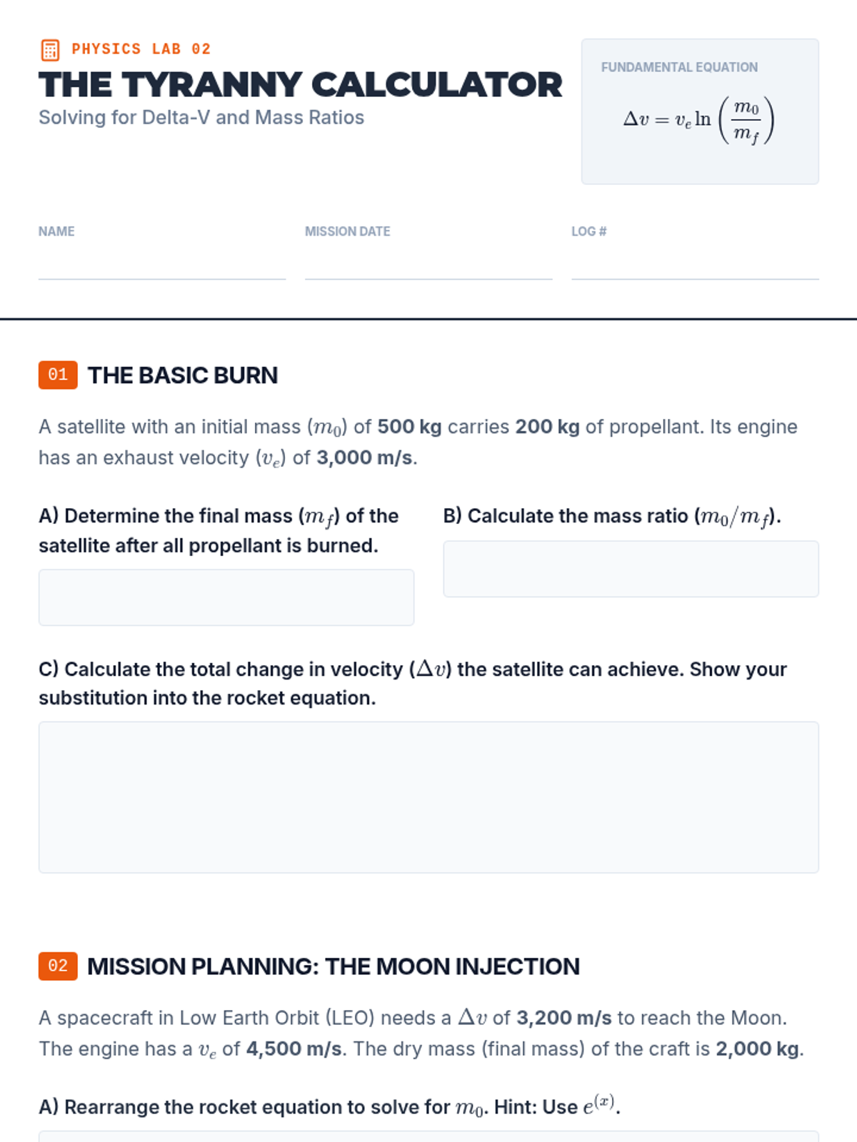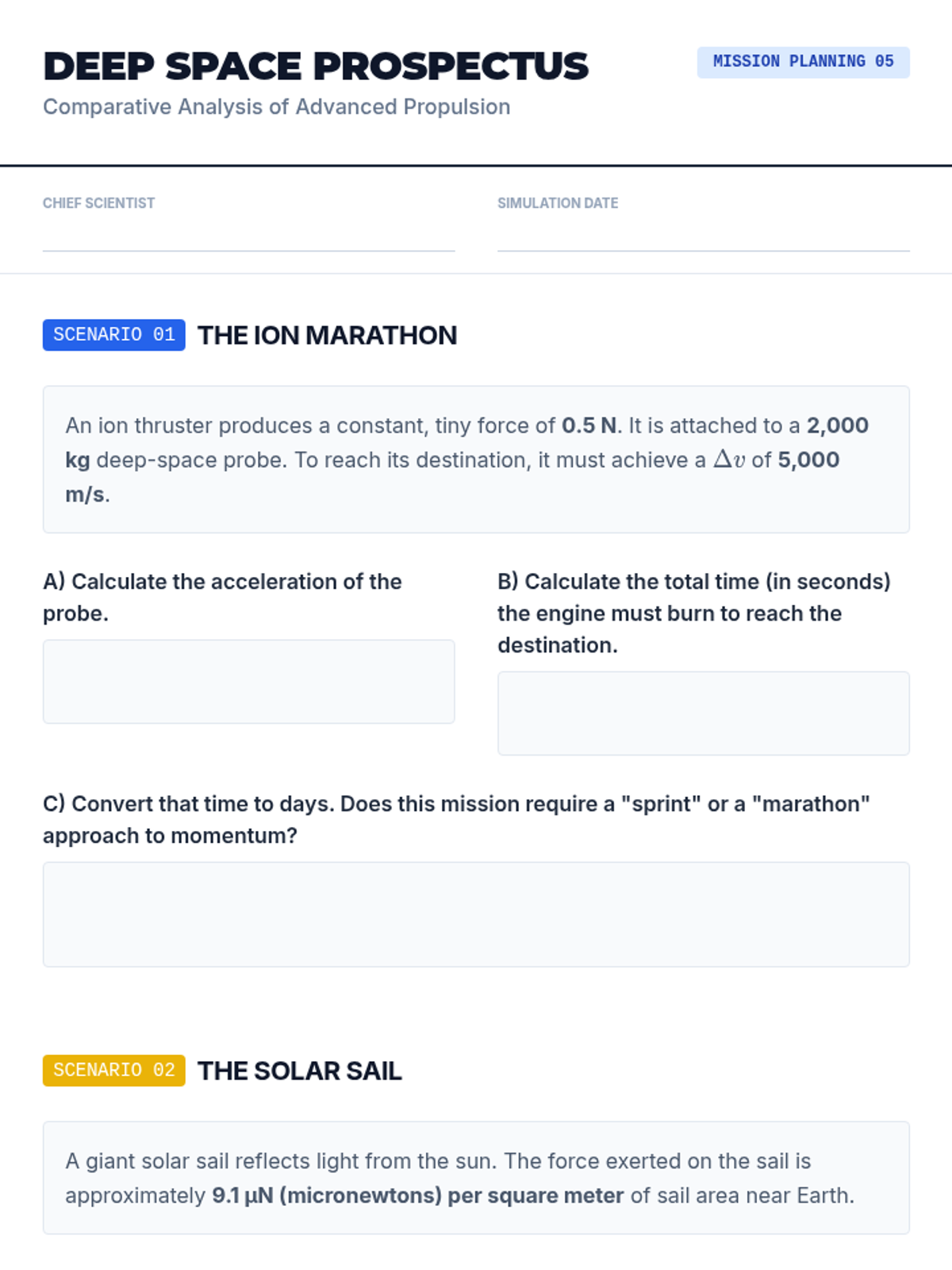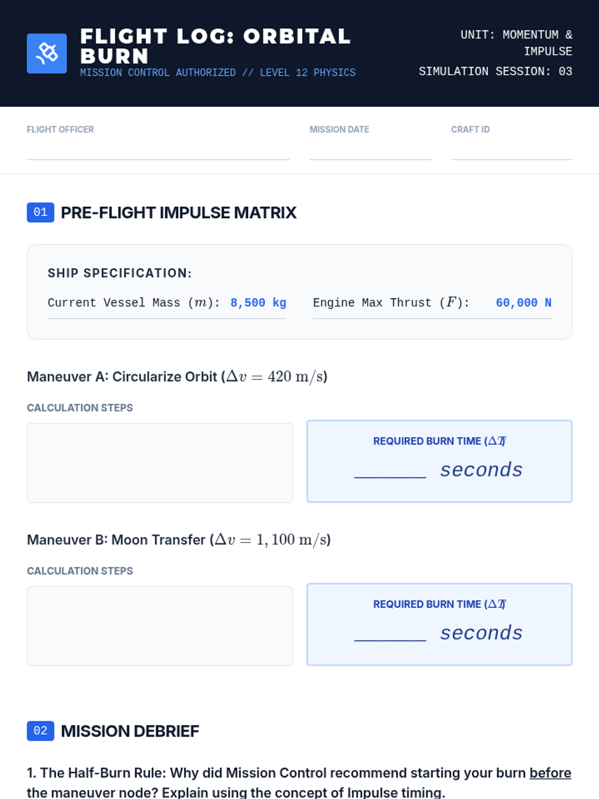 A high-school physics sequence for 12th graders exploring momentum and impulse through the lens of rocketry and variable mass systems. Students progress from simple recoil to the complexities of the rocket equation and orbital maneuvers.