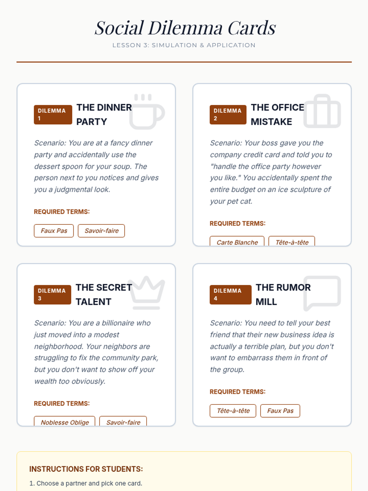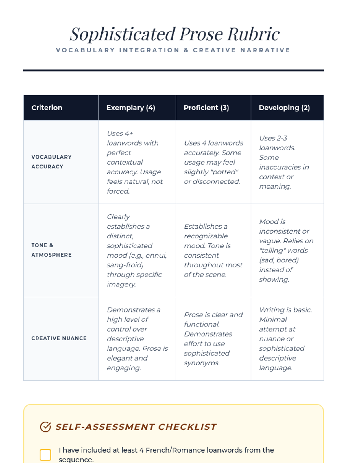 A high school ELA sequence exploring French loanwords and their impact on tone, mood, and sophistication. Students analyze historical, cultural, and literary contexts to expand their descriptive vocabulary.