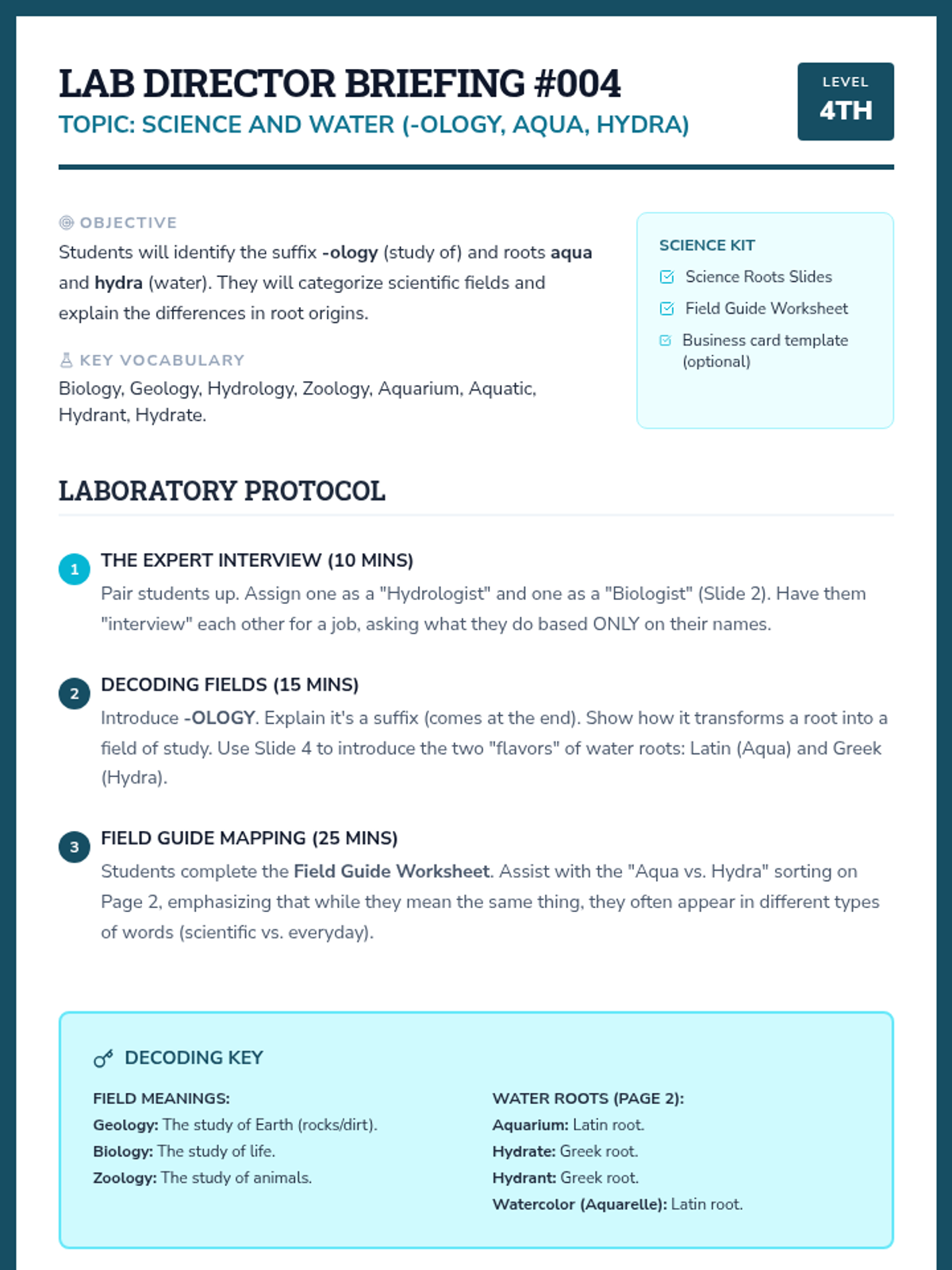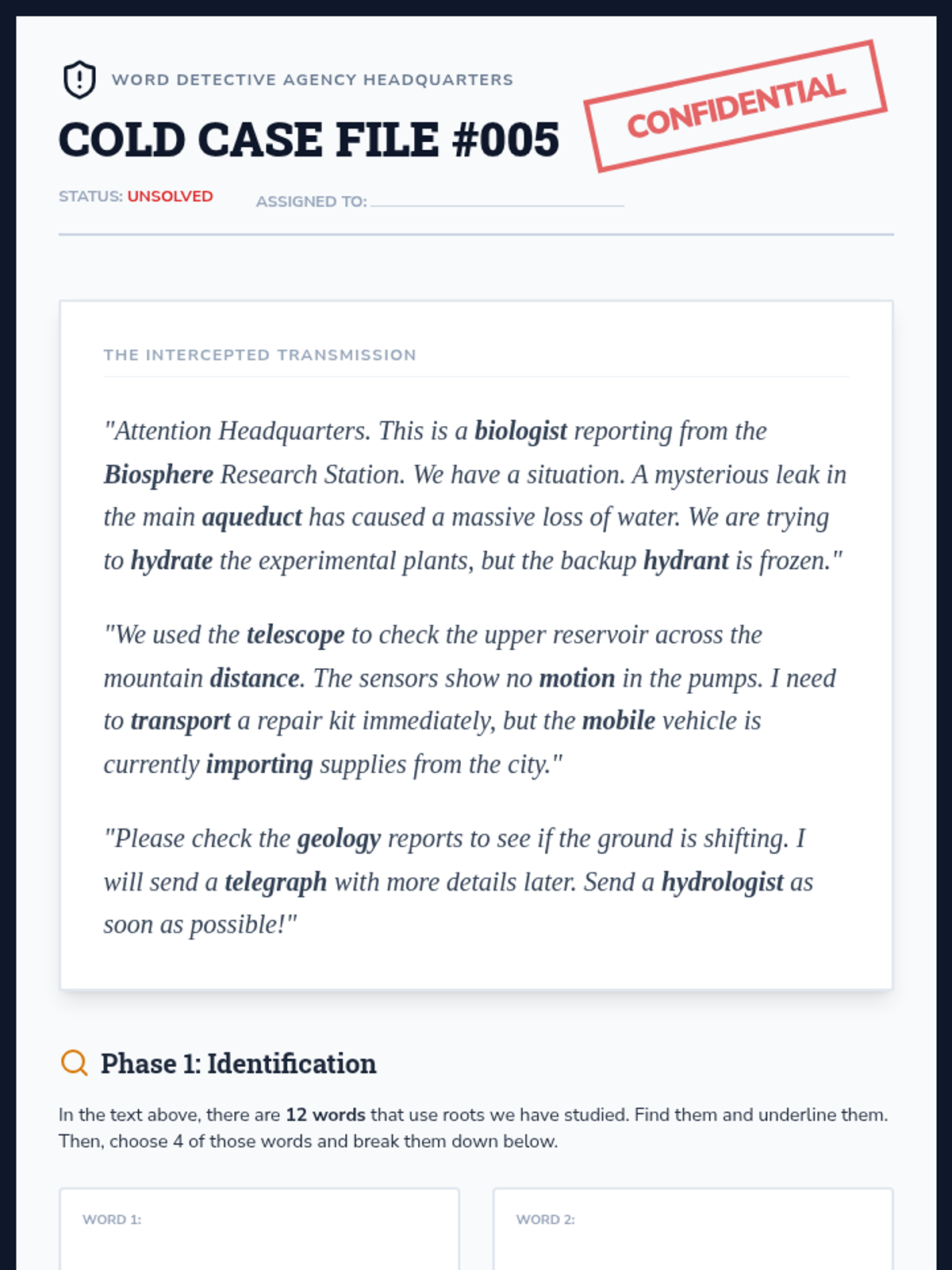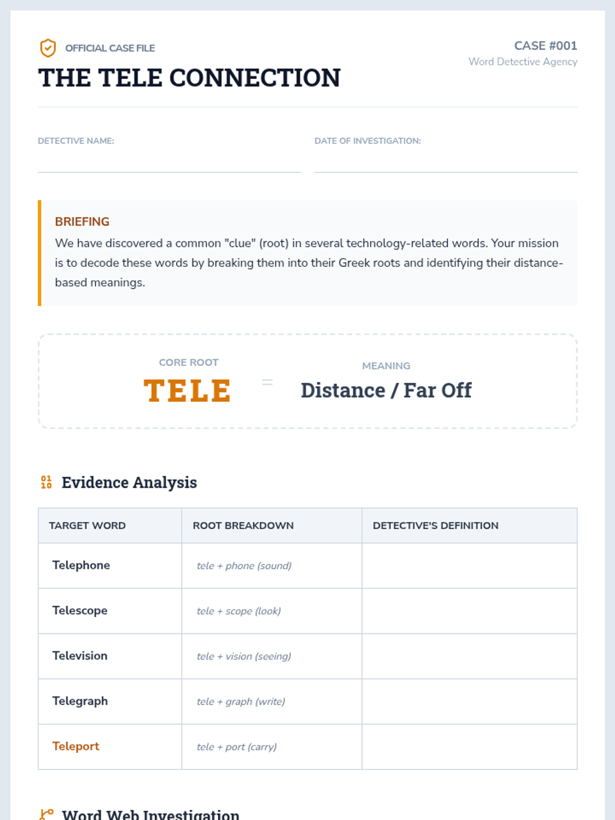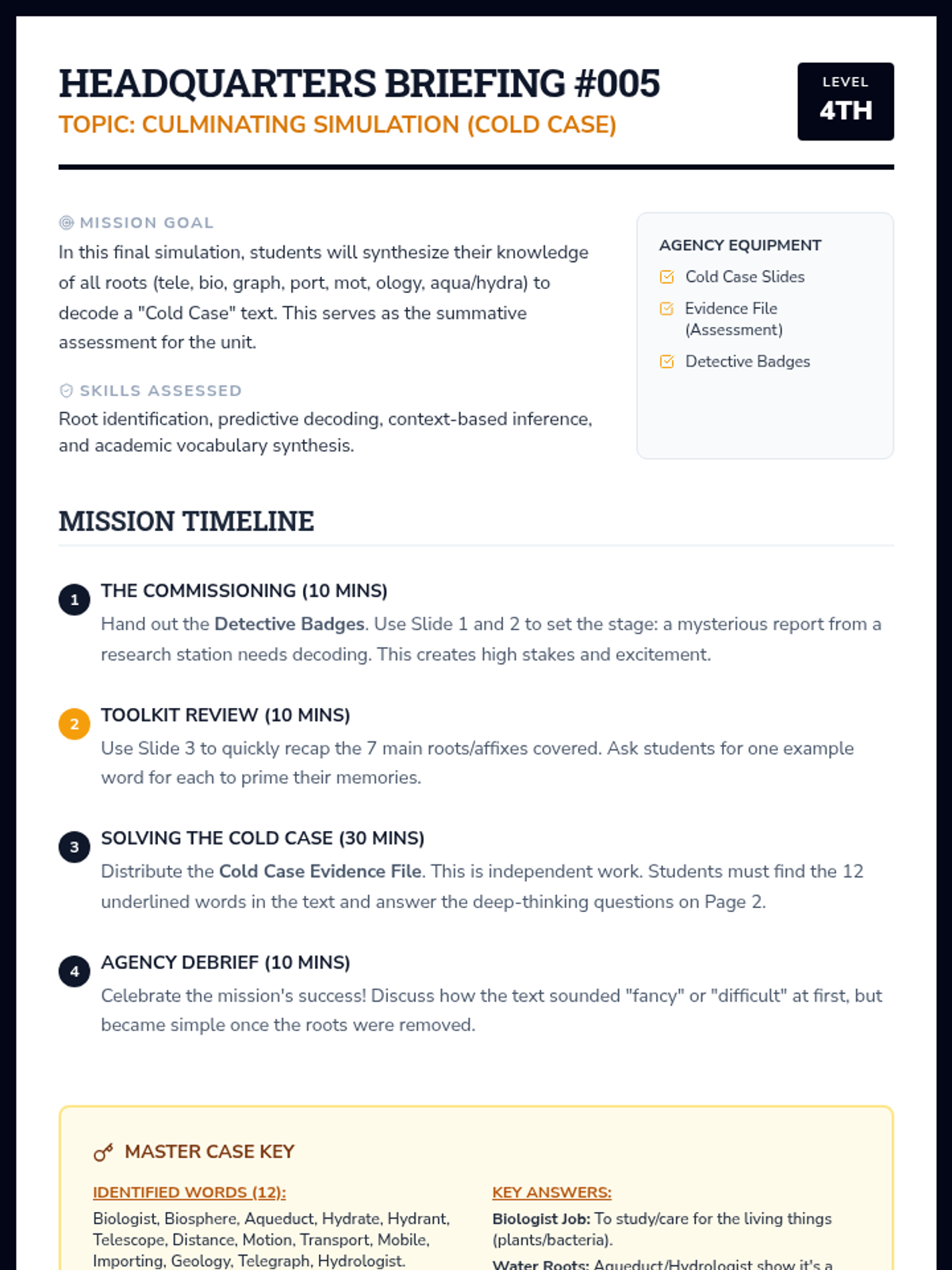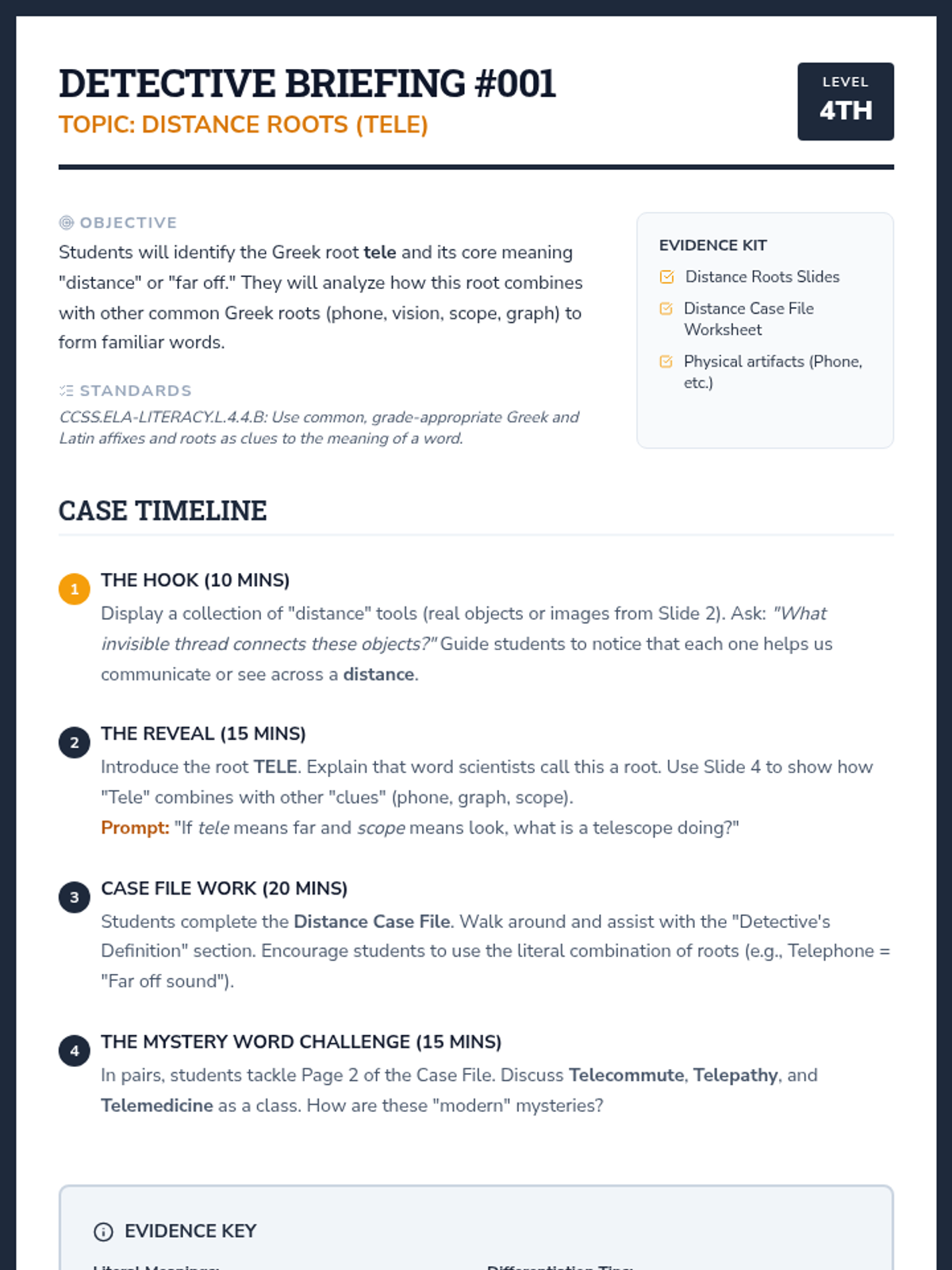 A 5-lesson unit where 4th-grade students become 'Word Detectives' to decode complex English vocabulary using Greek and Latin roots and affixes. Students investigate distance, life, writing, movement, and scientific roots through simulations and inquiry-based activities.