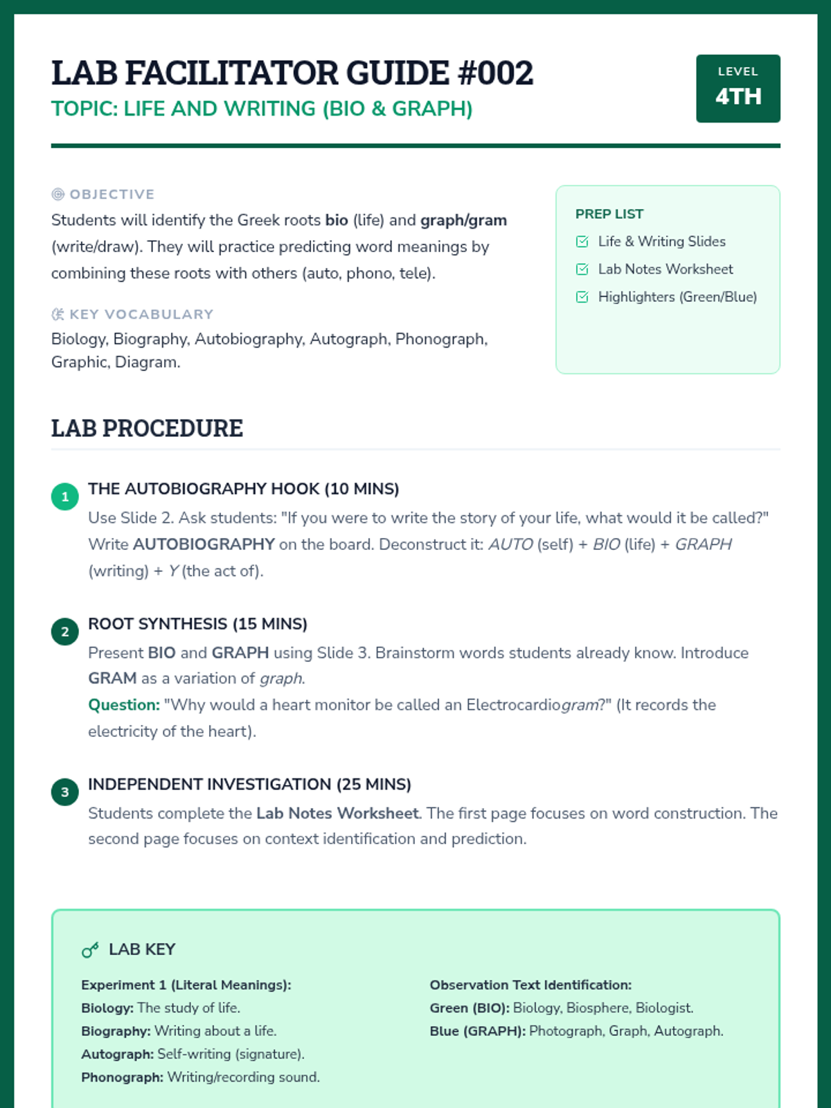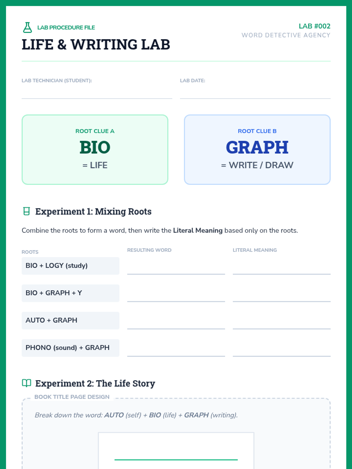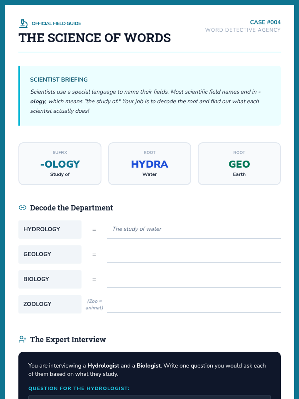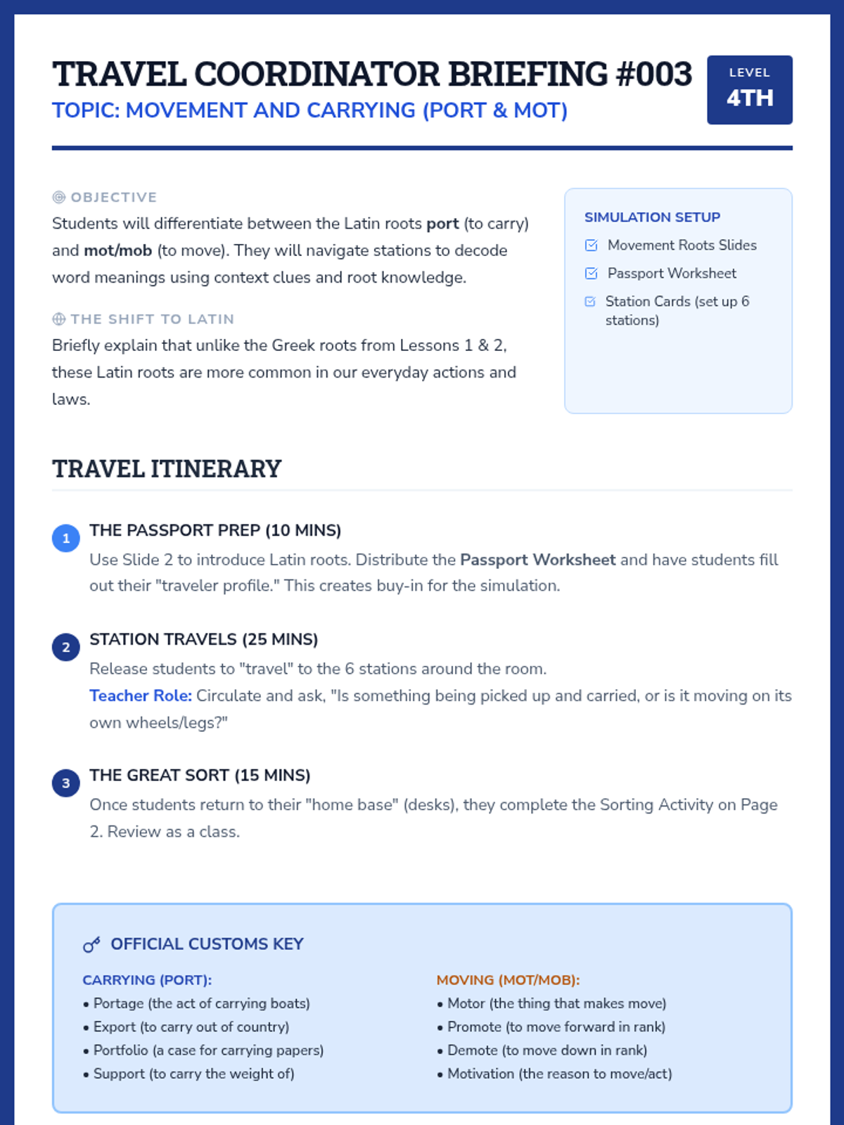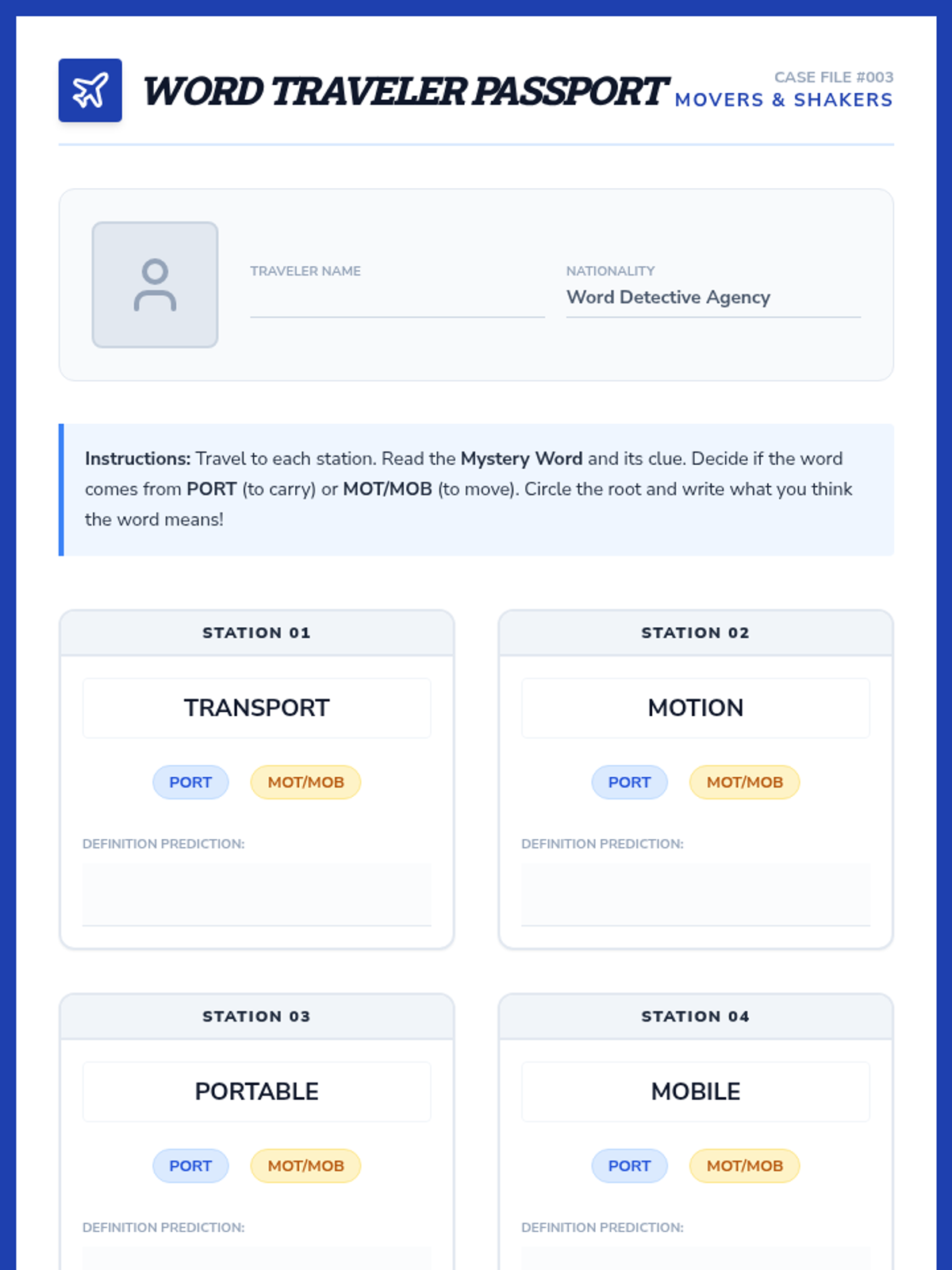 A 5-lesson unit where 4th-grade students become 'Word Detectives' to decode complex English vocabulary using Greek and Latin roots and affixes. Students investigate distance, life, writing, movement, and scientific roots through simulations and inquiry-based activities.
